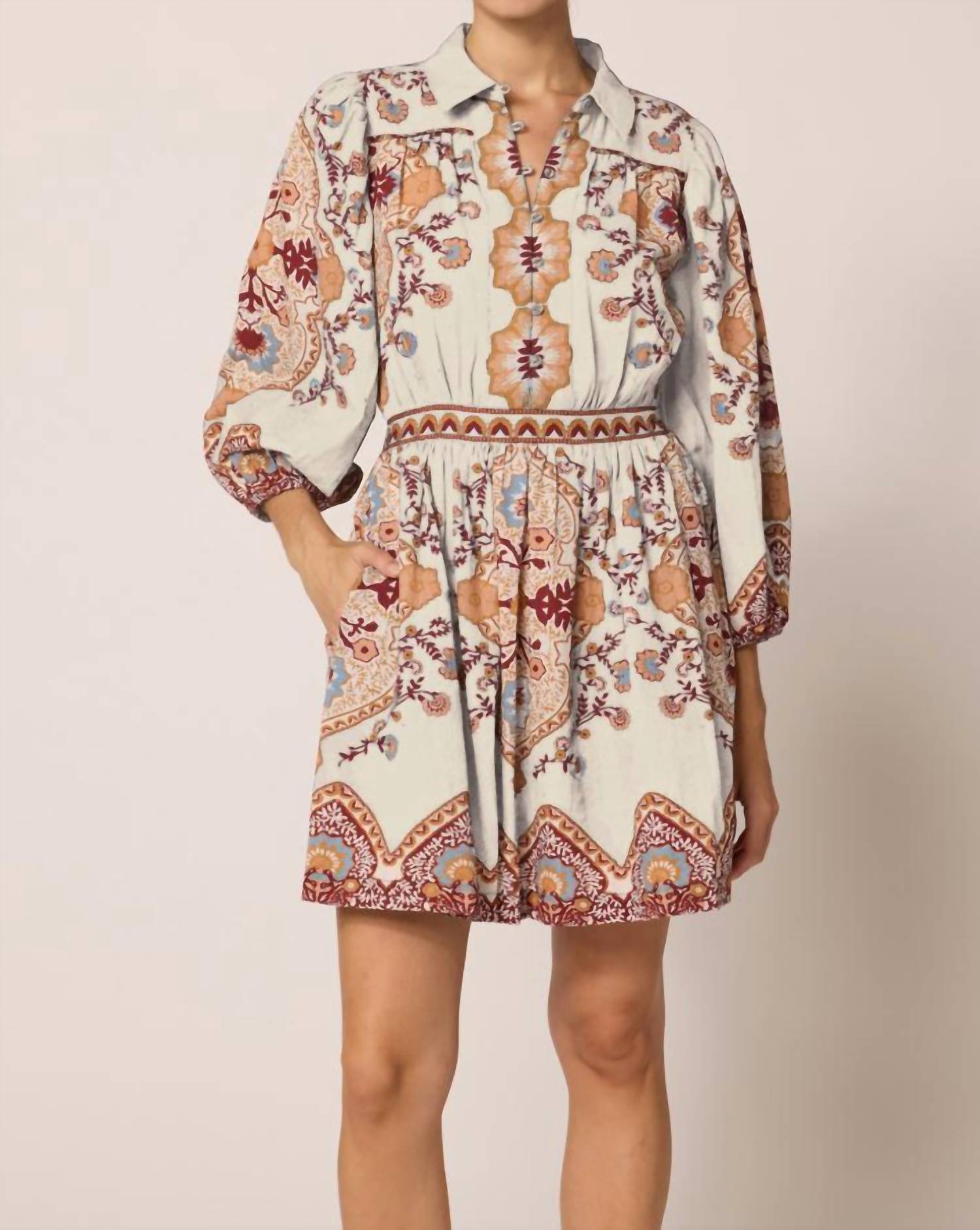 Cute and comfortable, this long sleeve dress has it all. The Women's Leigh Mini Dress by Cleobella is a stylish and ethically handmade piece from India, perfect for a summer vacation. This dress is crafted from a cotton linen blend, featuring a high neckline and long sleeves with elasticized openings, adorned with intricately placed floral prints. With a half-button down center front placket featuring shell buttons, it boasts an encased elastic back waistband for a comfortable fit, complemented by an invisible zipper at the side seam. Orange details include piping on the yoke and a shirred skirt, adding to its chic, bra-friendly design.