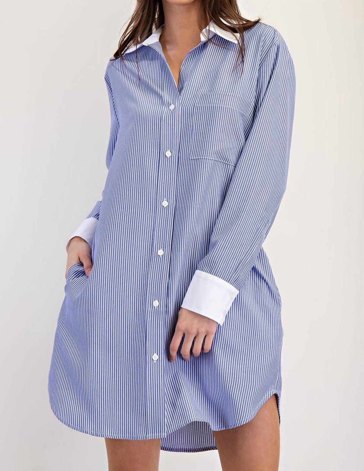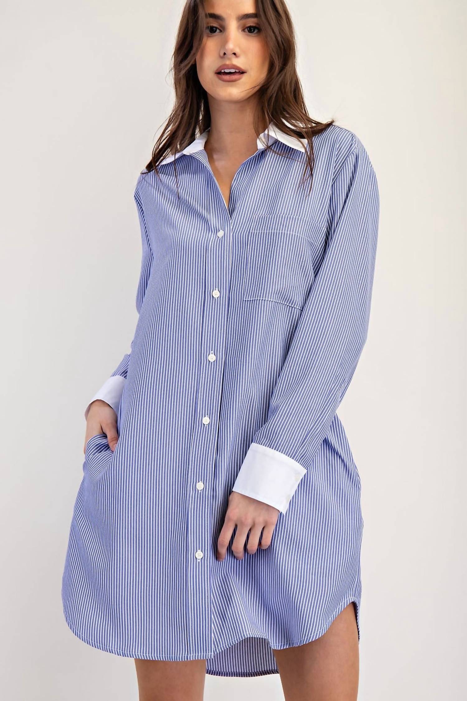A flattering yet comfortable dress you'll be reaching for season after season. Elevate your wardrobe with the Work to Play Striped Dress by ee:some, perfect for a seamless transition from work to evening events. This blue dress features a classic shirt silhouette with a flattering V-neck, button closure, and long sleeves for a touch of sophistication. Crafted from 100% Polyester, it boasts stylish stripes and practical pockets that we adore. Ideal for fall, this versatile piece ensures you look chic and put-together for any occasion.