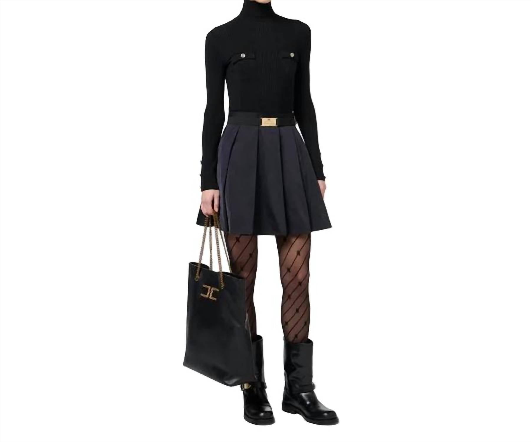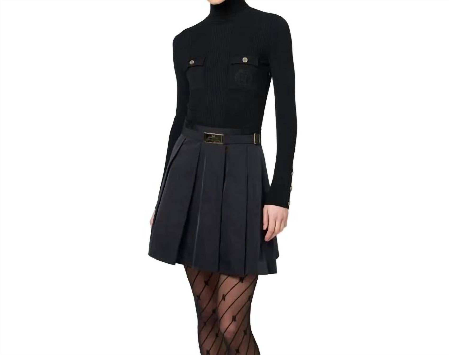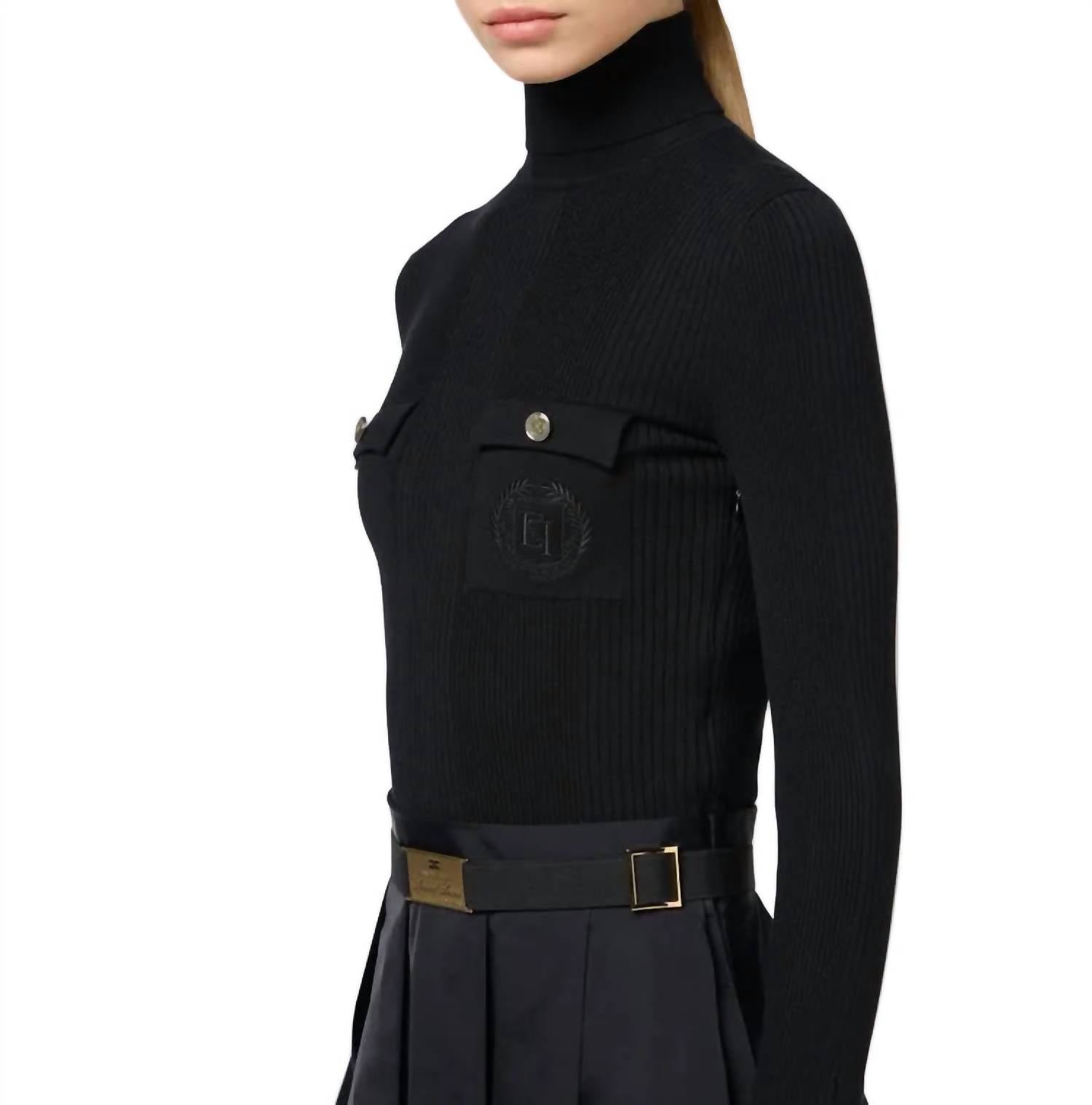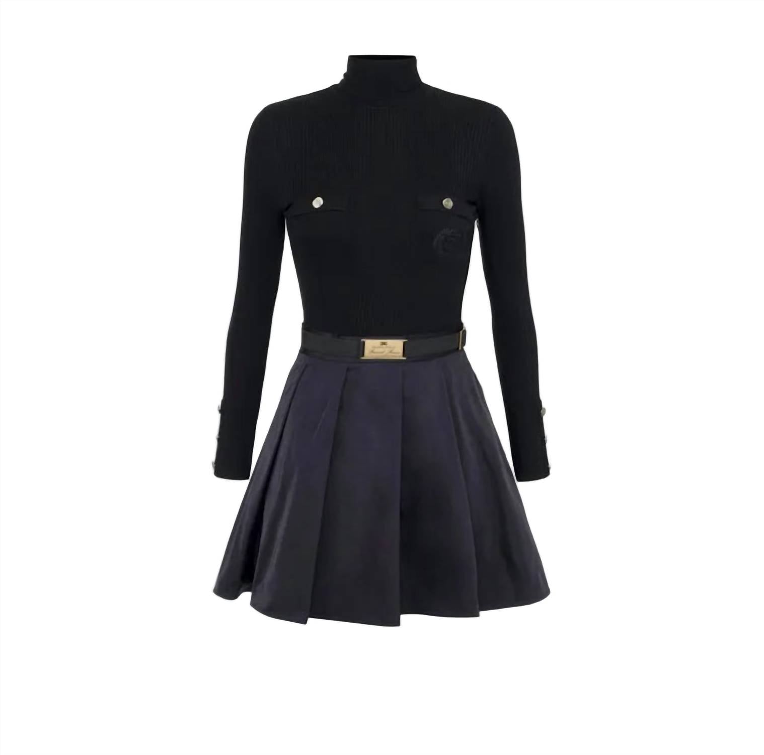 A flattering yet comfortable dress you'll be reaching for season after season. The Logo Embroidered Dress by Elisabetta Franchi is an elegant choice for any evening event. With its long sleeves and high collar, this A-line dress boasts a sophisticated silhouette in solid NERO with practical pockets adorned by logo embroidery and golden metal buttons. Crafted from a luxurious composition of 64% Lyocell, 20% Polyamide, and 16% Silk, the dress features a removable elastic belt highlighted by a golden metal buckle over a nylon pleated skirt. Closure: Button closure. This minimalist design is perfect for a chic, understated look that's ideal for fall fashion and special occasions like Valentine’s Day.