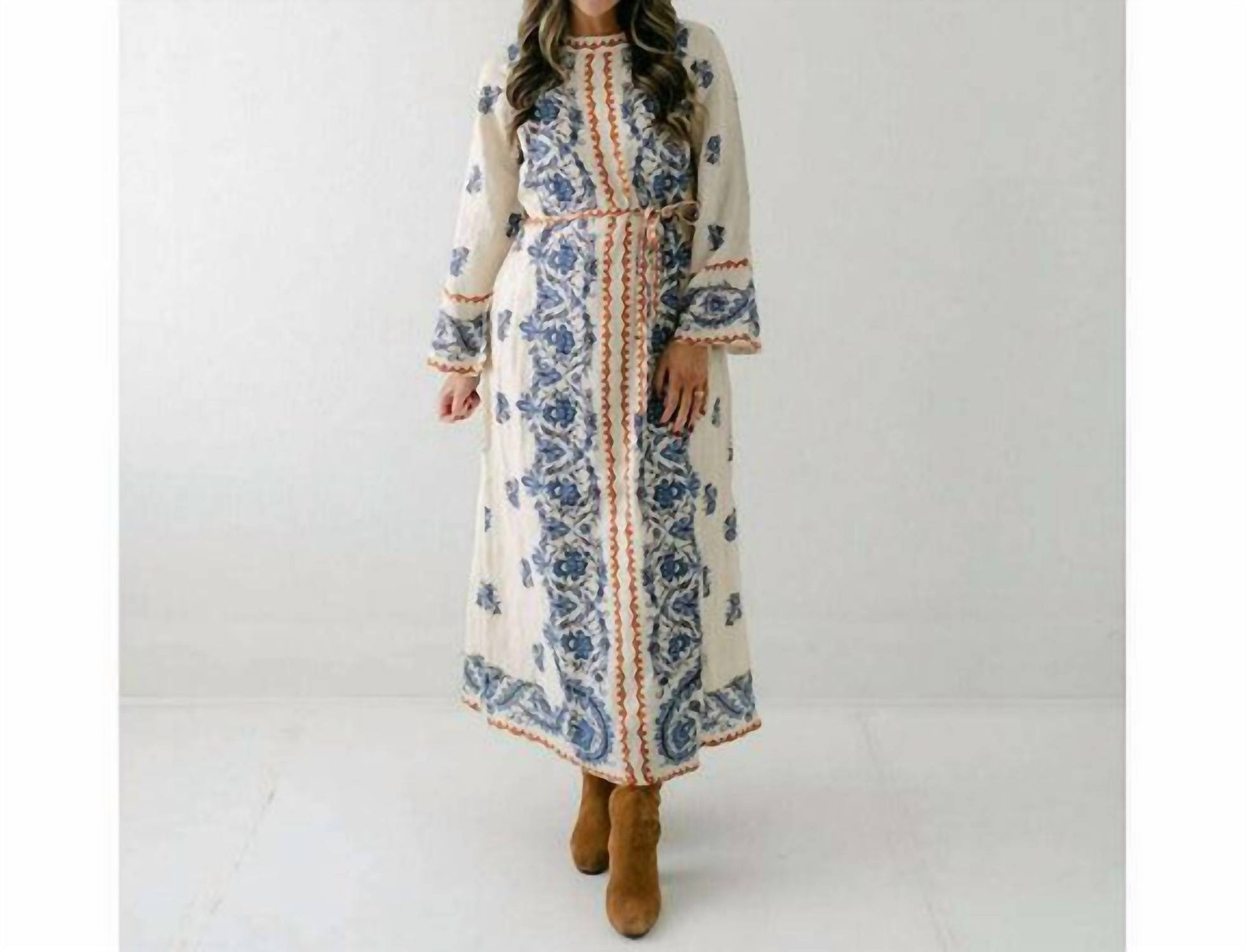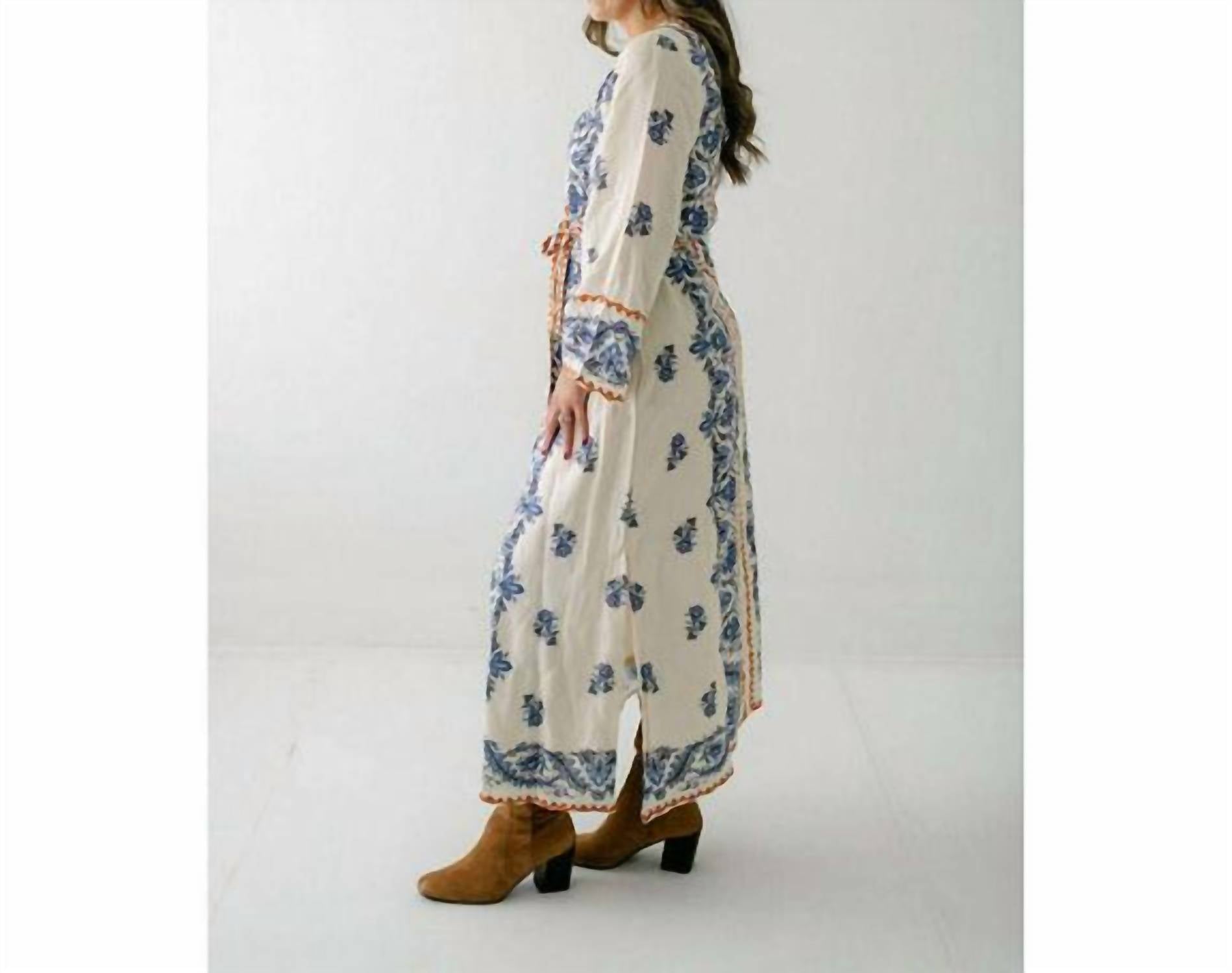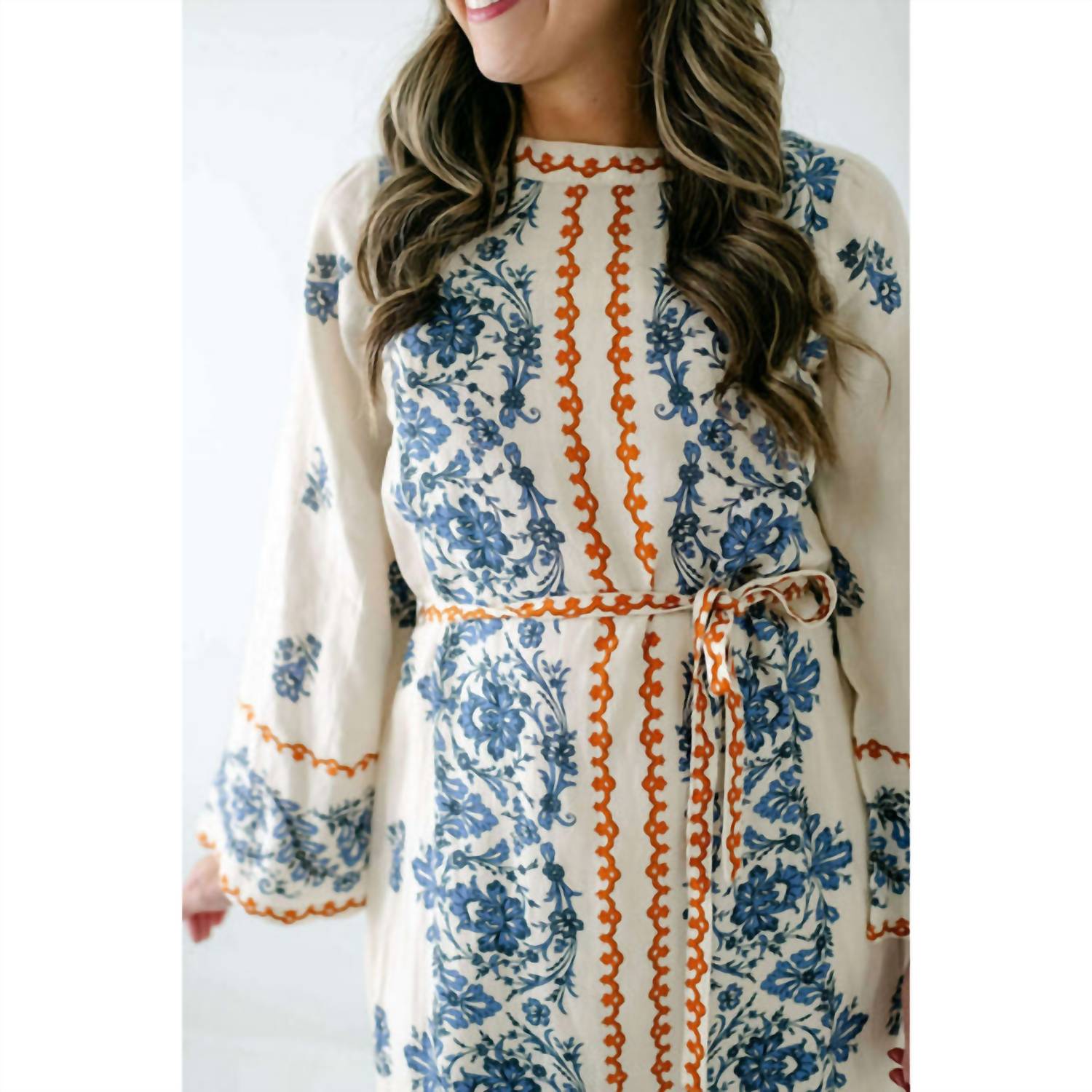 The pefect long sleeve dress for those cooler months. Introducing the Bell Sleeve Tess Handkerchief Dress by Elizabeth James The Label, an elegant choice for the season in sophisticated Ivory. Crafted from a viscose blend, this patterned dress features long bell sleeves and a stylish boat neckline, making it ideal for a Boho Chic holiday party. The classic t-shirt silhouette is enhanced by a back button closure and optional sash belt for added versatility. Its machine washable design ensures easy care, while side slits and full lining offer comfort and practicality.
