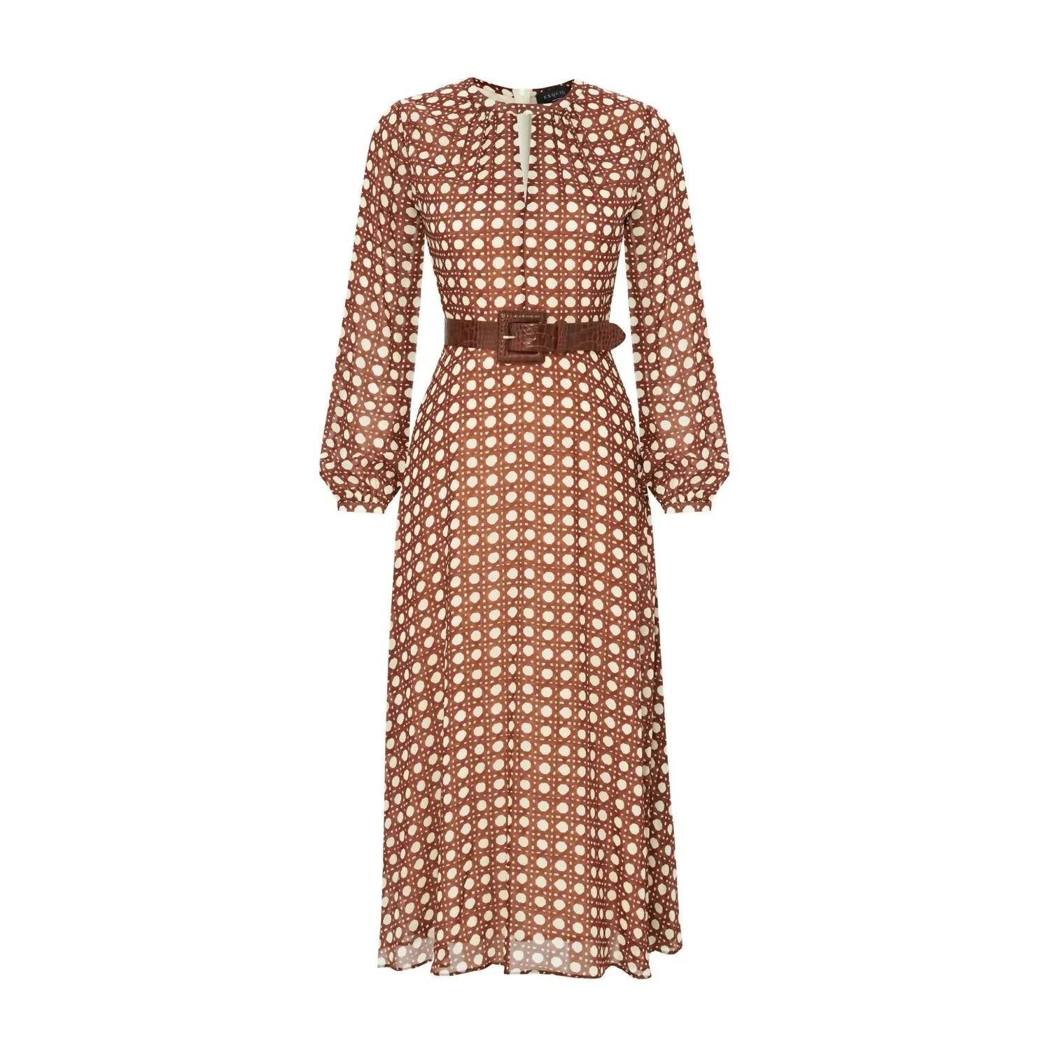 A flattering yet comfortable dress you'll be reaching for season after season. Elevate your style with the Alaina Dress by EXQUISE, featuring long sleeves for a classic yet contemporary look. Made in a chic Umber Brown Dot Silk with a patterned design, this midi-length sheath dress offers the perfect silhouette for any occasion. The zip closure ensures a seamless fit, while the belted waist accentuates your figure beautifully. Care for this elegant piece with dry cleaning, and enjoy its versatility this fall, perfect for Thanksgiving gatherings or stylish 90s-inspired parties.