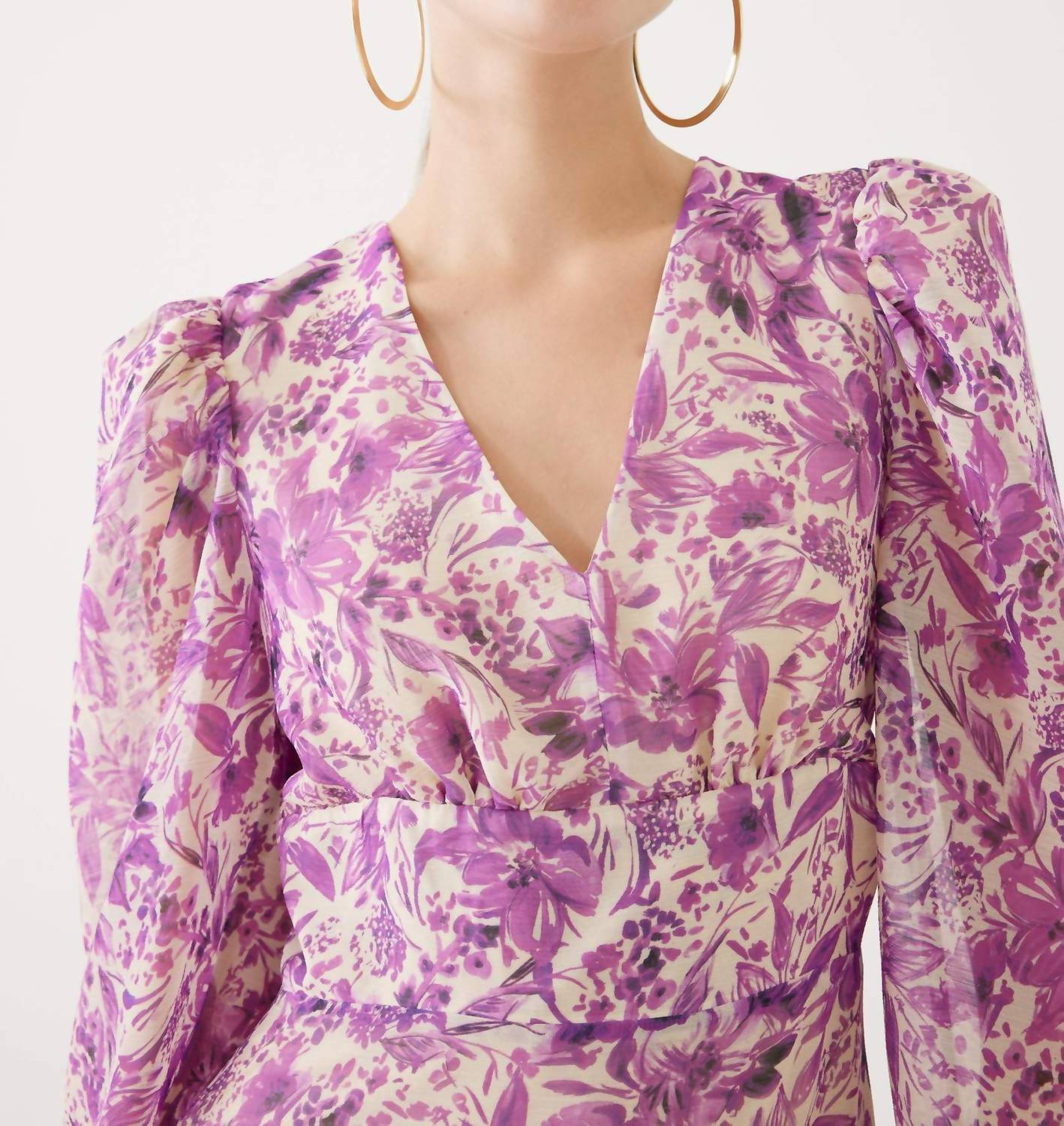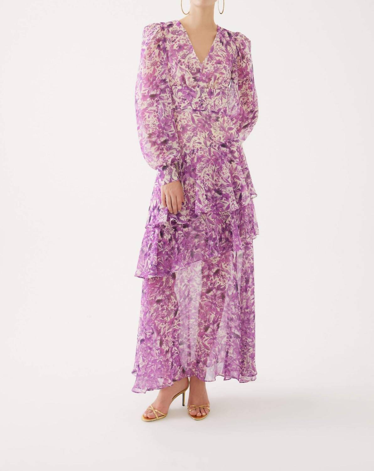 Cute and comfortable, this long sleeve dress has it all. Introducing the Imogen Ruffle Flowing Maxi Dress by EXQUISE, a perfect addition to your vacation wardrobe in a lovely lilac and bone floral pattern. Featuring long balloon sleeves with button cuffs, this fit and flare dress is crafted from a blend of 48% Polyester and 52% Recycled Polyester with a 100% Polyester lining. It offers a graceful maxi length with a v-neckline, tiered hemline, front leg split, and a keyhole back, ensuring ultimate comfort and style. Closure: Concealed zip at back. Care: Machine wash cold.