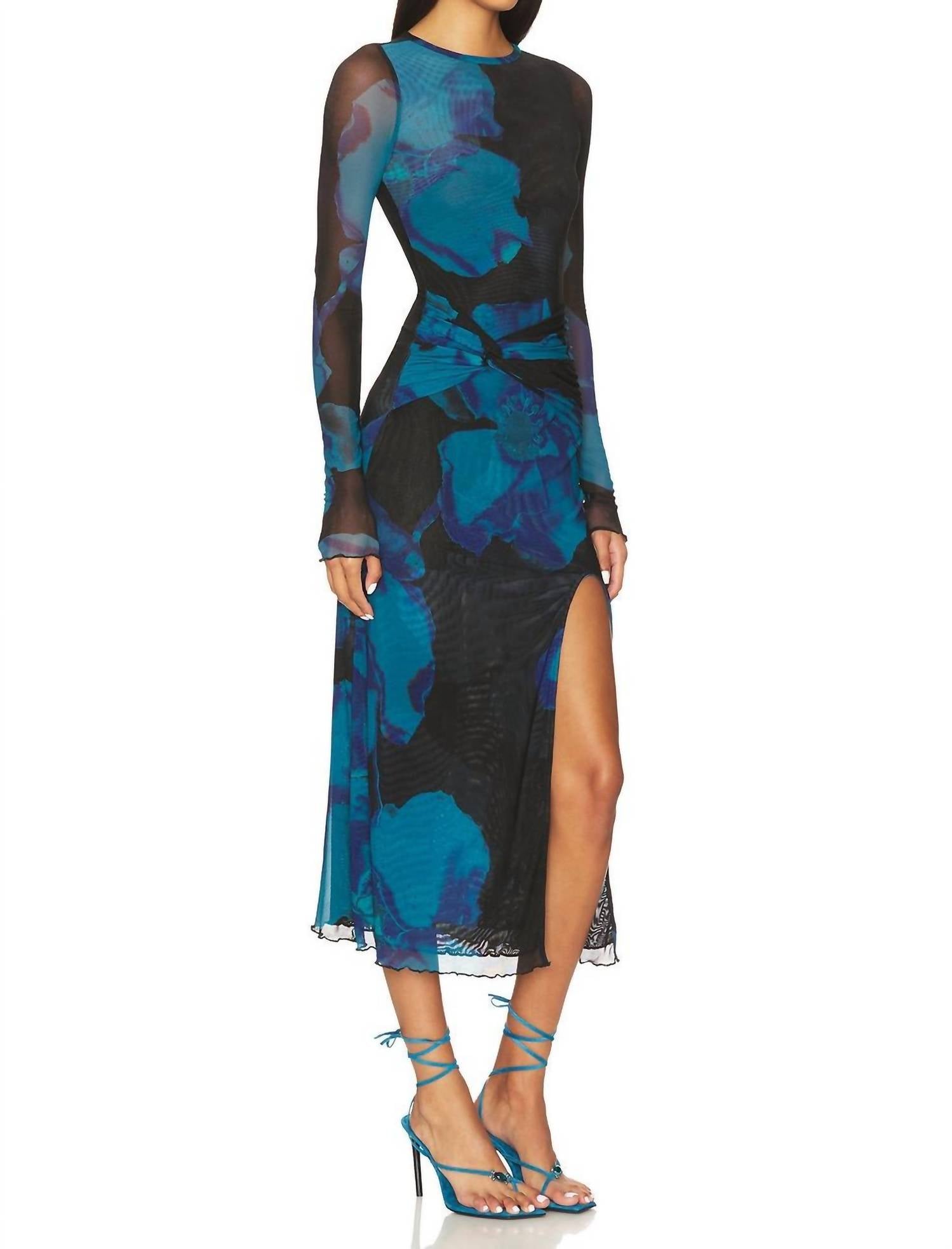 Cute and comfortable, this long sleeve dress has it all. Introducing the Gianni Mesh Maxi Dress by Free People, a captivating choice for evening events. This long-sleeve sheath dress in the Night Combo features a stretchy printed mesh composition of 95% nylon and 5% elastane. With a 50.5-inch length, left upper thigh slit, and a pull-on closure, it's designed for effortless allure, completed with a crewneck and gathered waist detailing. Care for this femme and flattering piece by machine washing and tumble drying, making it ideal for your Boho Chic fall wardrobe.