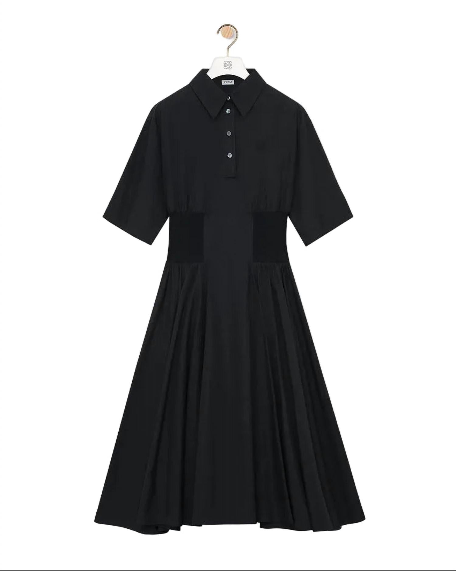The pefect long sleeve dress for those cooler months. Introducing the Short Sleeve Dress by Loewe, a masterpiece in modern minimalist fashion. This knee-length dress showcases a lightweight cotton poplin material, complete with a polo collar and rib knit waist for an elegant silhouette. Its A-line design flares into a flared skirt, featuring Loewe's signature anagram embroidery on the chest. Closure: Button closure. Perfect for an evening event or a romantic Valentine's Day celebration, this black dress is all about sophisticated style.