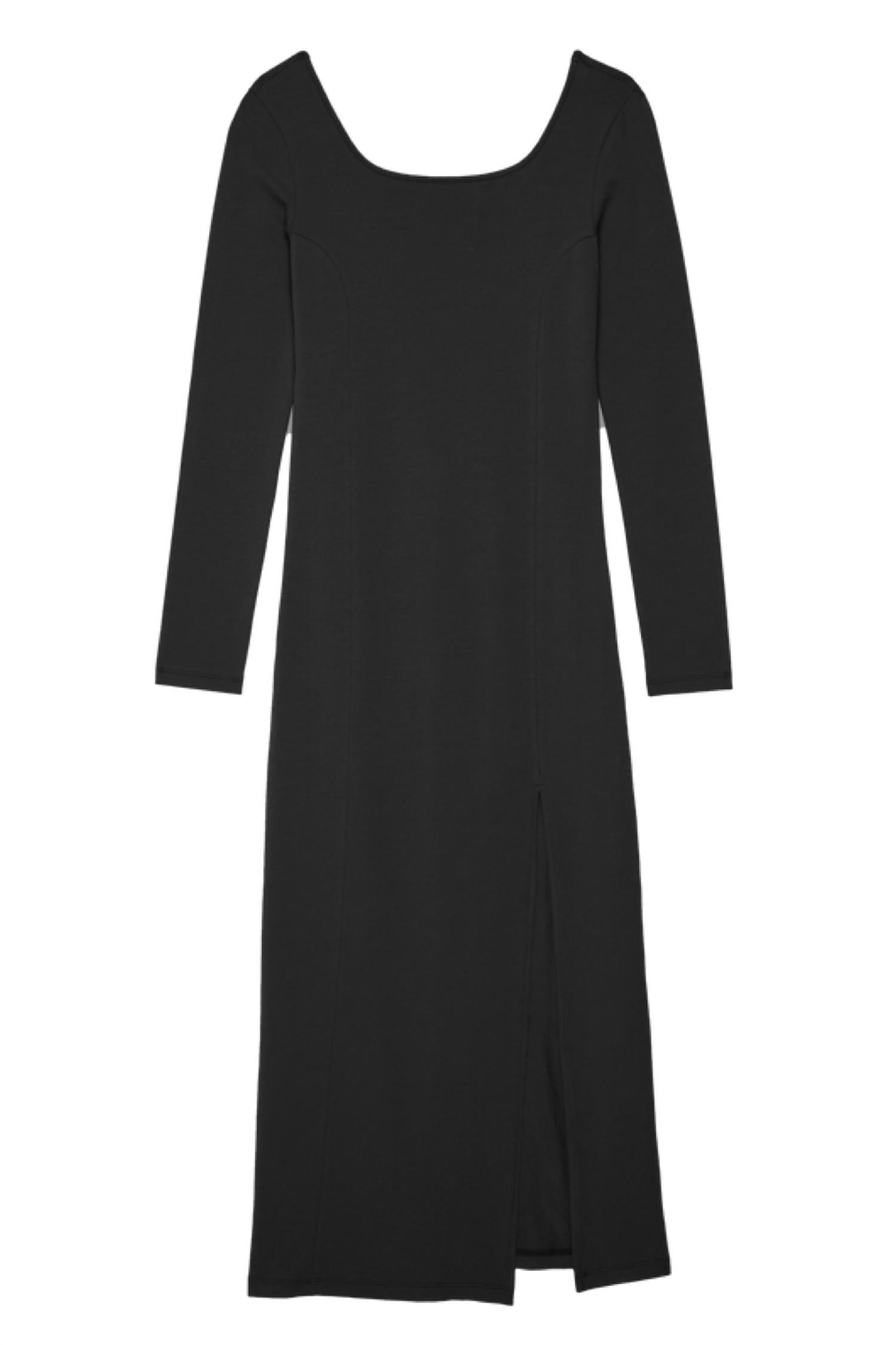 The pefect long sleeve dress for those cooler months. The Alma Square Neck Dress by Nation LTD is the epitome of minimalist style and elegance for your next holiday party. Crafted from a luxurious cotton blend of 95% Pima Cotton and 5% Spandex, this jet black bodycon dress offers a soft feel with a touch of stretch, ensuring a snug fit through the bust, waist, and hips. Designed with a square neckline and curved dart details, it promises a form-fitting silhouette that's both chic and flattering. Enjoy the convenience of easy maintenance with this machine-washable garment.