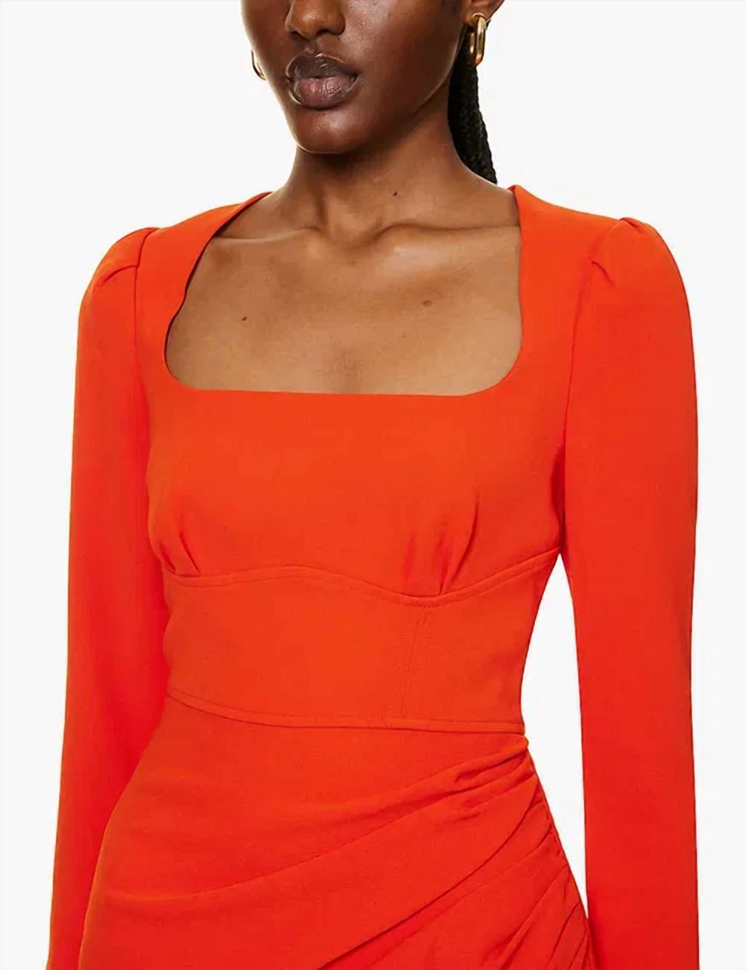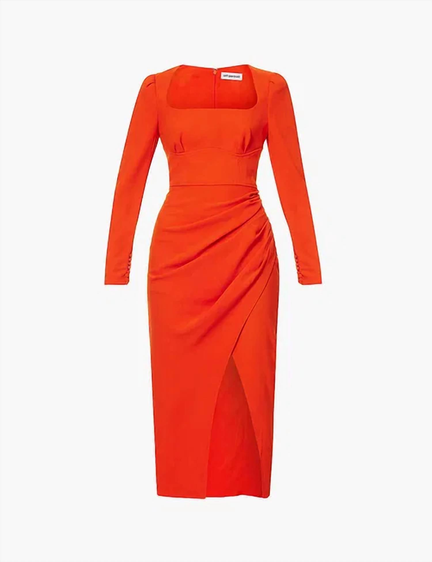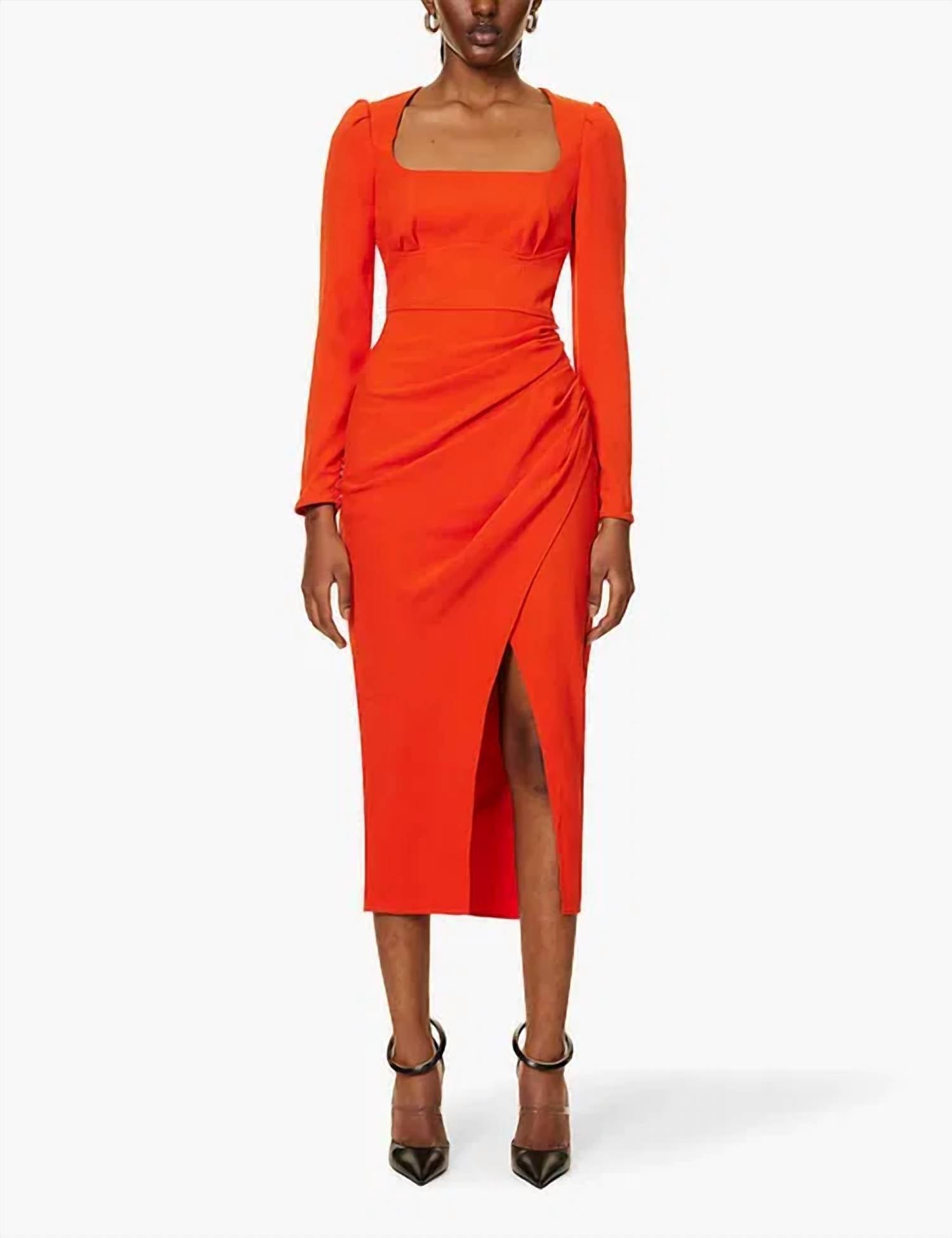 Cute and comfortable, this long sleeve dress has it all. Guaranteed head-turner, this crimson midi dress, cut from heavy crepe for a silky finish and effortless drape, features puffed long sleeves that add volume, a universally flattering square neckline, and a fitted bodice that flows into a ruched skirt with a side split. Making it the perfect piece to pair with stilettos and a matching red lip, especially when you're ready to turn heads and collect compliments.