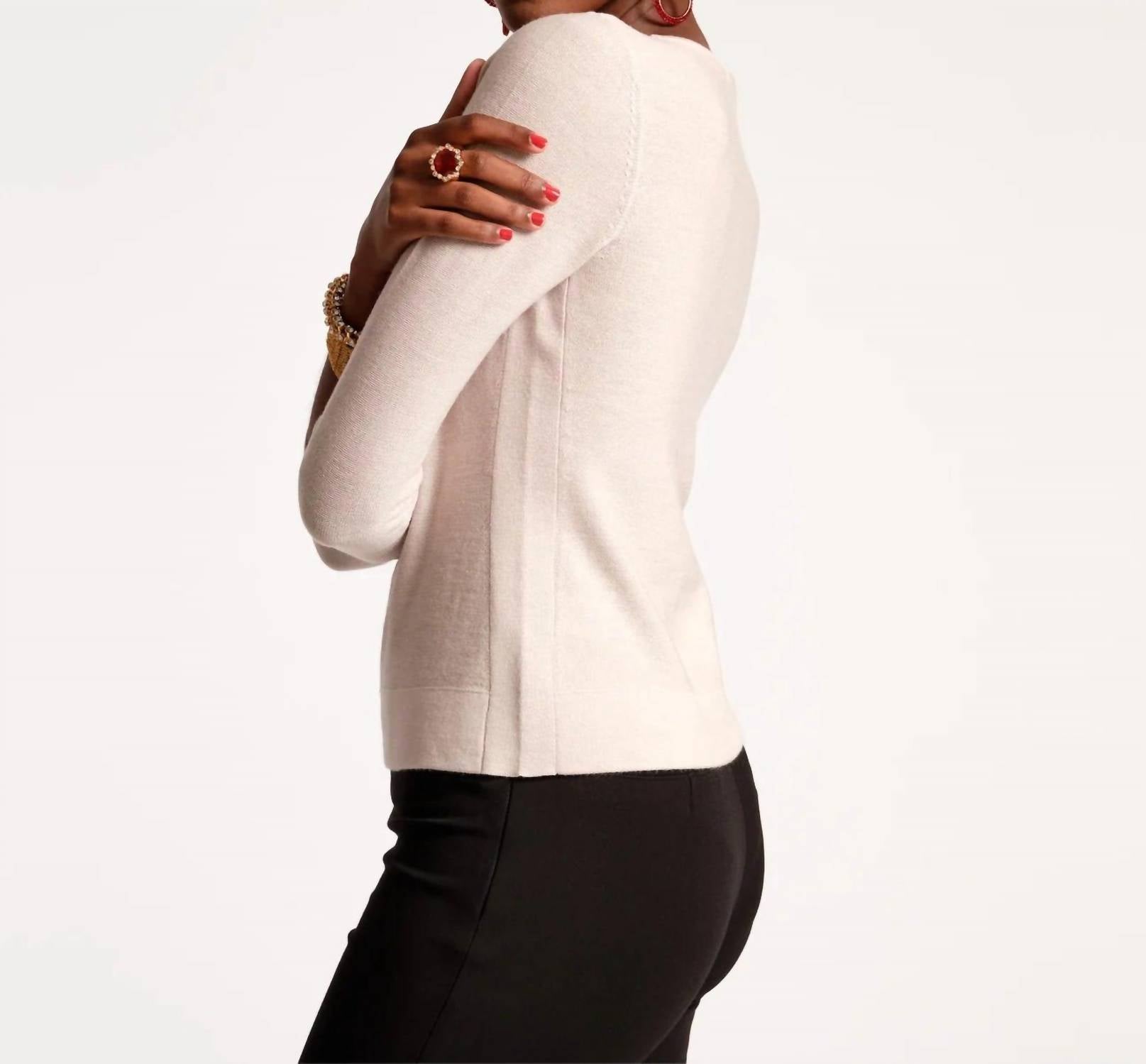 A long sleeve top you can wear with denim, skirts, well... just about anything! Elevate your wardrobe with the Rebekah Top Knit Lurex by Frances Valentine, a stylish addition in a beautiful champagne hue. This fitted, wide-neck top features three-quarter sleeves and is crafted from a luxurious wool blend, composed of 89% wool and 11% metallic for a subtle shimmer. The garment boasts versatile lengths ranging from XS at 21 1/2'' to XL at 25 1/2'', with corresponding sleeve lengths from 18'' to 19''. Designed with a pull-on closure, this top is perfect for elegant pairings and requires hand washing for care.