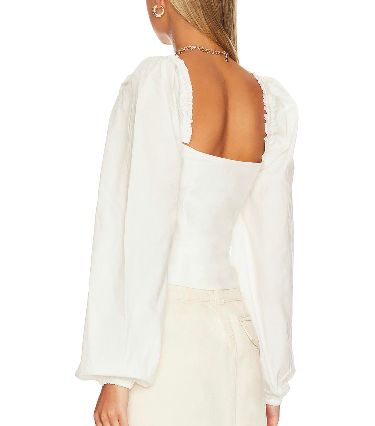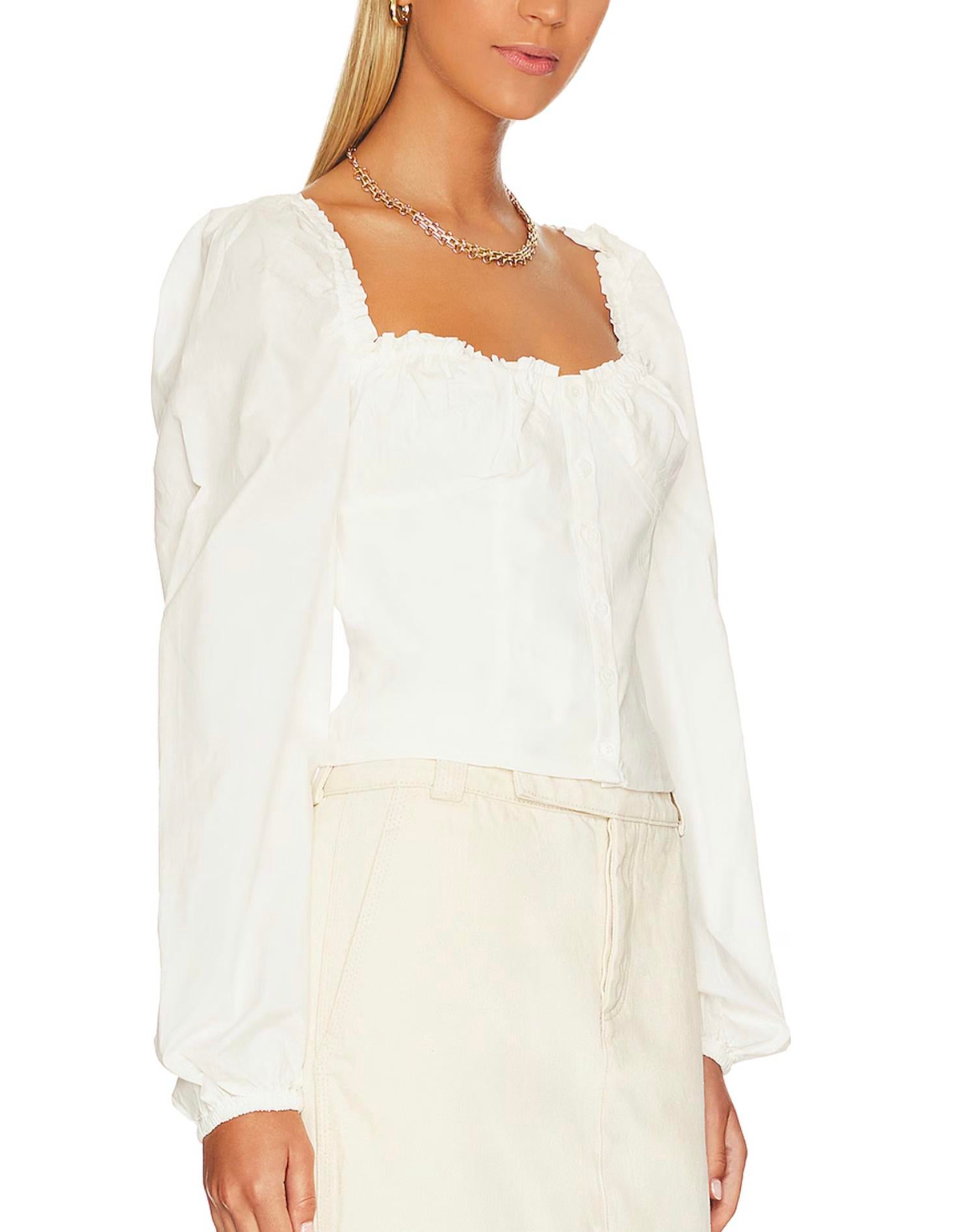 A long sleeve top you can wear with denim, skirts, well... just about anything! 95% cotton, 5% spandex. Made in China. Machine wash. Front button closure. Ruffle neckline trim. Blouson sleeves with elastic cuffs. Lightweight linen fabric.