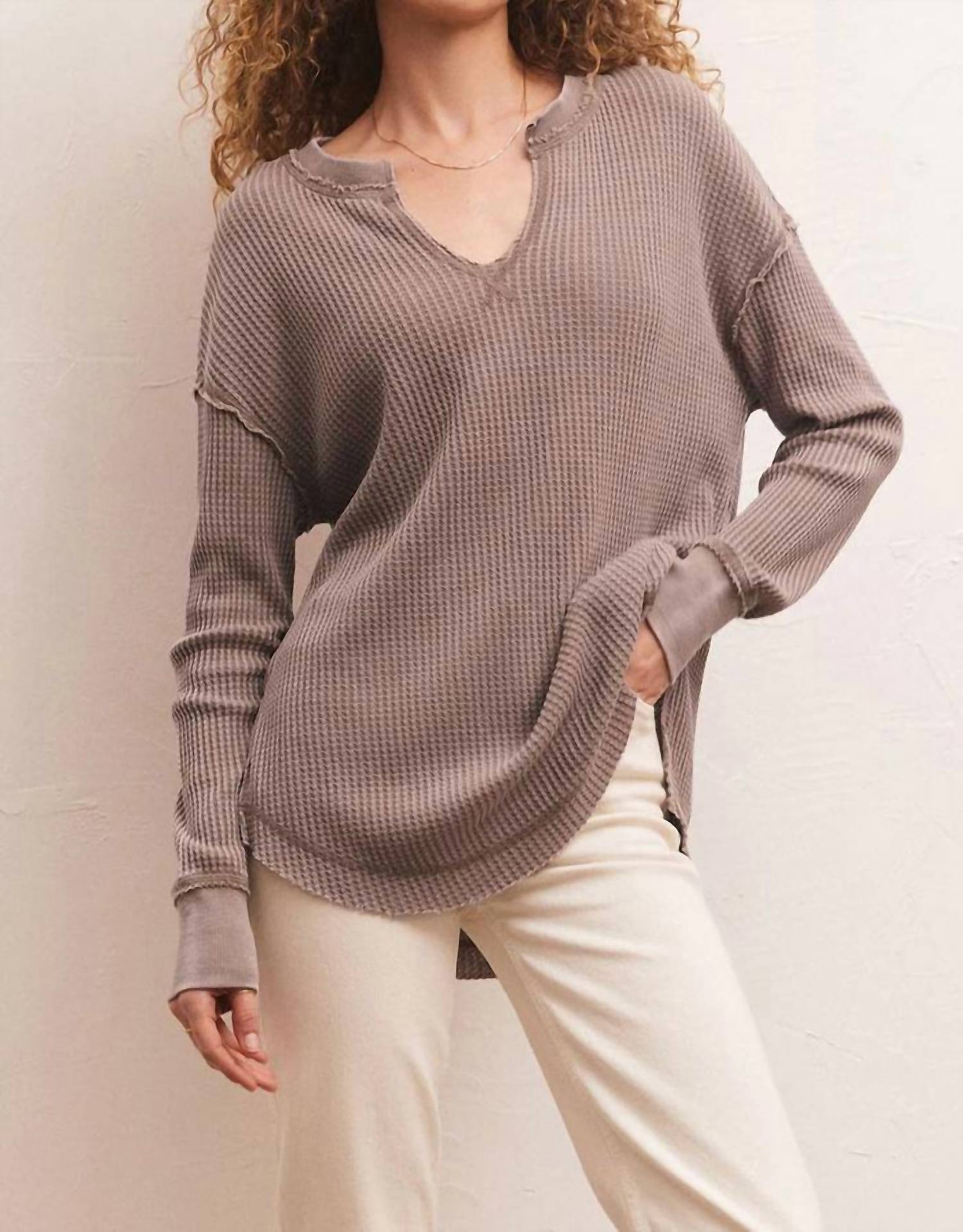 Discover the Driftwood Thermal Long Sleeve Top by Z Supply, a cozy essential in a charming Milkshake hue. This women's top boasts a comfortable long sleeve design made from a blend of 60% cotton and 40% polyester for ultimate softness. Its textured pattern and V-neckline add style, while the oversized fit and raw edge details offer modern flair. Easy to wear with a pull-on closure and convenient machine wash care.