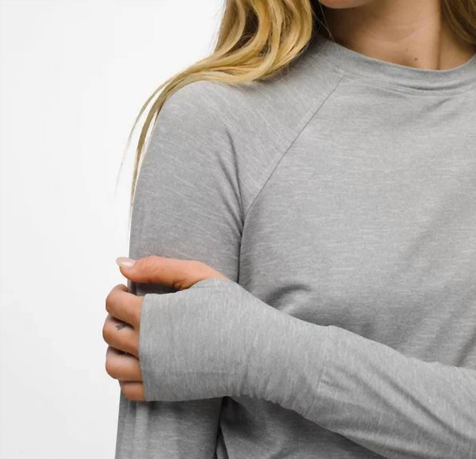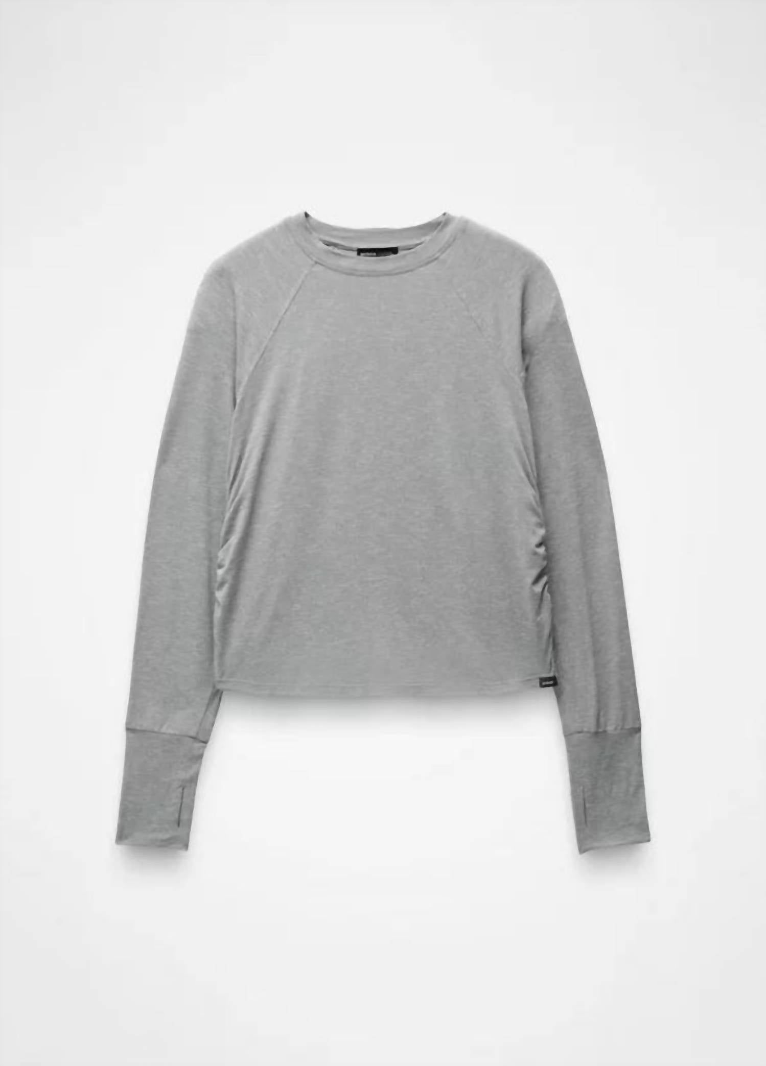 Great fit, cute design, soft fabric. You'll love everything about this long sleeve tee. The Sol Searcher Long Sleeve Crew by prAna offers stylish protection in a heather grey design perfect for both backpacking adventures and outdoor workouts. Featuring long sleeves with thoughtfully designed thumb holes, this top is crafted from 92% recycled polyester and 8% elastane. The breathable mélange jersey knit provides moisture-wicking properties, ensuring comfort with a fit that skims your shape. Imported and designed with UPF 50+ protection, this pull-on style is easy to maintain with machine wash instructions.