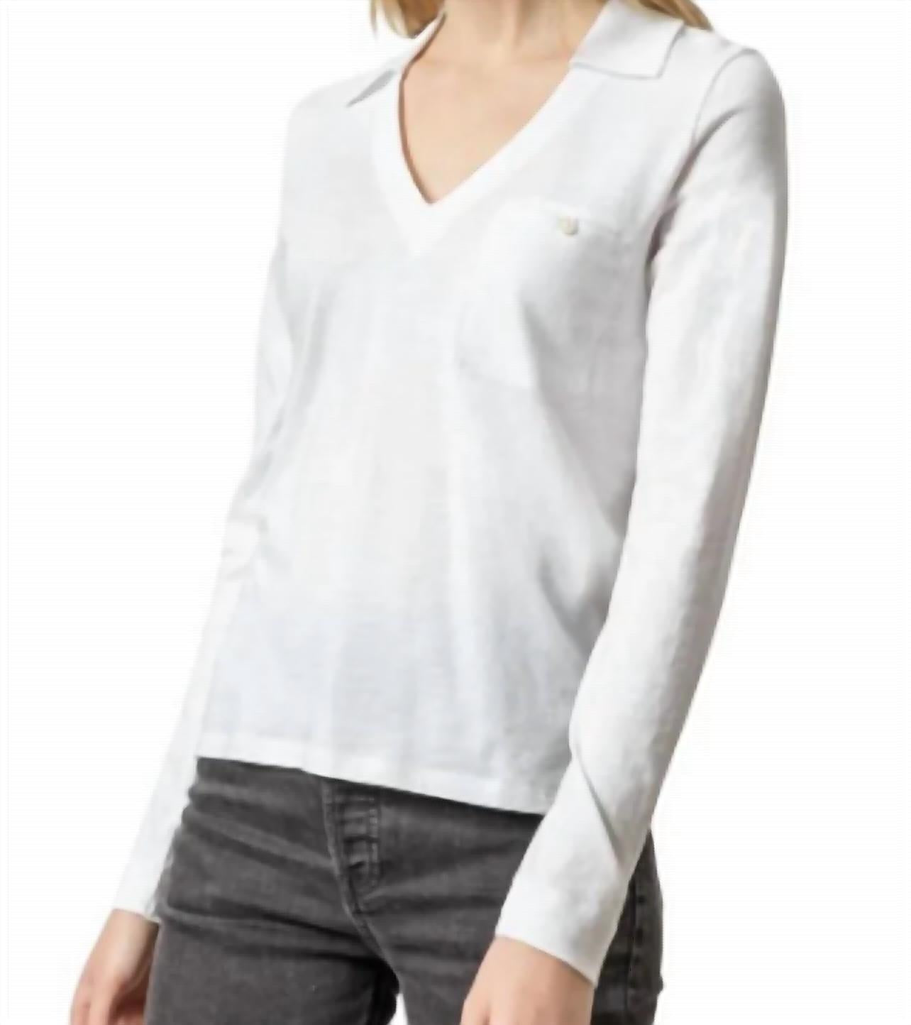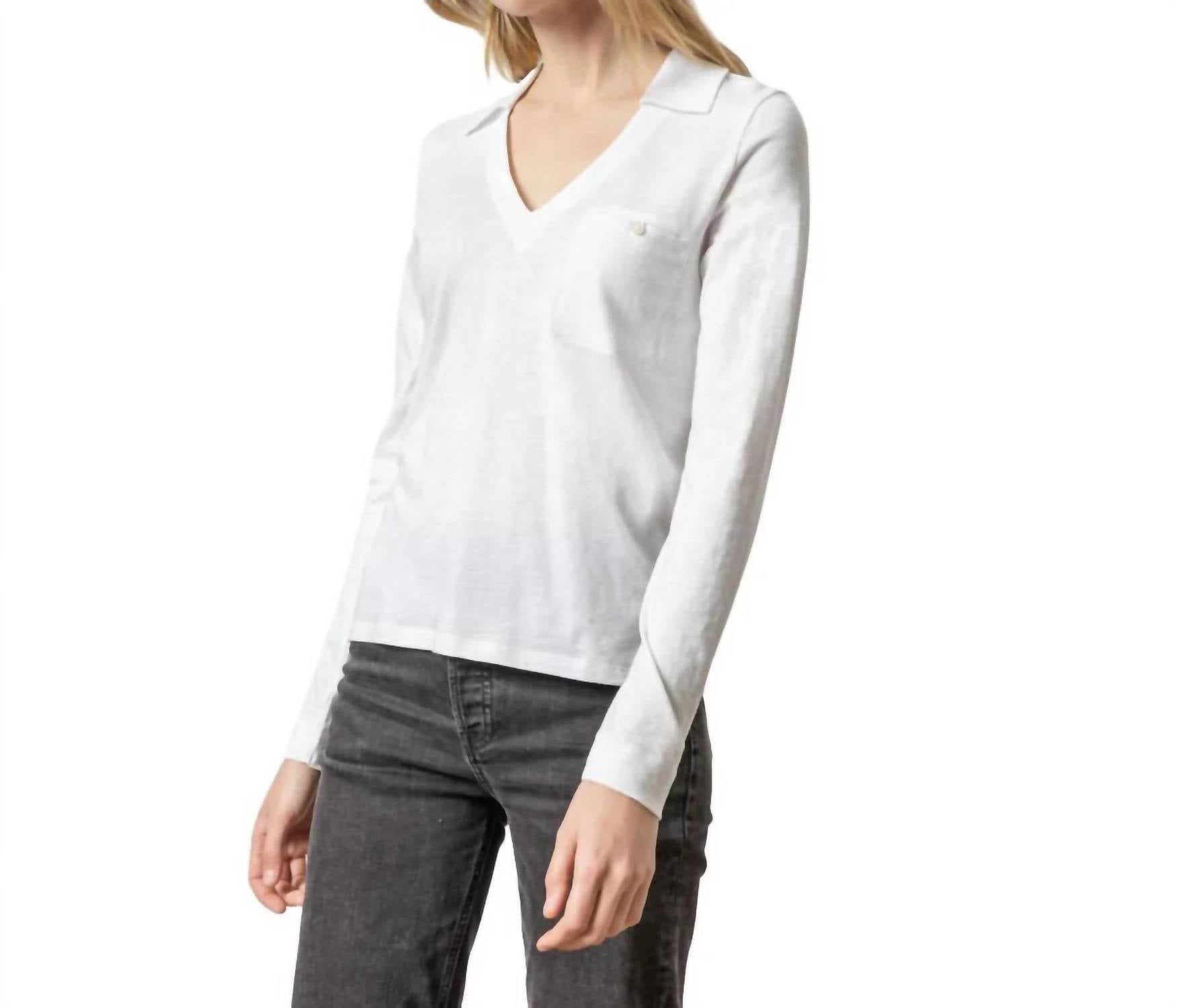 The perfect long sleeve tee that goes with just about anything. Discover the Women's Long Sleeve Collared V Neck by Lilla P, expertly crafted from a luxurious blend of 50% Cotton and 50% Modal in a crisp white hue. This long sleeve tee is designed to skim the body with a flattering fit and features a sophisticated V-neck collar and a practical pocket detail. With a length of 24" for size Medium and set-in shoulders, this piece offers a refined silhouette perfect for travel or spring occasions. Care for this solid-patterned tee is easy with machine wash cold instructions.