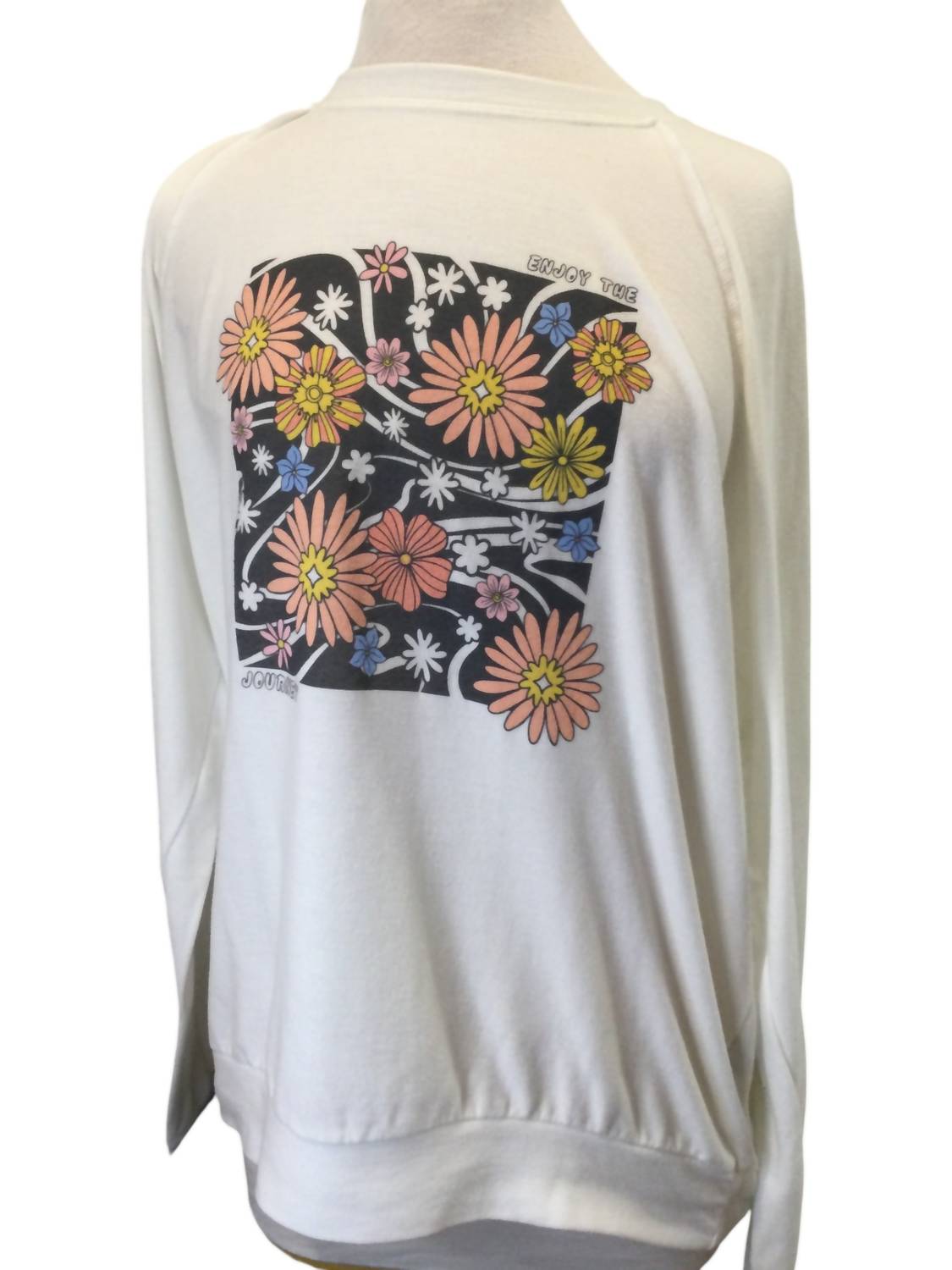 The perfect long sleeve tee that goes with just about anything. Meet the Mary Beth Trust The Flower Sweatshirt by good hYOUman, a floral, long-sleeve top that blends comfort and style effortlessly. Crafted from a signature blend of 60% Polyester, 32% Rayon, and 8% Spandex, this piece features a cozy crewneck and raglan sleeves with exposed stitching details. Originating as a pull-on garment, its delicate hacci fabric is designed for easy living and best treated with care. Machine wash cold inside out in a delicates bag and dry flat to maintain its allure. Model is 5'9" and wearing a size small.