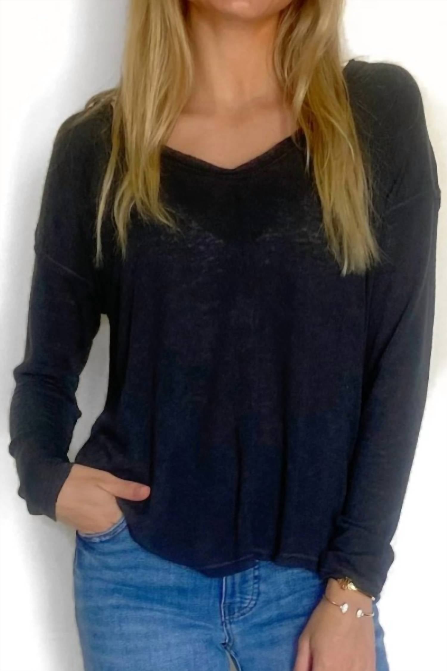 A long sleeve top you can wear with denim, skirts, well... just about anything! Elevate your wardrobe with the Basic Language Top by SIX/FIFTY, a textured black tee that is ideal for any season. This long sleeve top is composed of 62% rayon and 38% polyester, offering a lightweight feel perfect for layering. Featuring a v-neck and pull-on closure, this top effortlessly pairs with any footwear from booties to sneakers. Care instructions are not specified. Model is 5'6" and wearing a size small.