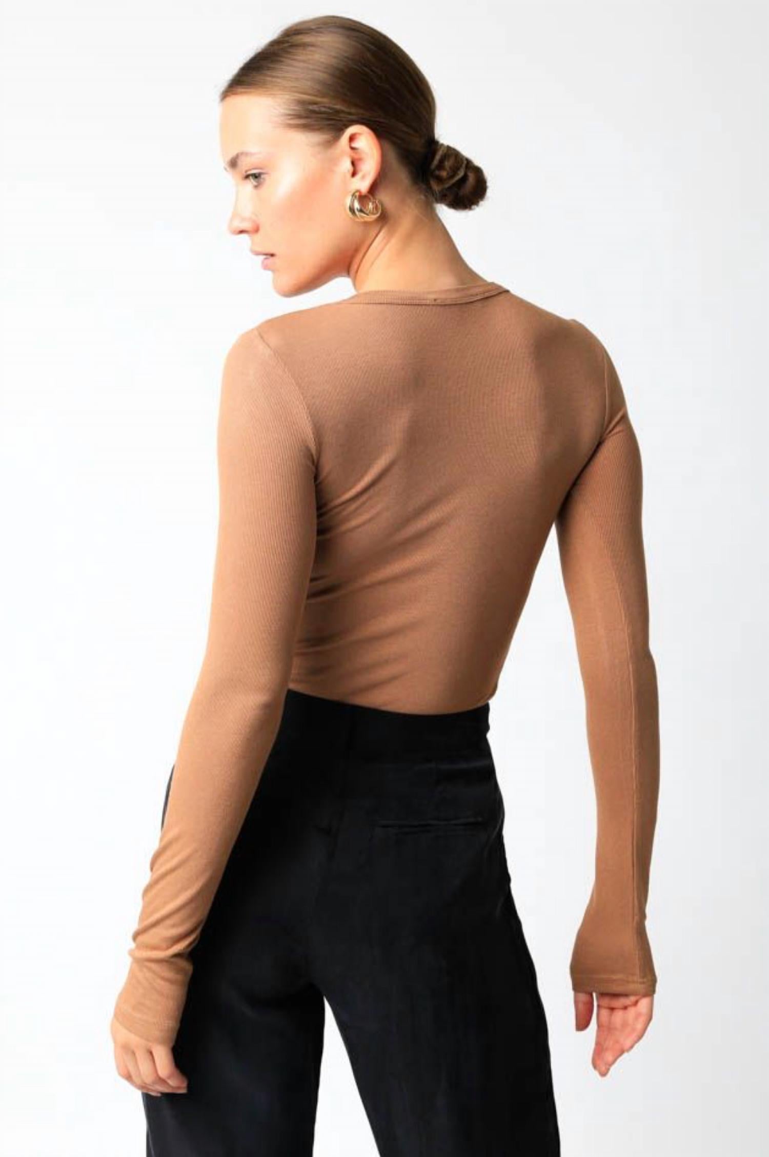 Our Fitted Ribbed Top features a crew neck and a fitted fit. Knit. Model's Measurements: Height 5' 9 1/2, Bust 32, Waist 24, Hips 35, Size S. 95% rayon, 5% spandex.