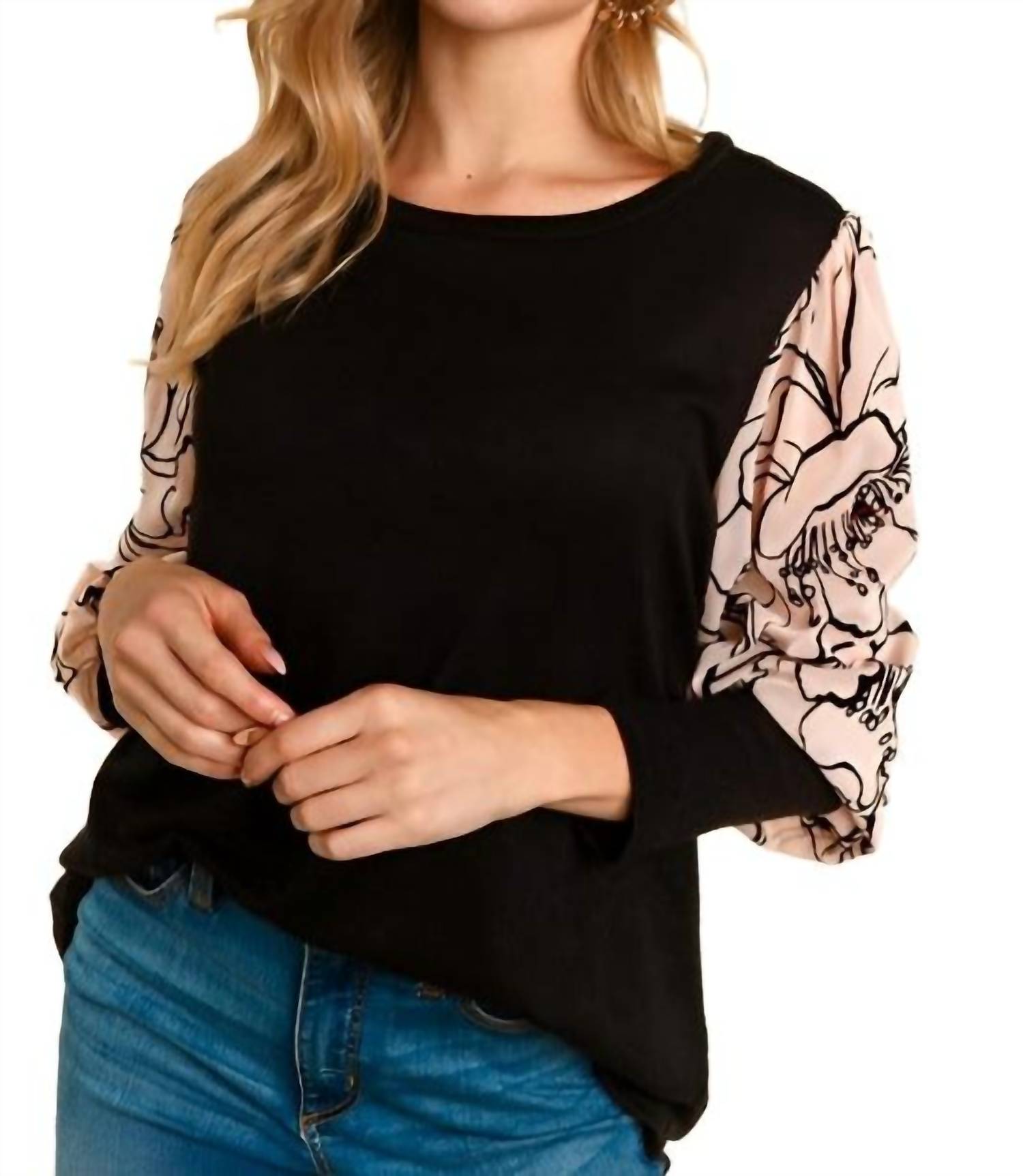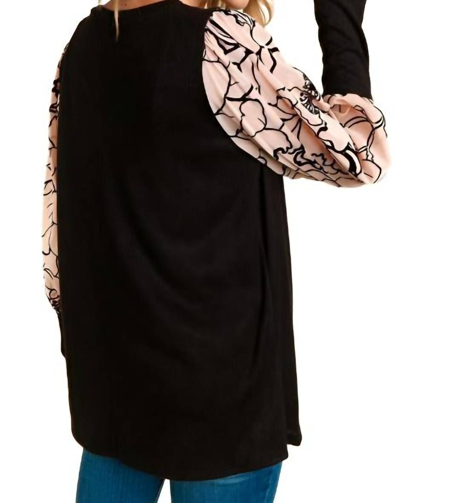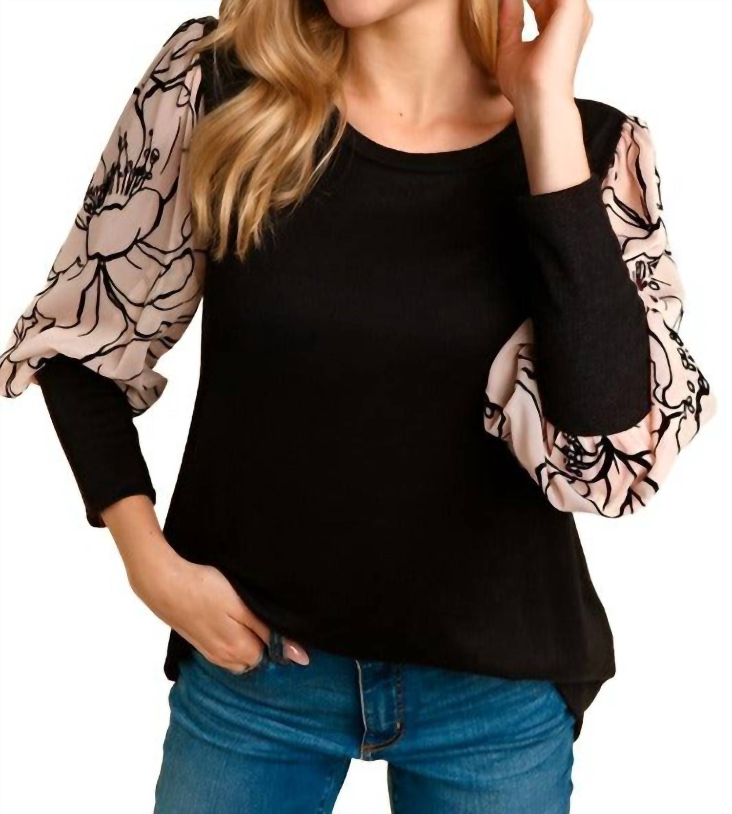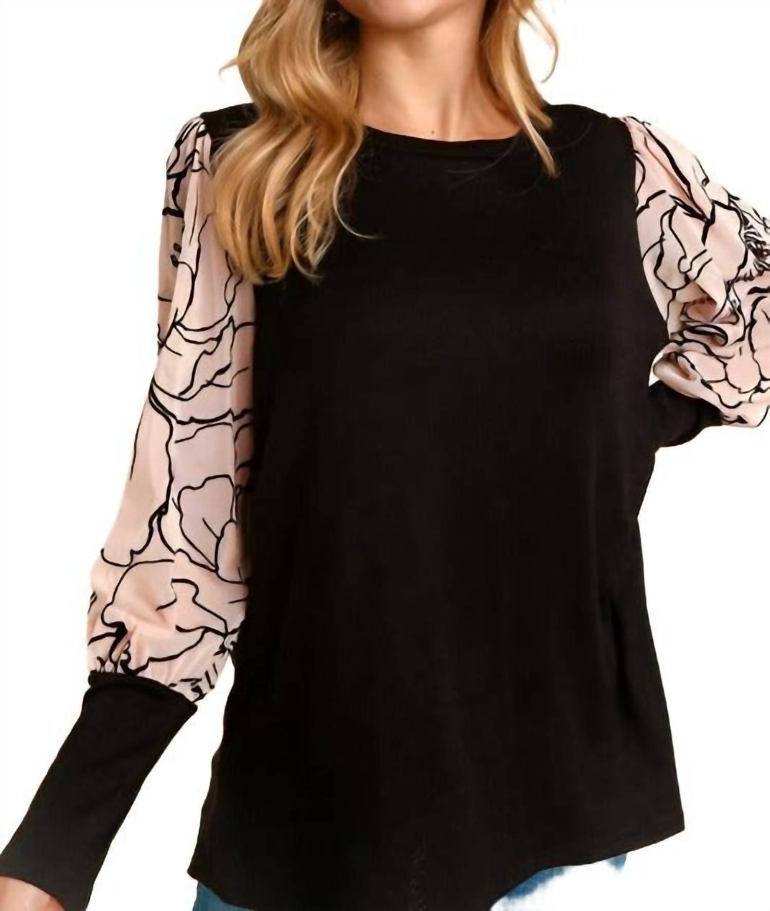 A long sleeve top you can wear with denim, skirts, well... just about anything! Elegant top features long puff sleeves and a sophisticated scoop neckline. Crafted from a lavish blend of 50% Rayon, 28% Polyester, and 22% Nylon in a black and taupe palette. Designed for both comfort and style, with a stretchy knit. Featuring a pull-on closure. Requires a gentle hand wash.