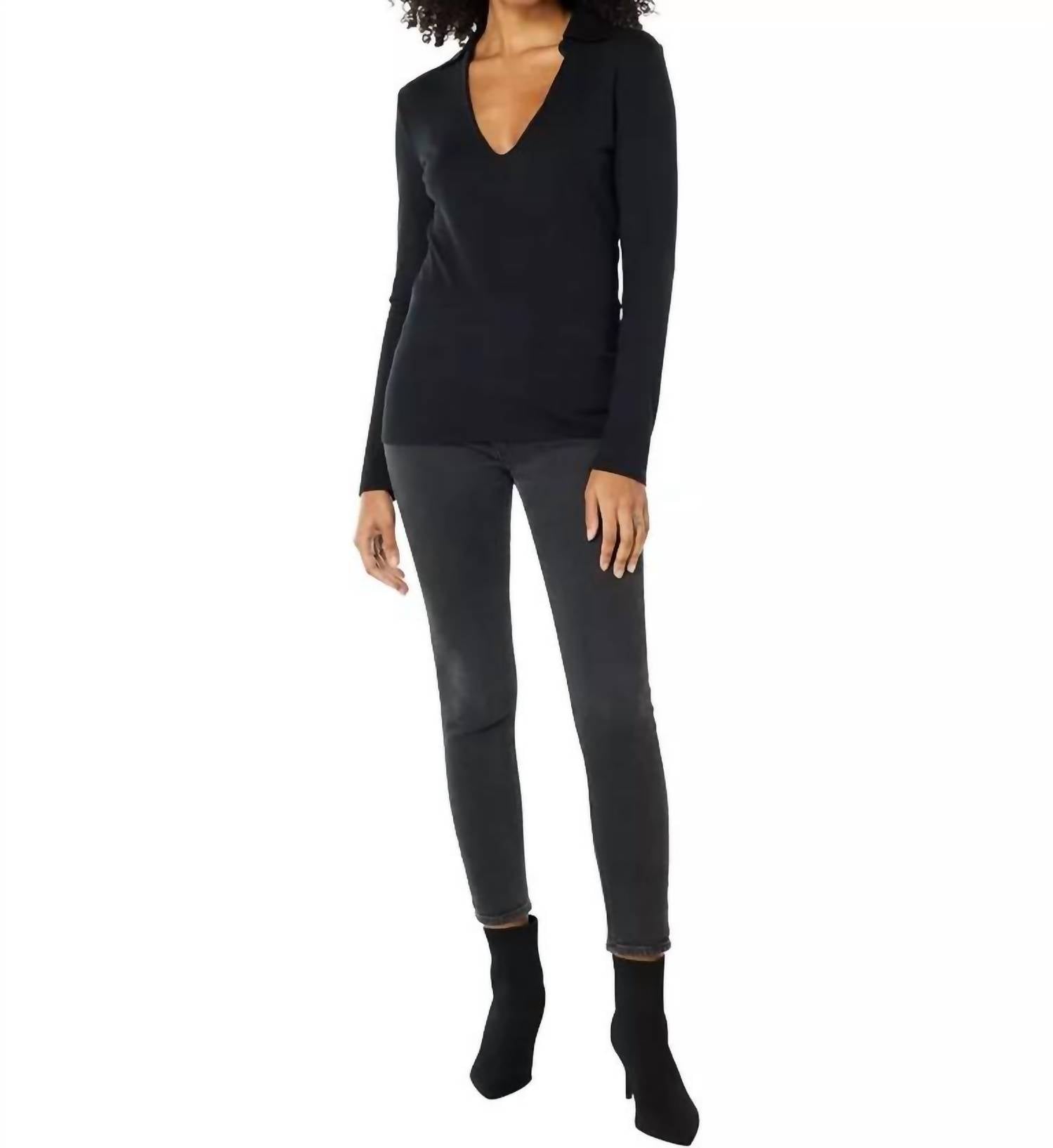 Collar Knit Tee. Model is 5'8" and wearing a size small. 90% Rayon, 10% Nylon. Machine Wash Cold, Do Not Bleach, Lay Flat To Dry, Cool Iron If Needed, Or Dry Clean. Imported.
