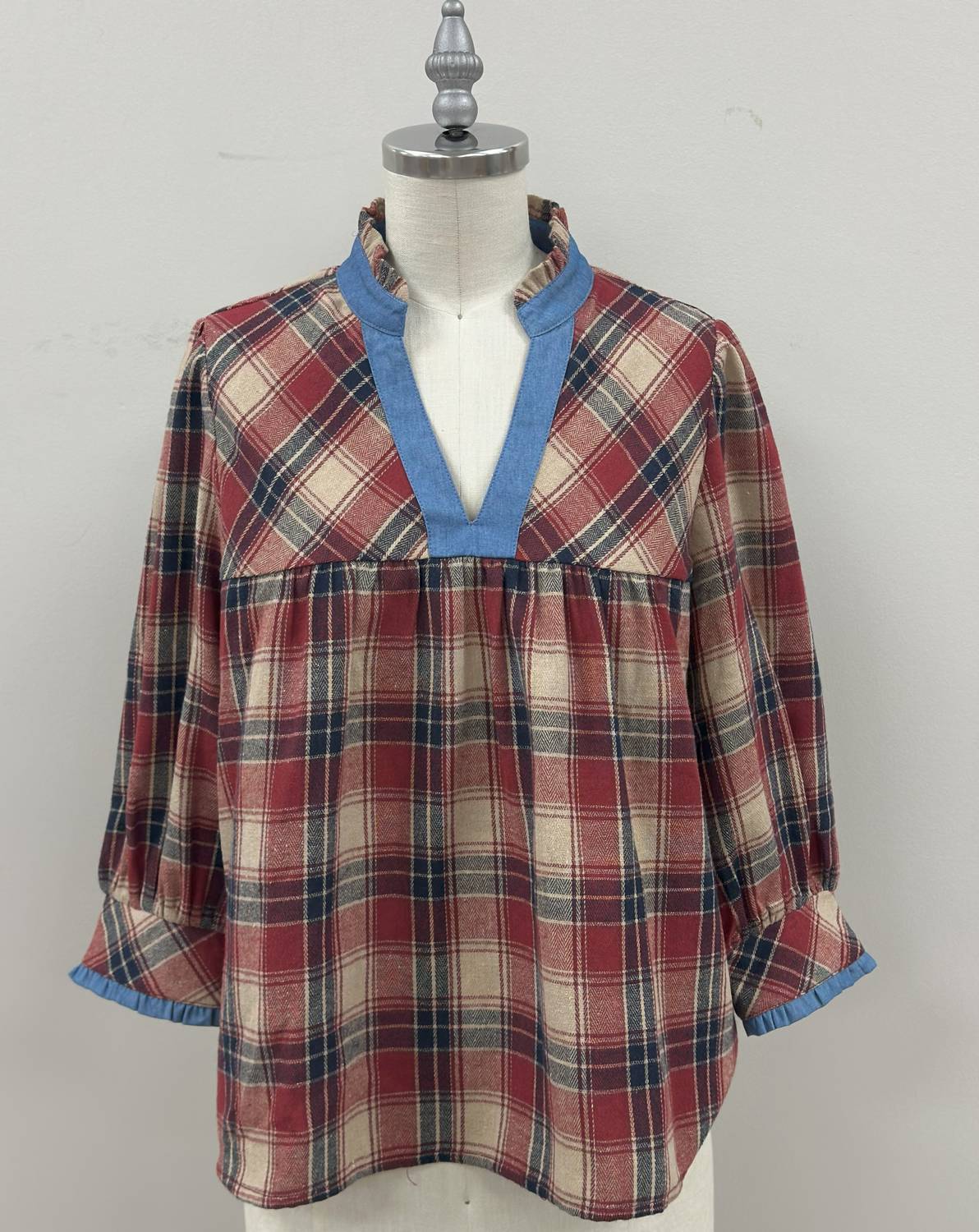 The perfect long sleeve tee that goes with just about anything. Experience the elegance of the Long Sleeve Plaid V Neck Top by THML, a standout in vibrant red and navy plaid adorned with a light blue denim collar and cuffs. Crafted for women seeking a refined casual look, this piece is as versatile as it is stylish, complementing jeans or leggings with ease. Closure: Pull On. Care: Machine wash and tumble dry.