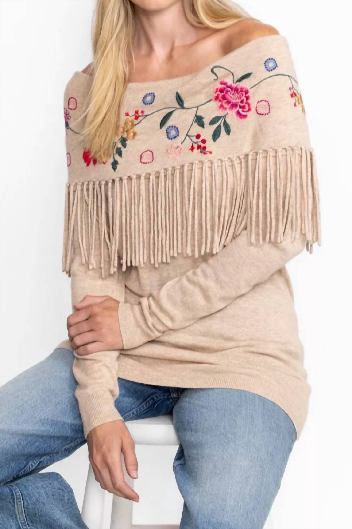 Great fit, cute design, soft fabric. You'll love everything about this long sleeve tee. This long sleeve tunic top features a wide cowl neckline adorned with vibrant floral embroidery for a touch of artistic charm. Crafted from a luxurious viscose blend, it's designed with a pull-on closure for ease and comfort. The fringe detail offers dynamic movement, making it a perfect choice for both style and coziness.
