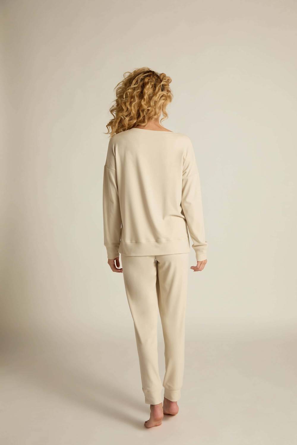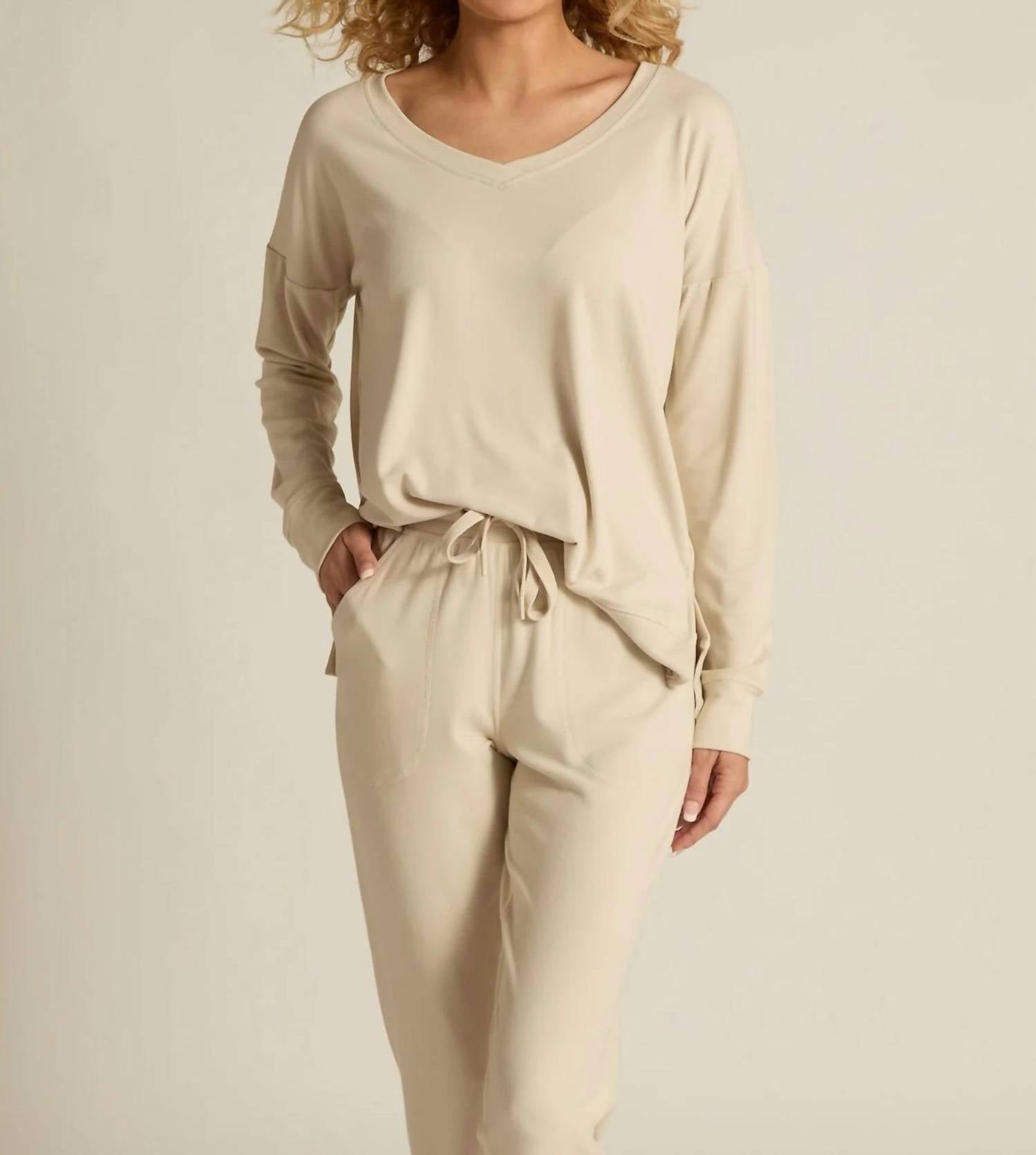 The perfect long sleeve tee that goes with just about anything. Discover the Soft Pullover by FACEPLANT DREAMS, crafted in a calming oatmeal hue for the ultimate blend of comfort and style. This women's long sleeve tee features a flattering V-neckline and dropped shoulders, making it ideal for both lounging and casual outings. Made from 70% sustainably grown bamboo rayon and 30% spandex, this pullover promises a buttery soft feel with natural breathability. Care is easy with machine wash on a gentle cycle, avoiding bleach, and tumble dry on low for best results. Closure: Pull on.