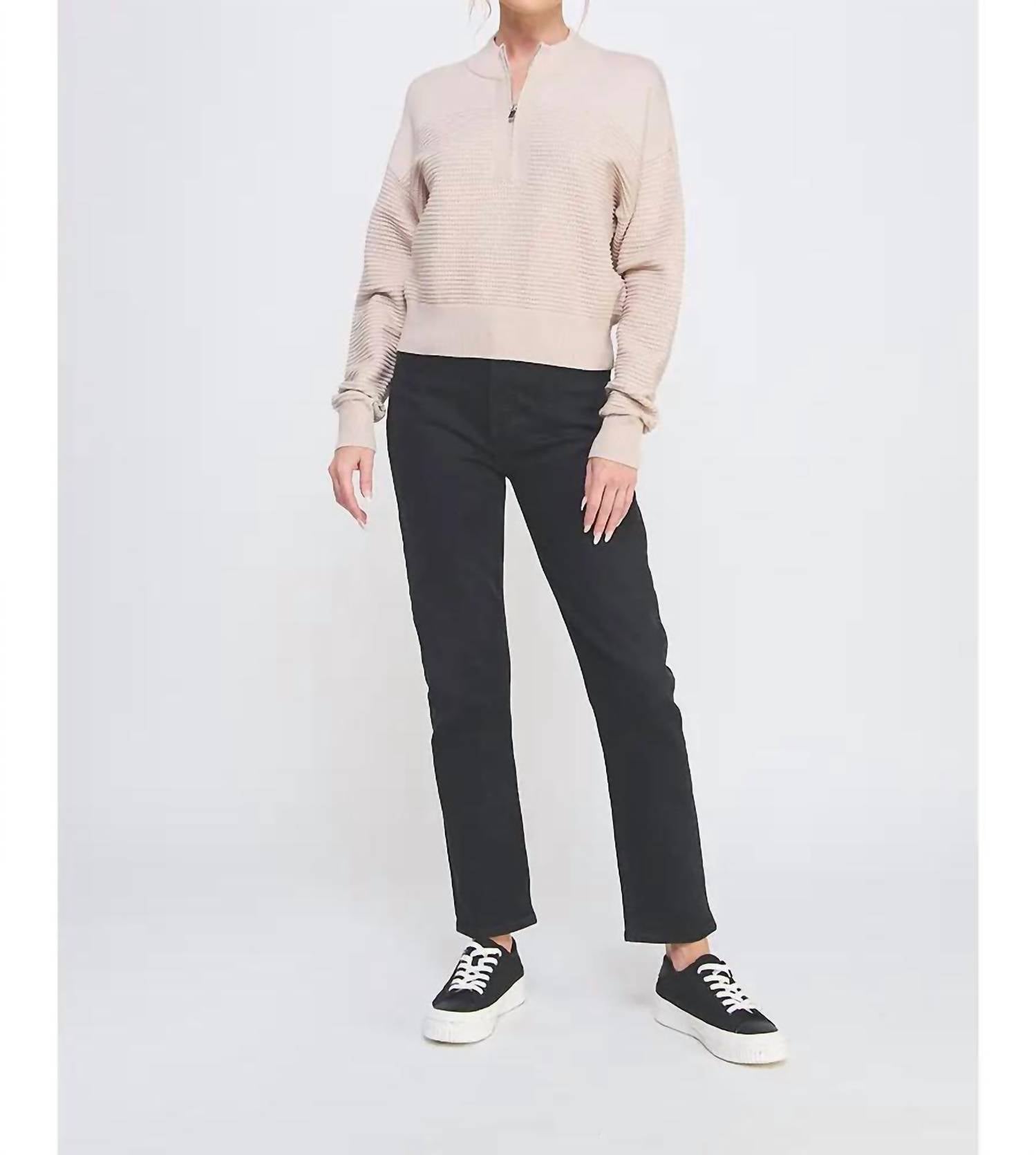 Great fit, cute design, soft fabric. You'll love everything about this long sleeve tee. Introducing the Dolman Half Zip Pullover by ALLIE ROSE, a soft oatmeal beige essential designed for versatile wear. This pullover boasts long sleeves with ribbed cuffs and a textured waffle-like pattern, made from a viscose blend for mid-weight comfort. It features a half zip mock neck collar perfect for casual layering and has a slightly oversized silhouette for a relaxed fit. Closure: Zip Closure. Ideal for transitions between fall and spring, it complements both trousers and denim for smart-casual looks. Model is wearing a size small.