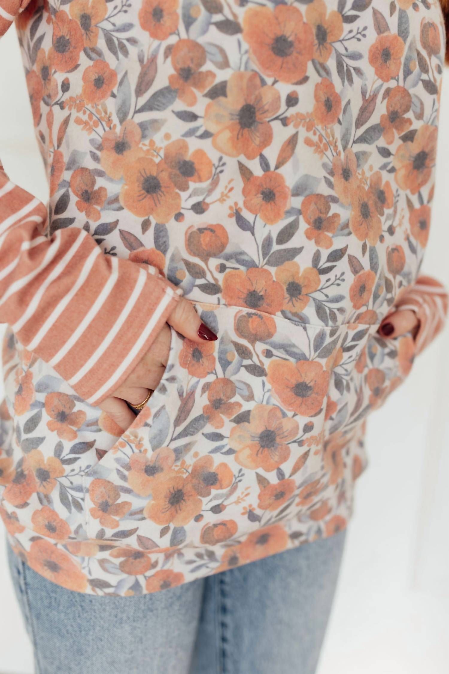 The perfect long sleeve tee that goes with just about anything. Introducing the Floral Cowlneck Top by Michelle Mae, a chic addition to your wardrobe perfect for spring outings and Easter celebrations. This long sleeve pullover in a trendy rust color features a unique zip-up cowl neck and is adorned with a mix of floral and striped patterns. Composition: 65% Cotton, 30% Polyester, 5% Spandex. Closure: Zip closure. Care: Hand wash cold, hang or lay flat to dry, low iron if needed or dry clean. Thoughtfully designed with a kangaroo pocket and thumb holes for added functionality, this top is perfect for a boho chic vacation look.