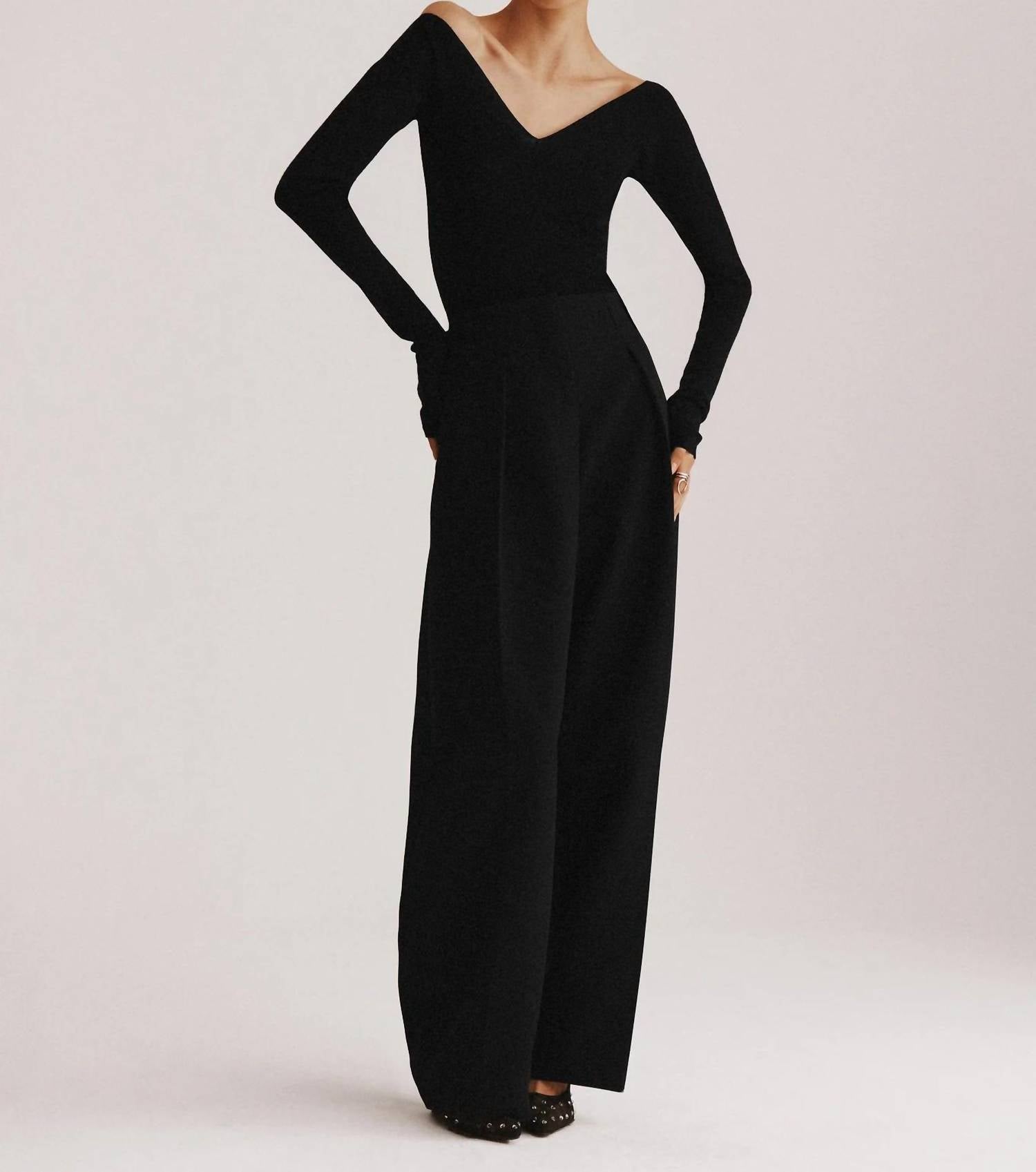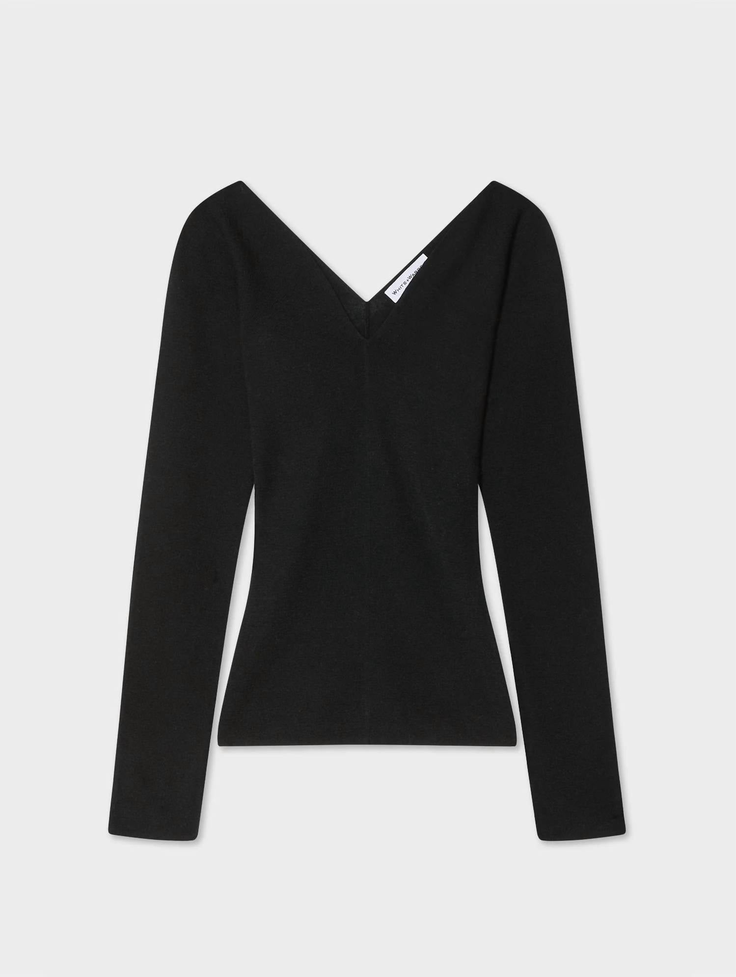 A long sleeve top you can wear with denim, skirts, well... just about anything! Elevate your wardrobe with the Superfine Merino Ribbed V-neck Top by White + Warren, a chic essential in classic black. Designed with long sleeves and a dramatic V-neckline both front and back, this top is crafted from 100% extrafine merino wool for an ultra-soft feel. Measuring 23.5" in length for size small, it ensures a sleek fit while hidden bra keepers add extra security. For care, hand wash cold or opt for dry cleaning, and always reshape and lay flat to dry. Model is 5'8" and wears a size small. Closure: Pull-on.