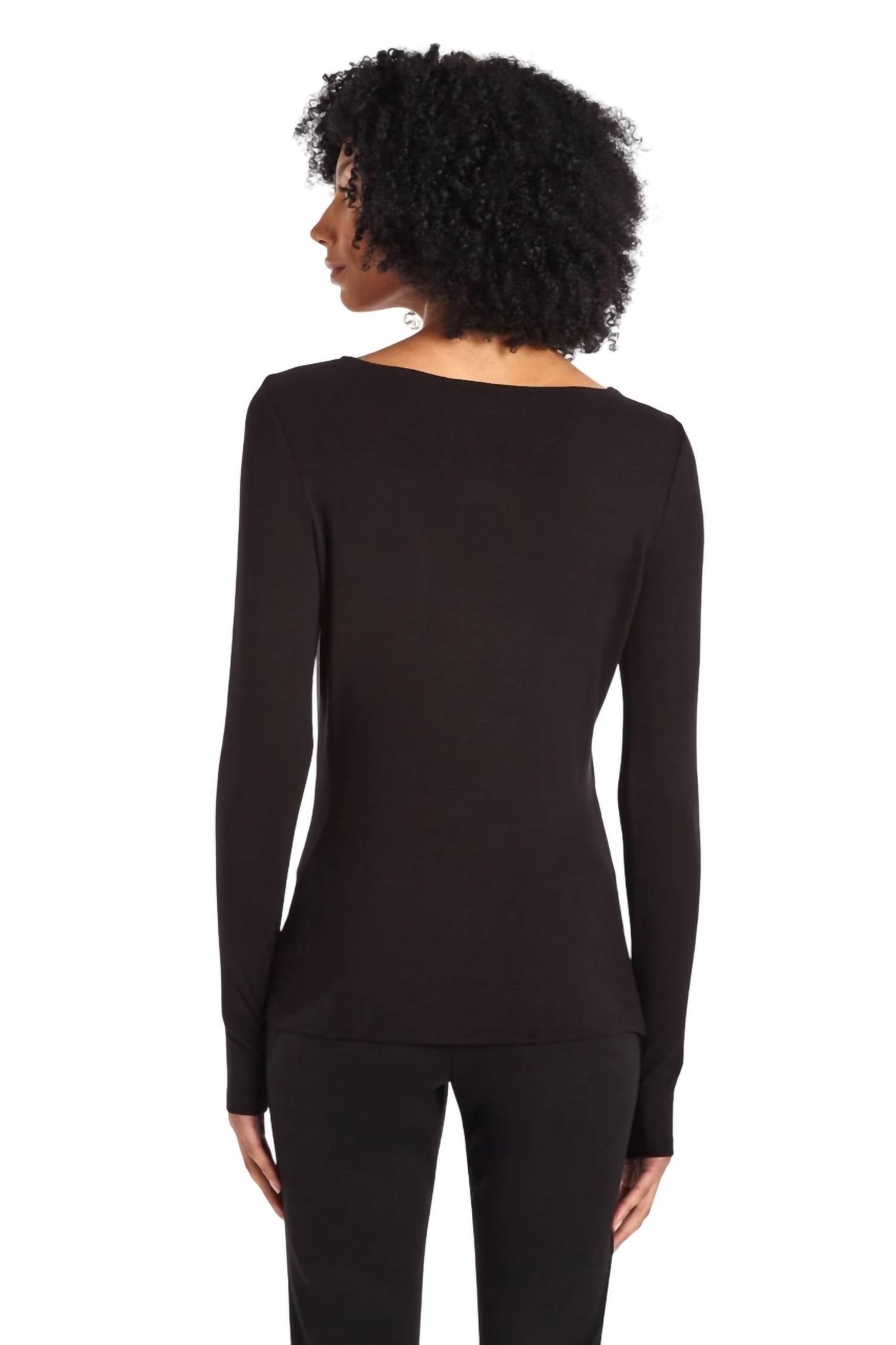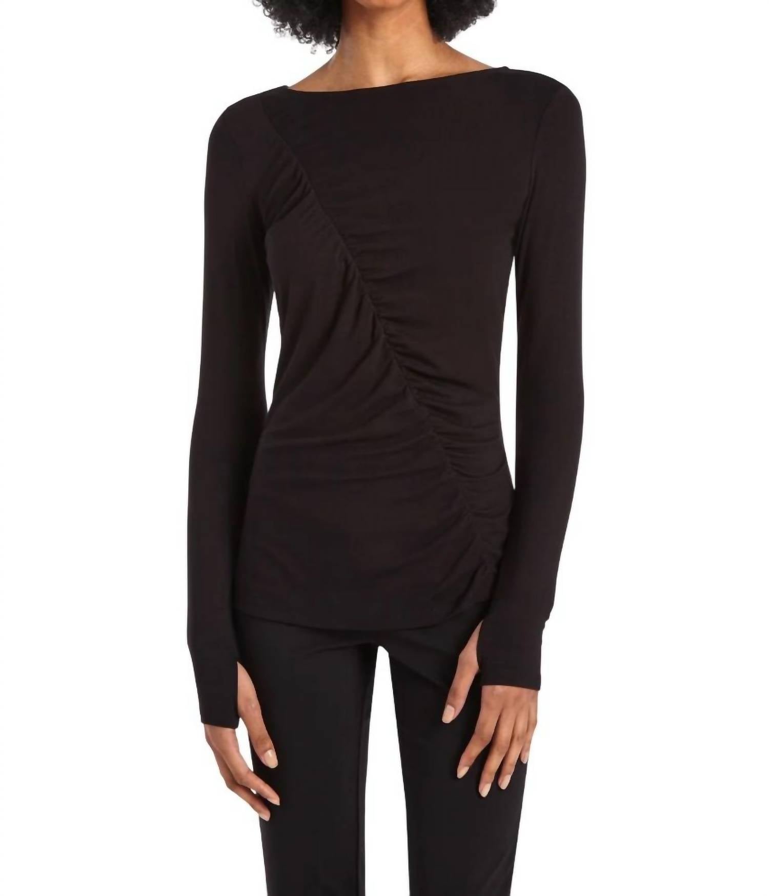 Ruching details. Model is 5'10.5" and is wearing a size small. 90% RAYON, 10% NYLON. Dry clean only. Imported.