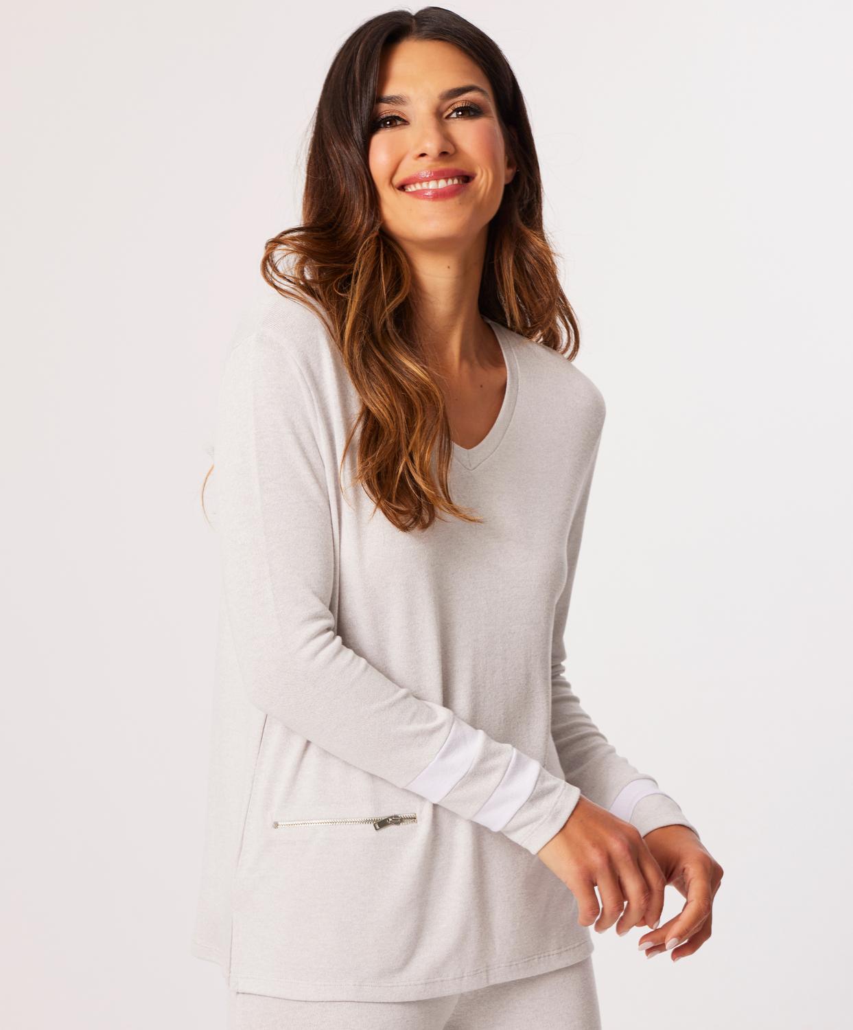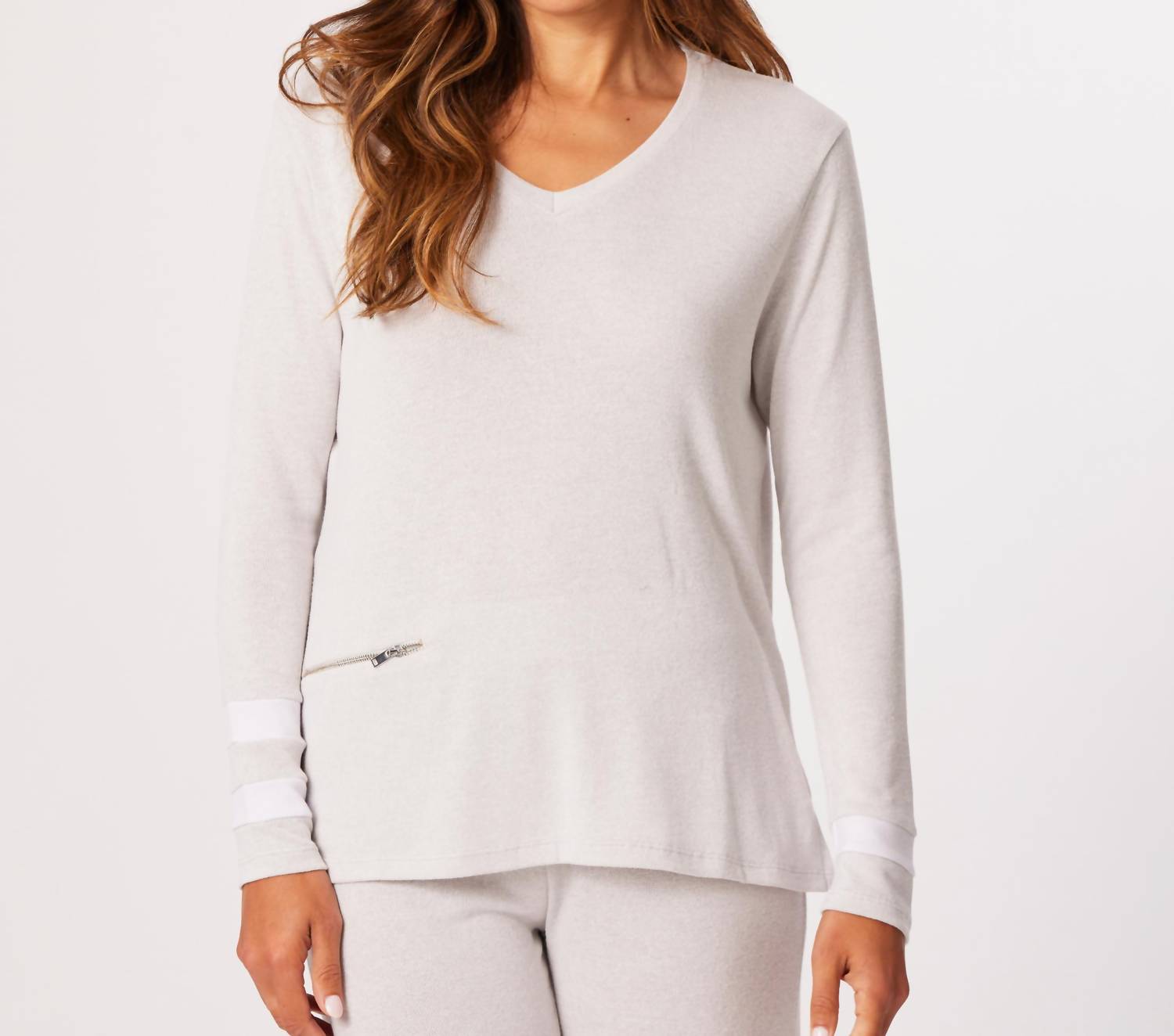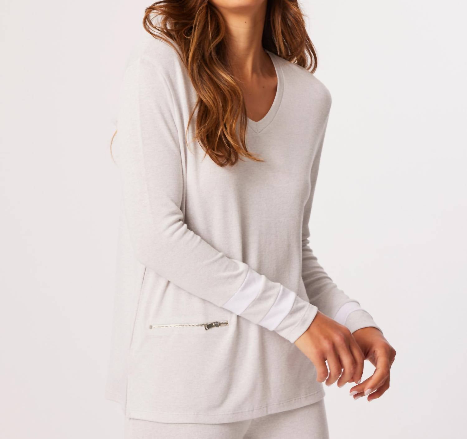Great fit, cute design, soft fabric. You'll love everything about this long sleeve tee. Introducing the Zip Pocket V-Neck Top by French Kyss, a chic choice for a minimalist, patterned look in navy and white. Featuring long sleeves and a pull-on closure, this top offers both style and convenience with its zip pocket detail. Made from a Viscose/Polyester blend, the top hits at the hips and is imported. For care, it is recommended to either delicately hand wash or dry clean. Ideal for a Thanksgiving or dinner party setting, this piece embodies understated elegance.