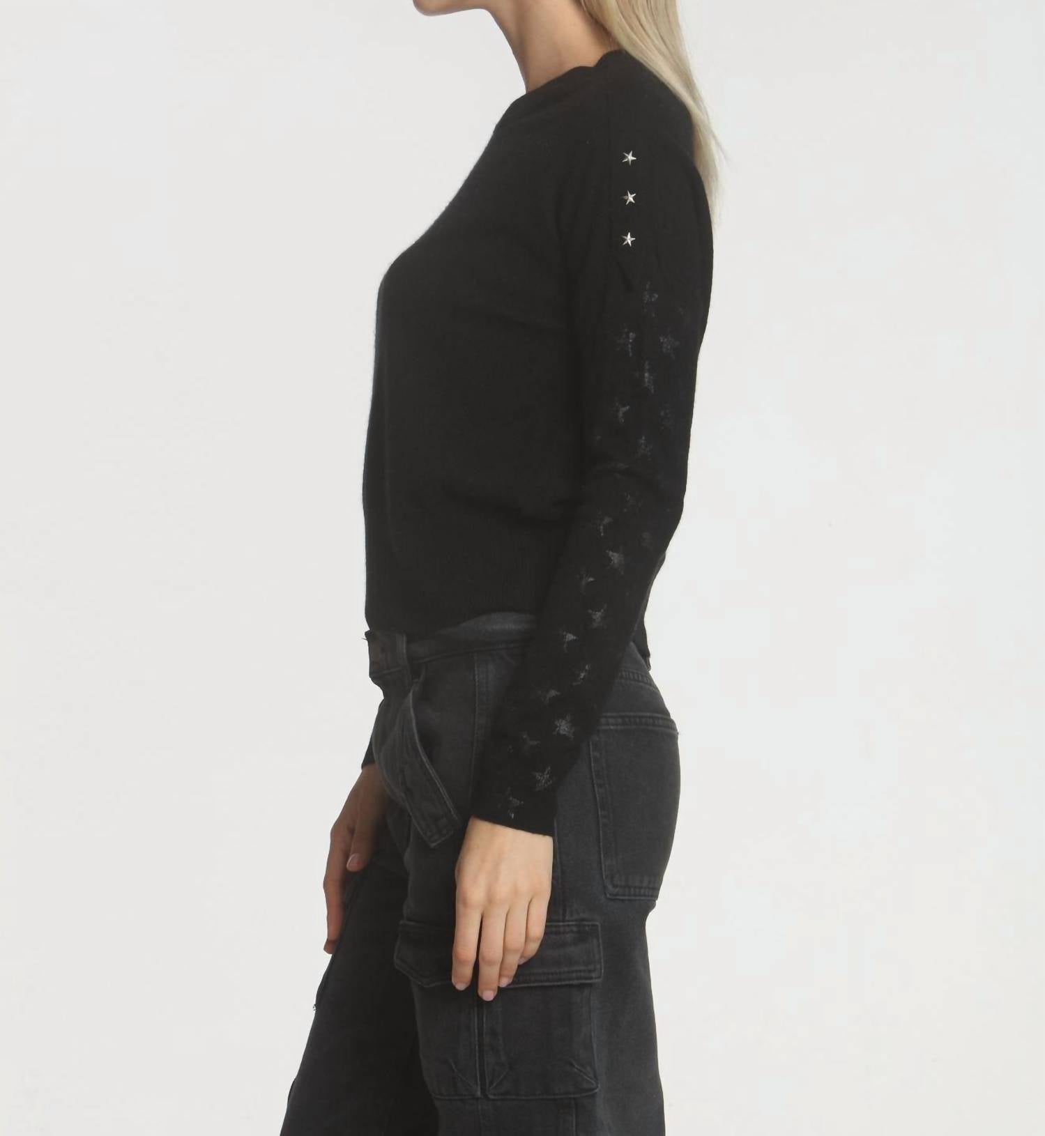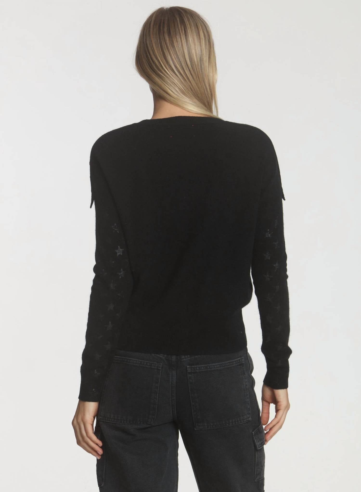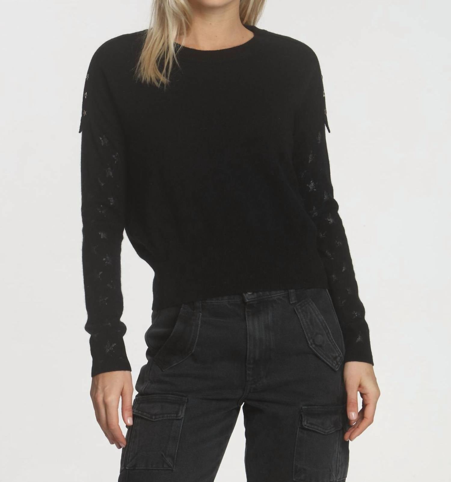 A long sleeve top you can wear with denim, skirts, well... just about anything! Experience the edgy charm of the Women's Zoe Star Stud Top by LABEL+thread, a standout piece in black. This long sleeve tee is crafted from a sumptuous blend of 70% wool and 30% cashmere, featuring a shorter, wide fit adorned with metallic star prints and shoulder studs for a unique flair. Ideal for a casual hangout or an effortless date look, it offers a crew neck and easy pull-on style. Care: Hand wash or dry clean. Size small on model (5'9" height).