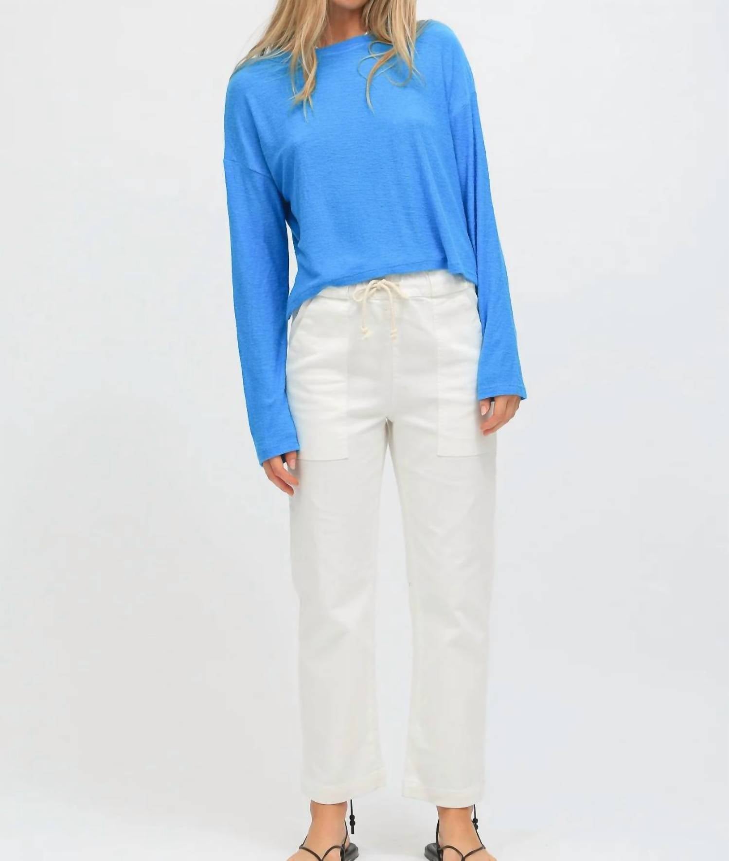 Boxy fit with a slight crop. Scoop neckline. Long sleeves. Pullover style. 61% Rayon, 39% Polyester. Machine washable; tumble dry low. Made in the USA.