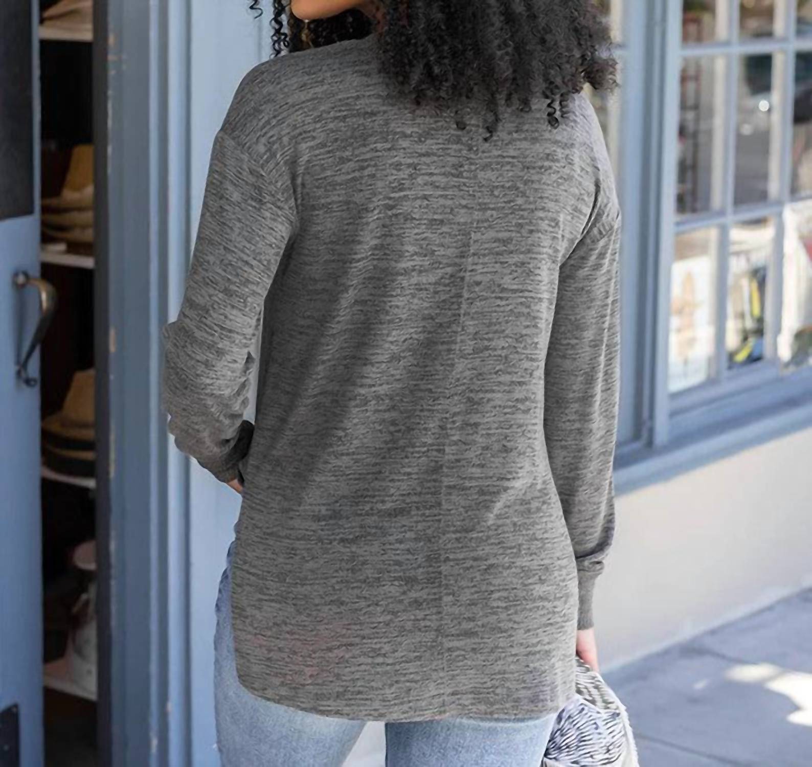 The perfect long sleeve tee that goes with just about anything. Embrace comfort and style with the Snow Day Henley Long Sleeve Top by Grace and Lace, featuring a heathered charcoal hue for an inviting look. This henley top is crafted from the signature ultra-soft 'Snow Day' hacci blend, primarily composed of cozy rayon. Details like ribbed sleeve cuffs and neckline enhance its relaxed fit, while the functional snap closure at the v-neckline adds a practical touch. Perfectly suited for pairing with denim, jeggings, or lounging pants, this piece becomes your versatile go-to for any casual occasion.