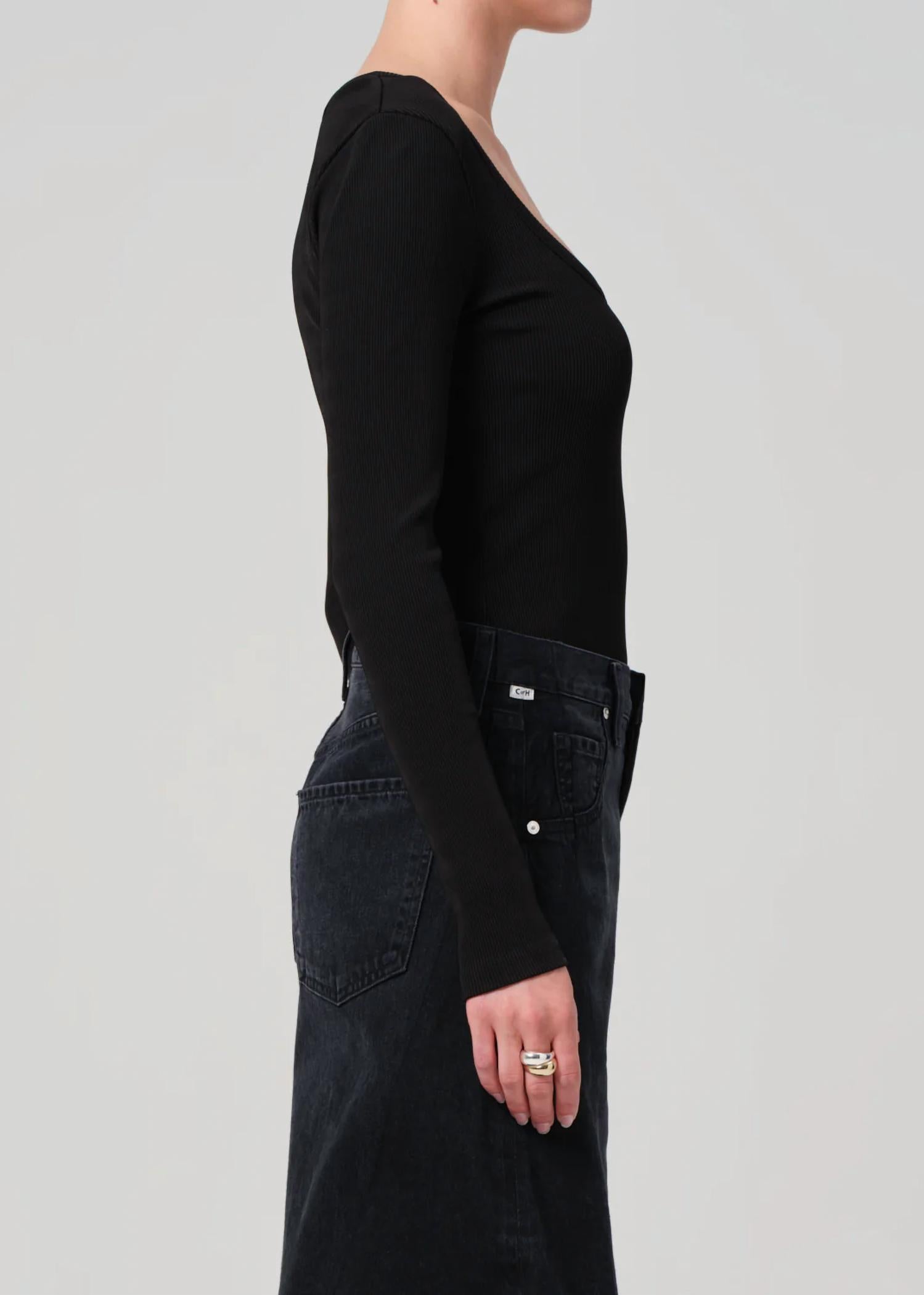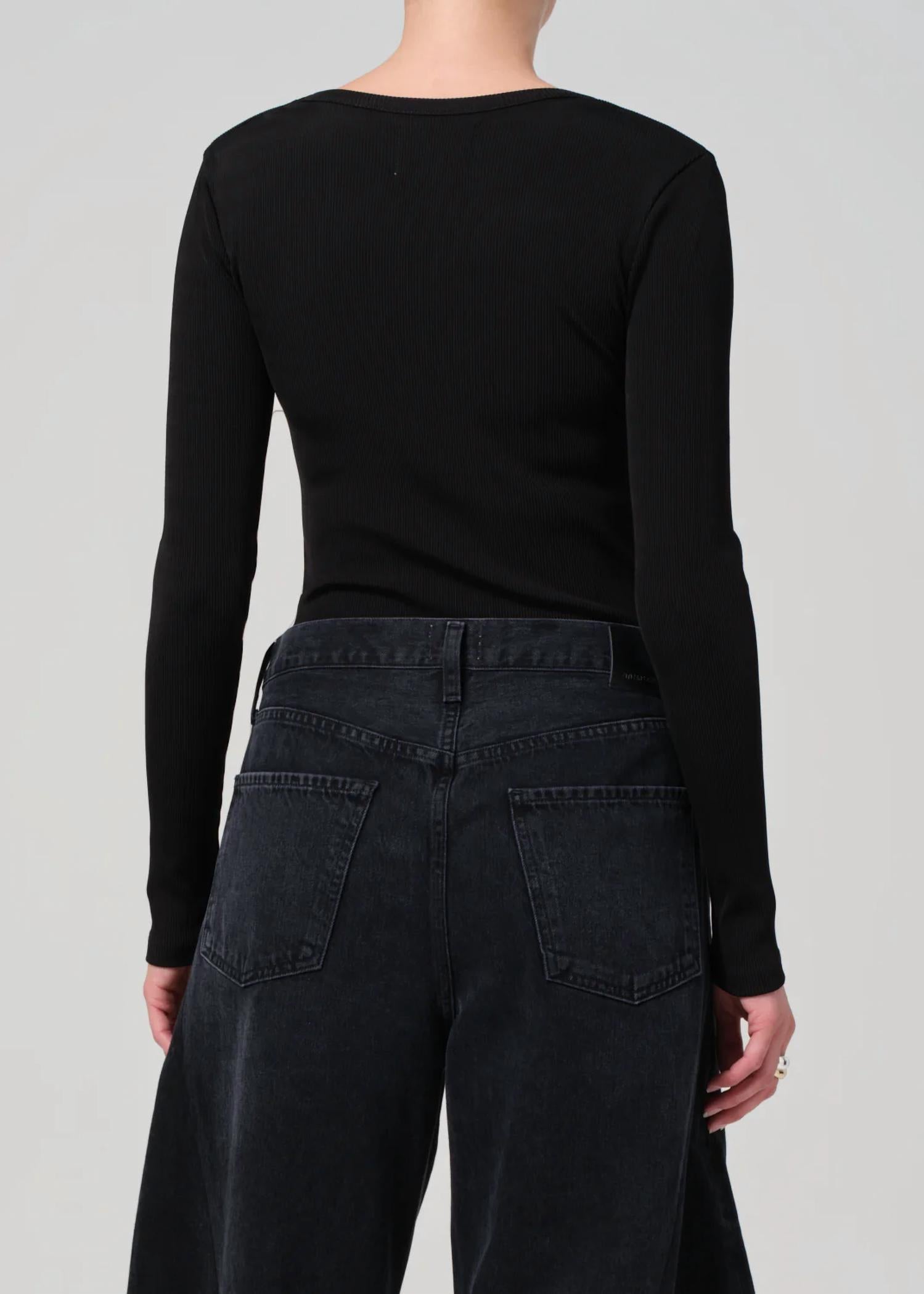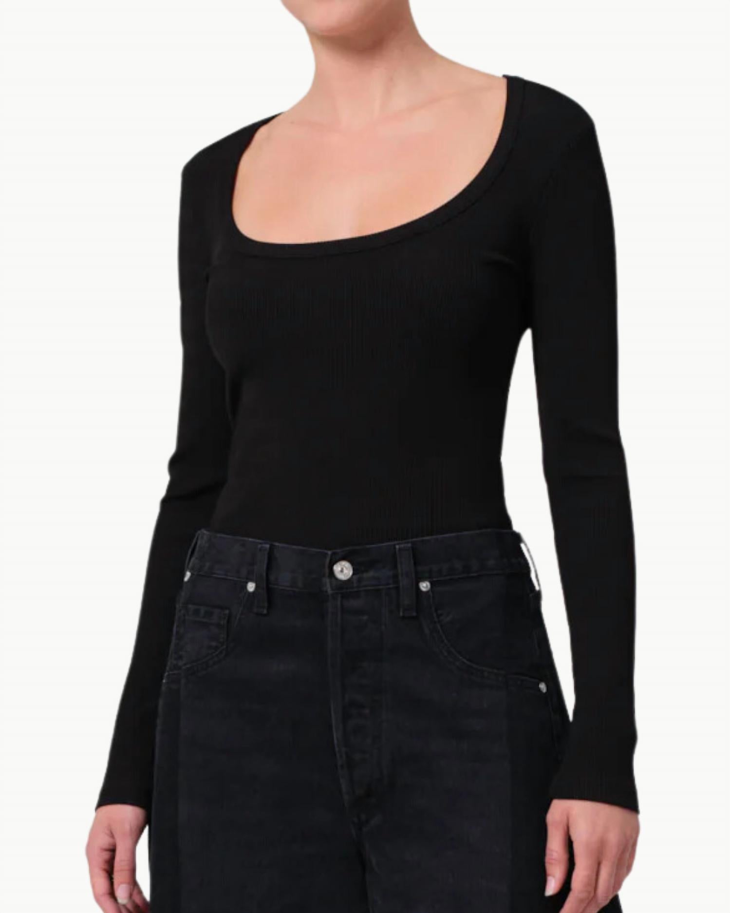 The perfect long sleeve tee that goes with just about anything. Introducing the Rumi Scoop Neck by Citizens of Humanity, crafted from a comfortable blend of 90% Viscose, 5% Polyamide, and 5% Elastane. This long sleeve tee features a dramatic scoop neck and textured pattern that adds effortless style to your wardrobe. Designed for women with a form-fitting silhouette that retains its stretch, this top does not include a closure, ensuring a seamless look. Available in classic black, it embodies sophisticated craftsmanship.