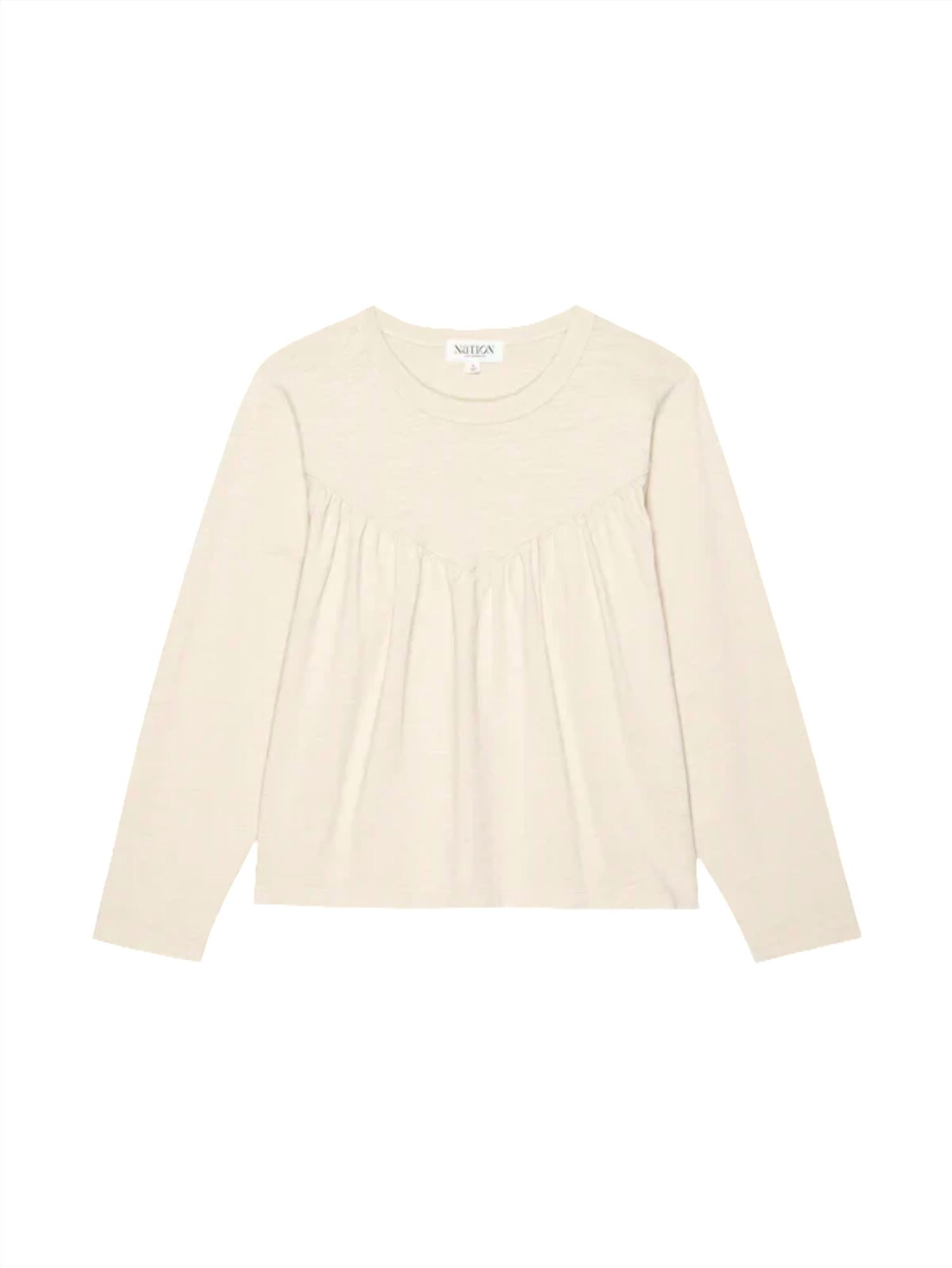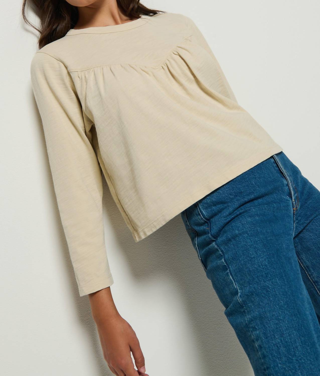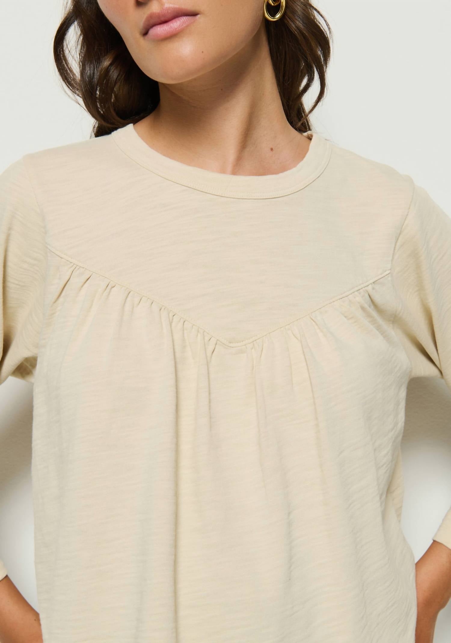 Great fit, cute design, soft fabric. You'll love everything about this long sleeve tee. Elevate your wardrobe with the Mona Bracelet Sleeve Tee from Nation LTD, rendered in an elegant Parchment hue. This solid, three-quarter sleeve, crewneck tee is made from comfortable 100% Peruvian Cotton, offering a minimalist baby doll design that flares slightly for a flattering fit. Crafted in Peru, this pull-on top requires machine washing and line drying for easy care. Make it your go-to piece for any holiday party this spring.