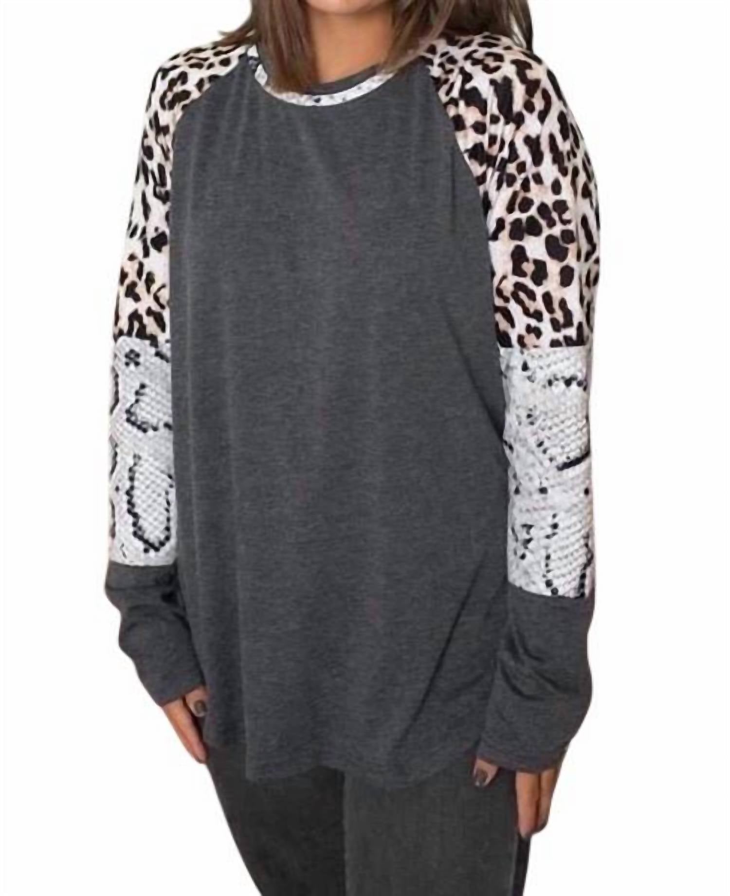 This top features a round neck. Solid grey body. Leopard and snake skin raglan sleeves. Rounded hemline. The fabric is soft and stretchy. Small bust 38" length 27". Medium bust 41" length 27". Large bust 44" length 27". XL bust 47" length 28". 2XL bust 50" length 28". 3XL bust 53" length 28". 65% polyester 30% cotton 5% spandex. Lightweight stretchy fabric. Hand wash cold.