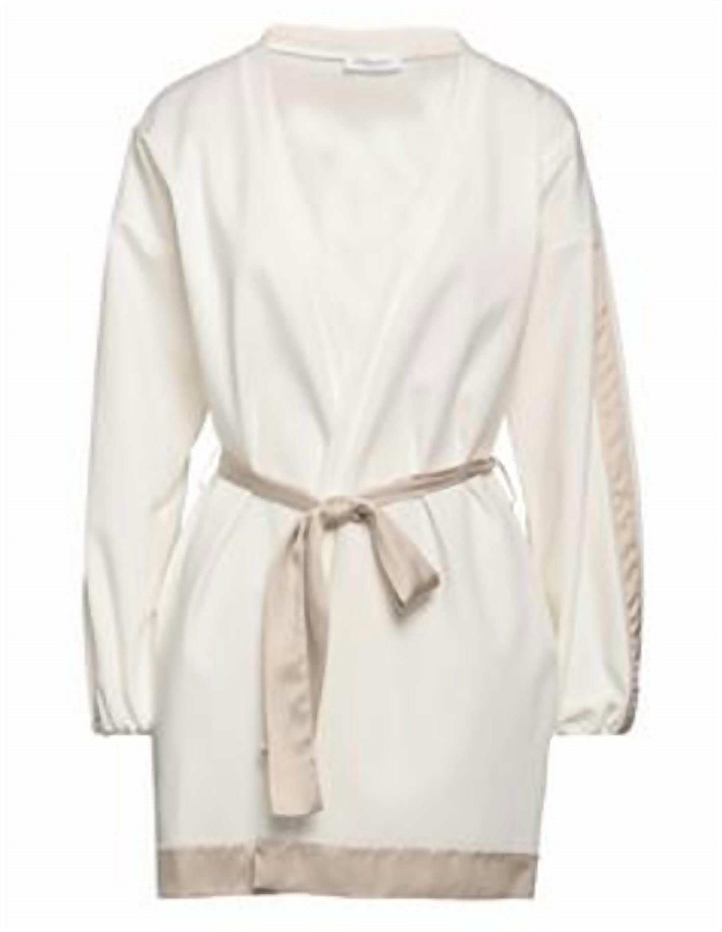 Great fit, cute design, soft fabric. You'll love everything about this long sleeve tee. Two-tone kimono-style piece crafted from a combination of satin and jersey fabrics, offering a soft feel with comfortable stretch. Features a deep neckline, long sleeves, and a coordinating belt to cinch the waist. Designed without pockets for a streamlined silhouette, and includes subtle brand detailing. Made from a stretch fabric blend of 52% cotton, 40% polyamide, 8% elastane, and viscose for ease of movement and a refined drape.