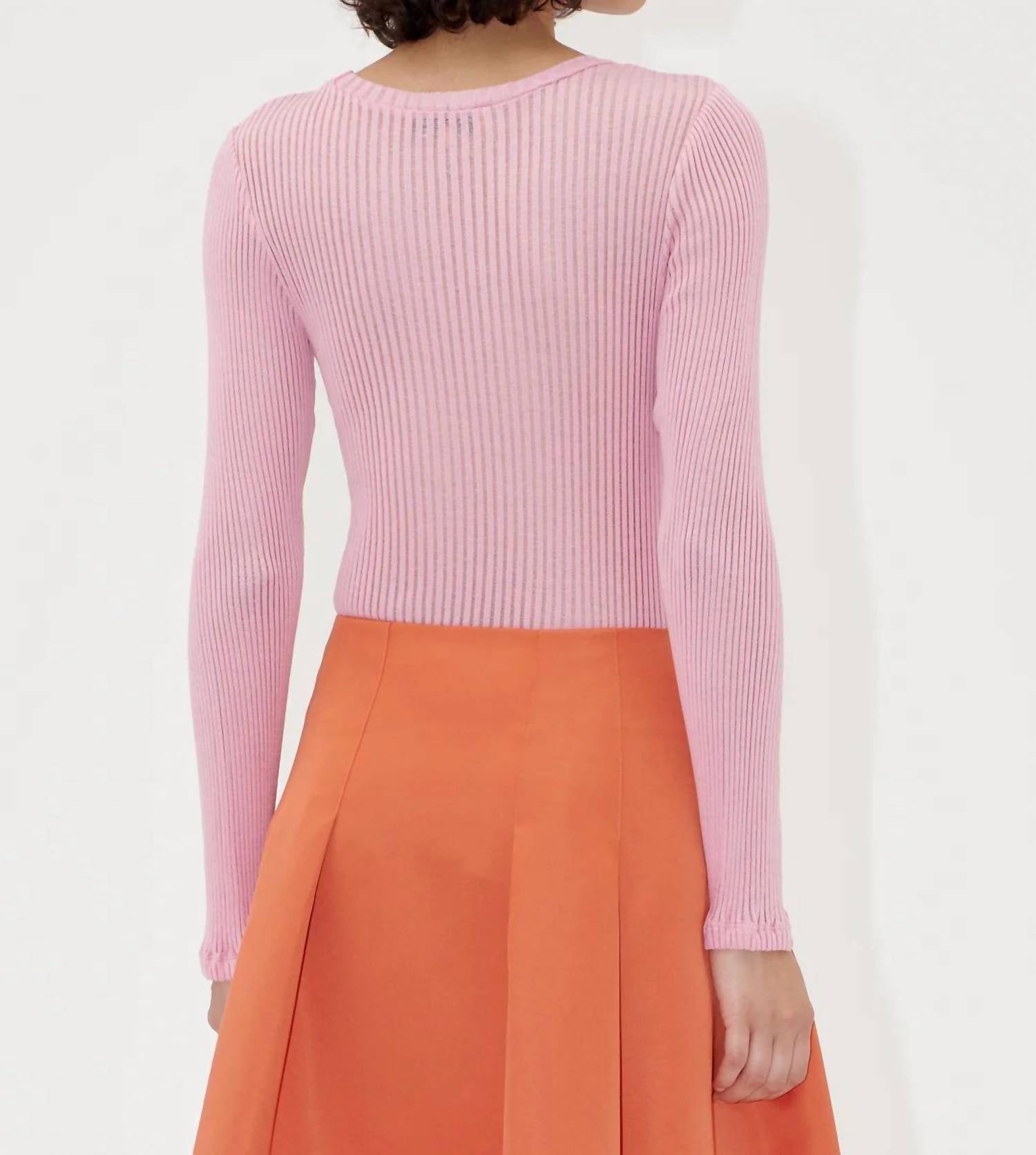 Great fit, cute design, soft fabric. You'll love everything about this long sleeve tee. Unveil your sophisticated style with the Lux Seamless Long Sleeve Crewneck Top by STINE GOYA, crafted in a delicate Pink Nectar hue perfect for any dinner party. This women's top is designed with long sleeves and features a semi-sheer ribbed silk blend fabric, providing a touch of elegance through its crinkled hem and subtle logo detail. Composition boasts 70% Silk and 30% Cotton, ensuring both comfort and luxury. Closure Type: Pull on. Care Instructions: Hand wash and line dry for lasting style.