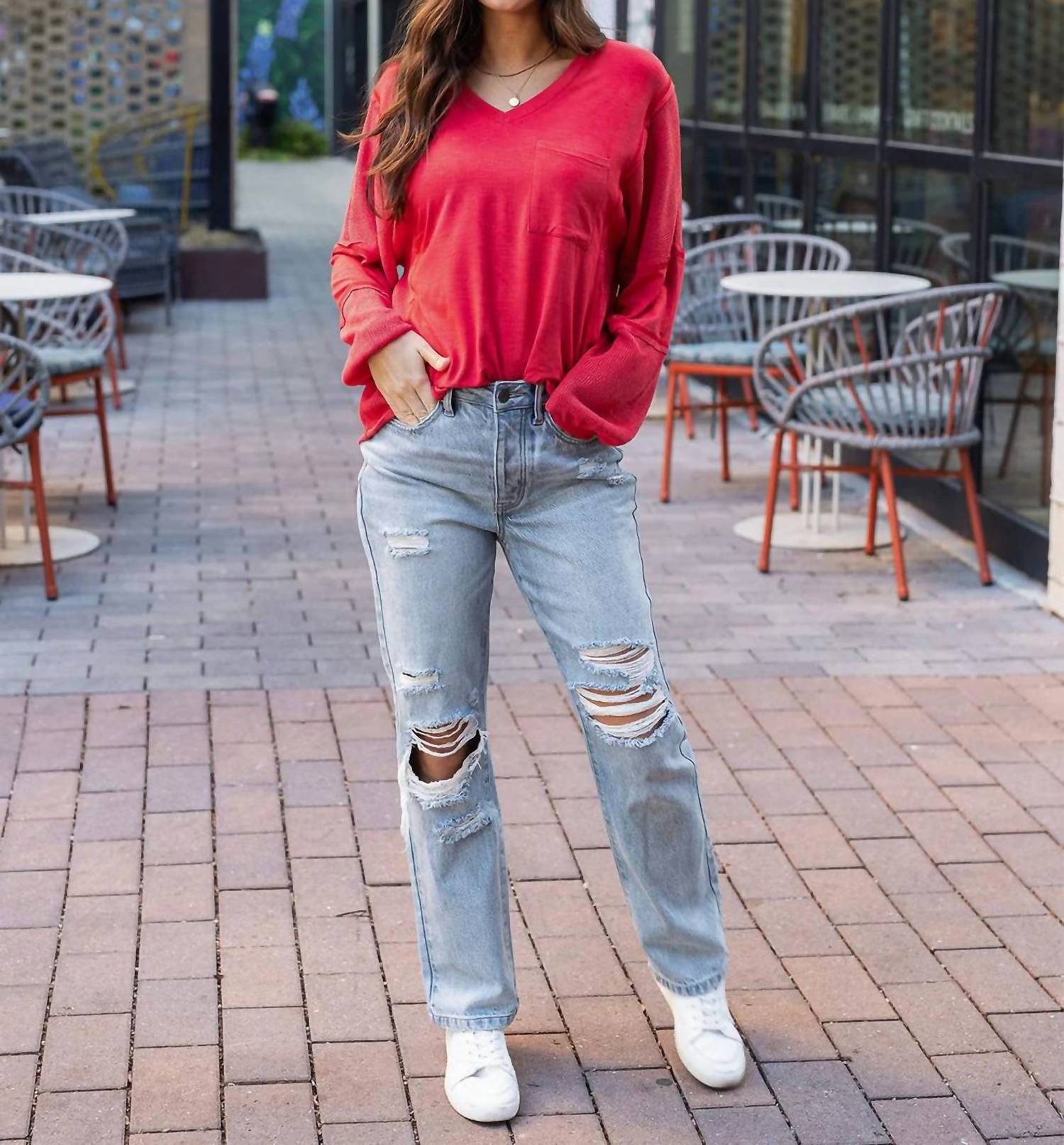 The perfect long sleeve tee that goes with just about anything. Perfect blend of style and comfort crafted for women in a vibrant poppy hue. Made from a soft and stretchy blend of 95% rayon and 5% spandex. Boasting a trendy V-neck and practical open chest pocket. Mixed material design incorporates subtle sweater knit accents alongside the jersey knit, ensuring an eye-catching and cozy fit. With a convenient pull-on closure. Best cared for with hand wash instructions, making it an ideal addition for your travel and everyday wear this fall.