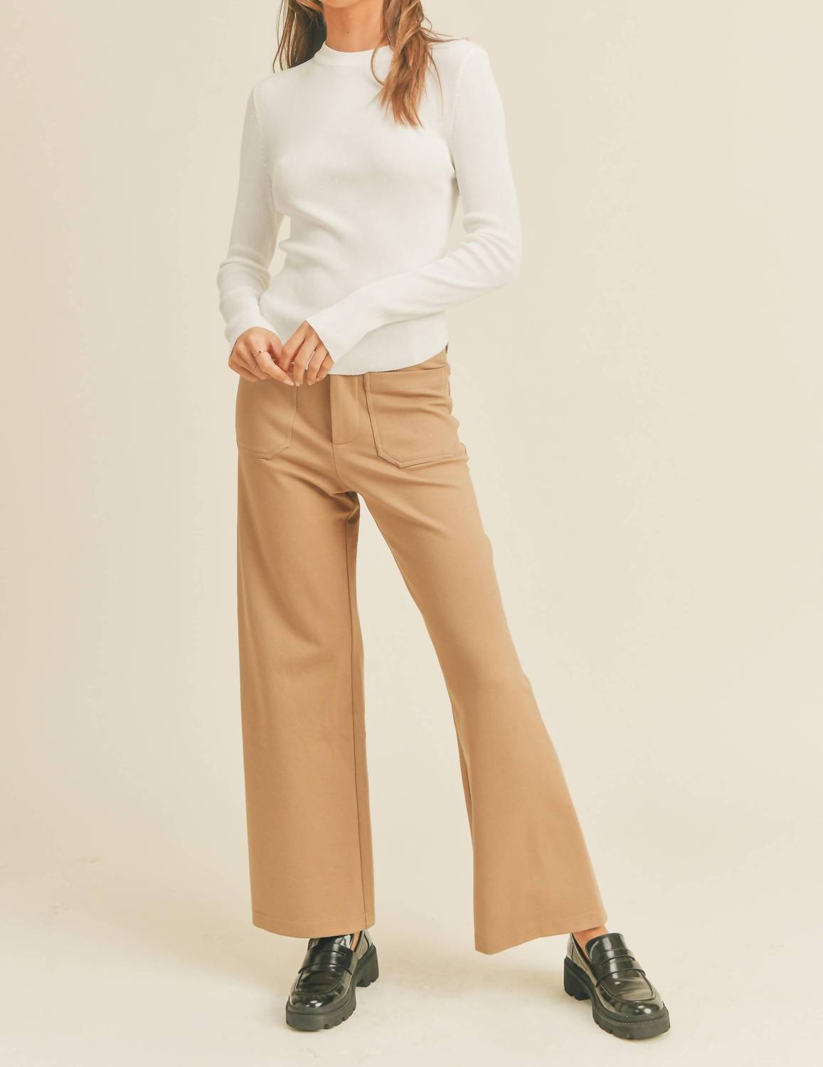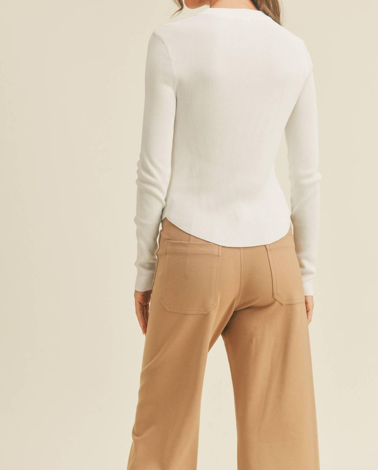 The perfect long sleeve tee that goes with just about anything. Experience the comfort of the Ribbed Long Sleeve Top by MIOU MUSE, perfect for fall and holiday parties. Crafted from soft cotton, this minimalist top in solid white offers a basic yet stylish look with its crewneck design. The pull-on closure ensures easy wear, making it an essential piece for any casual occasion. Although care instructions are not provided, it is designed with a focus on effortless style and versatility for the modern woman.