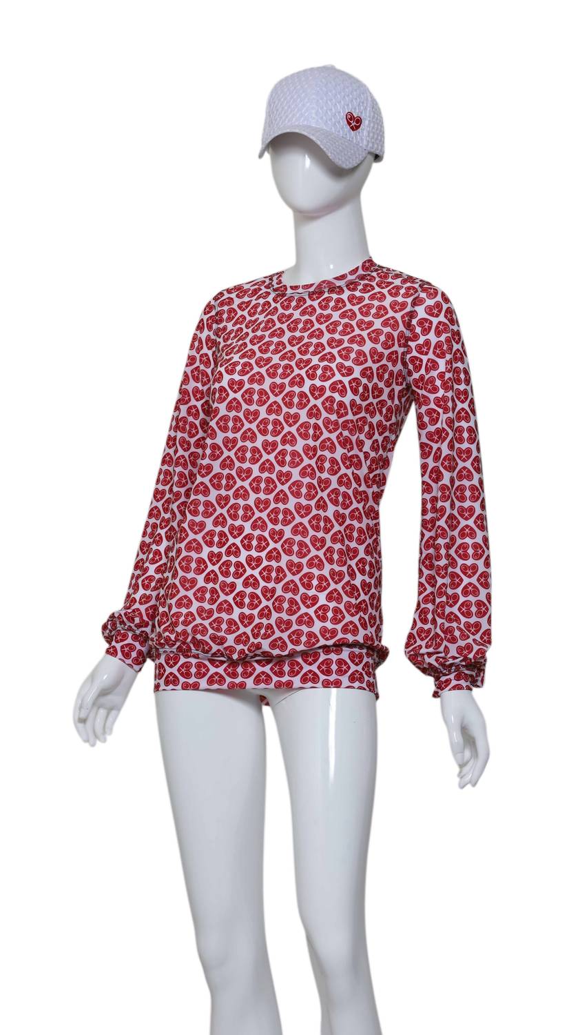 A long sleeve top you can wear with denim, skirts, well... just about anything! Stay stylish and comfortable with the Women's Soft Long Sleeve Warm Up Top by Love Love Tennis, designed for activewear and game day. Featuring a long sleeve design and a patterned raspberry red hearts on white fabric, this top boasts a crewneck for a comfortable fit. Crafted with a super soft yet warm composition, it's beautifully created in Los Angeles. Closure: Pull on. Care Instructions: Machine wash and line dry.