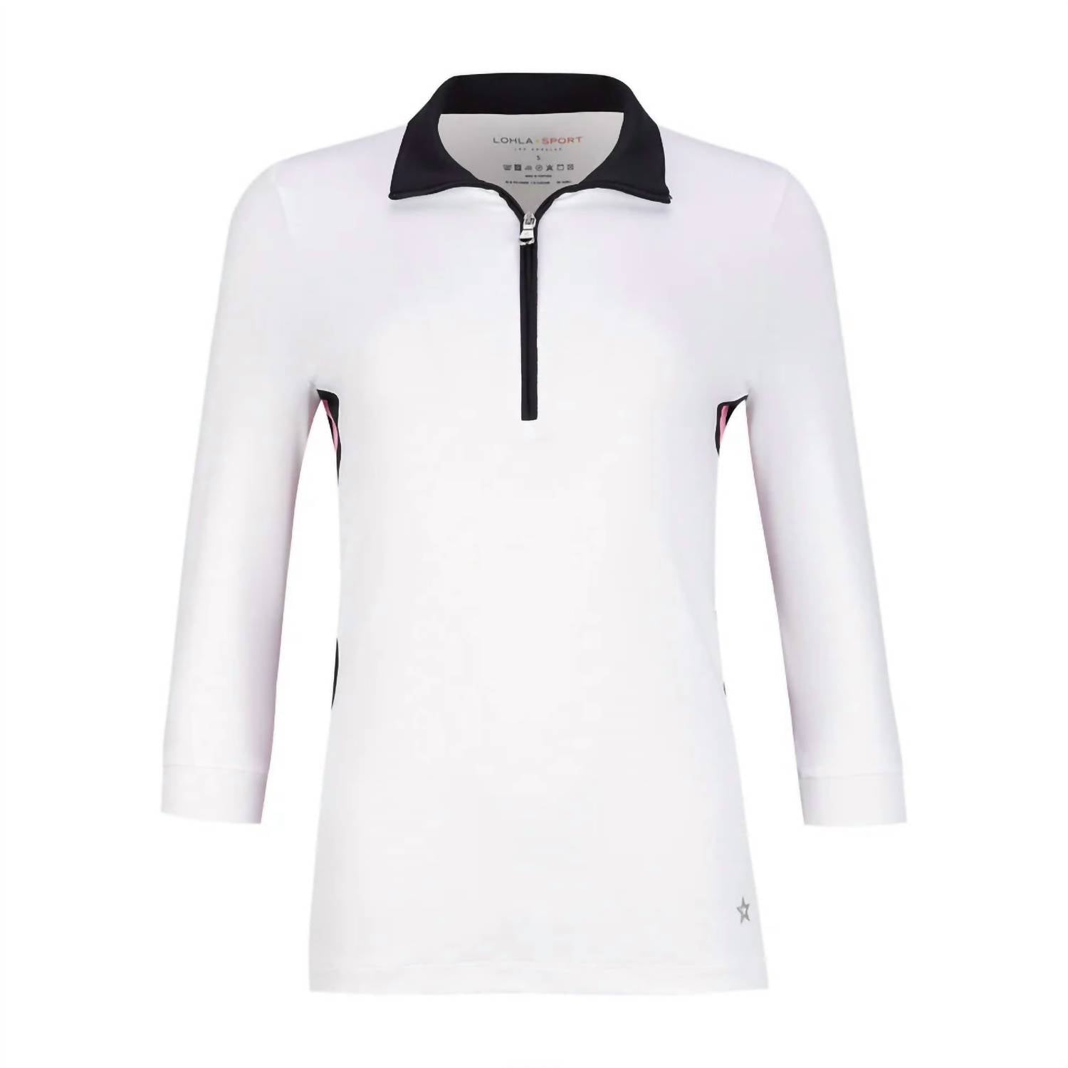 Great fit, cute design, soft fabric. You'll love everything about this long sleeve tee. This sporty 3/4 sleeve top is crafted from dry luxe fabric for a breathable, performance-ready feel. Featuring a zip-up collar with a navy interior and contrast sport stripes in navy and cotton candy down the sides, it adds visual flair to a classic silhouette. Designed with SPF 35 protection, it’s perfect for active days in the sun. Composition: 95% Polyamide, 5% Elastane.