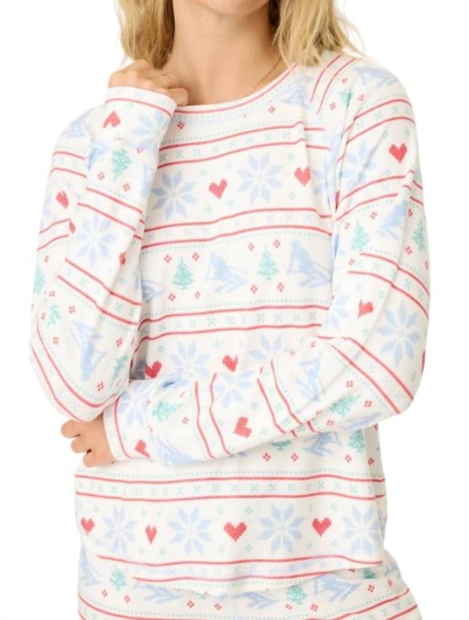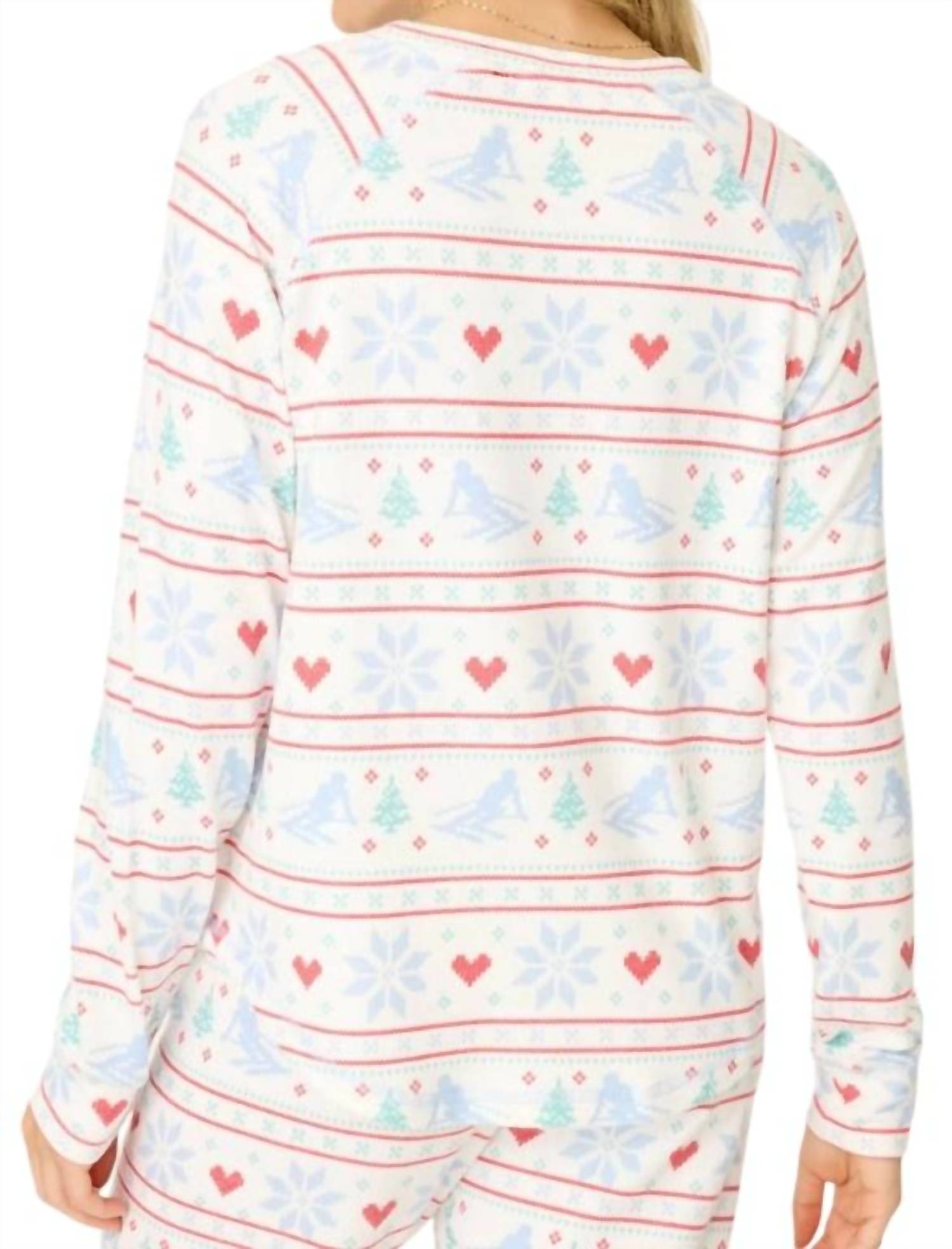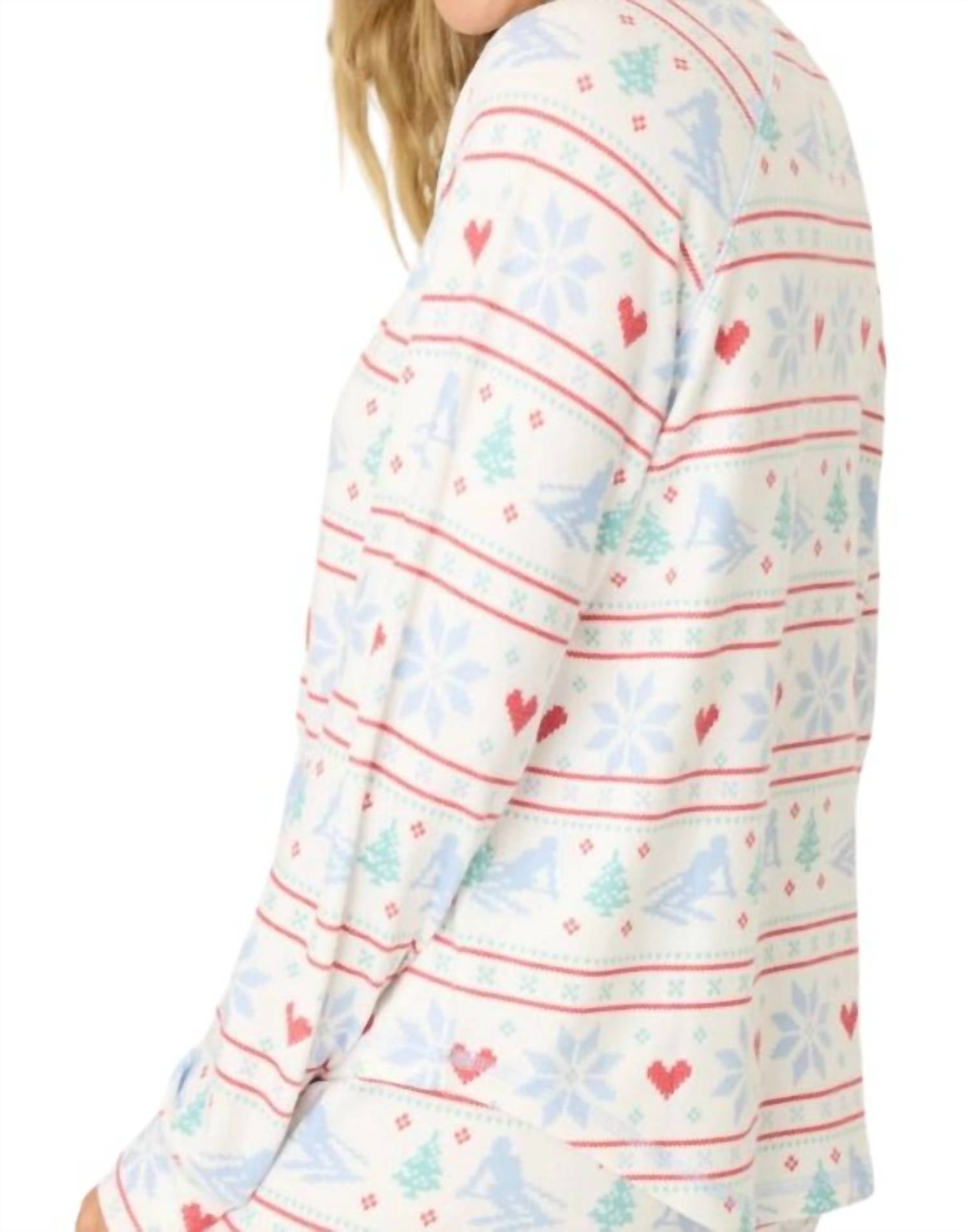 Experience cozy winter comfort with the Apres All Day Long Sleeve Top by PJ Salvage. This women's top features long sleeves and a playful ski-theme pattern, made from a soft and breathable heavy peachy jersey composition of 81% Polyester, 14% Rayon, and 5% Elastane. Country of origin: Imported. Closure type: Pull on. Care instructions: Turn garment inside out, machine wash cold.