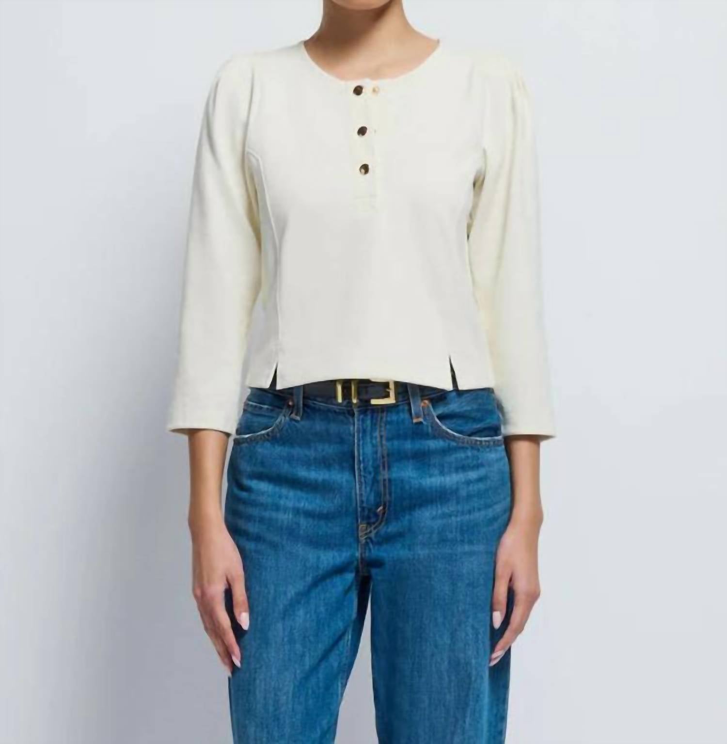 Classic relaxed Henley style. Crew neckline for comfort. Elbow-length sleeves for a relaxed fit. Side inserts for added style. Front closure with signature gold snaps. Made from 100% organic Peruvian cotton.