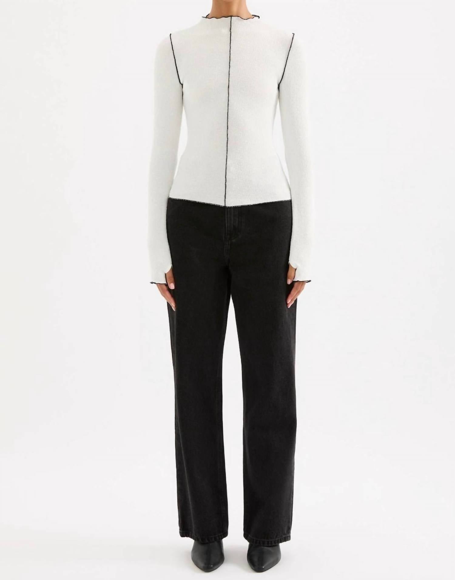Great fit, cute design, soft fabric. You'll love everything about this long sleeve tee. Discover the Xander Long Sleeve Top by Nude Lucy, a minimalist piece perfect for your spring wardrobe in a chic white shade. This women's top features a mockneck with a raised neckline and contrast stitching, complete with baby locked neckline, center front seam, and hems. Crafted from a comfortable blend of 97% Polyester and 3% Elastane, offering a pull-on closure for easy wear. Care: Hand wash and lay flat to dry.