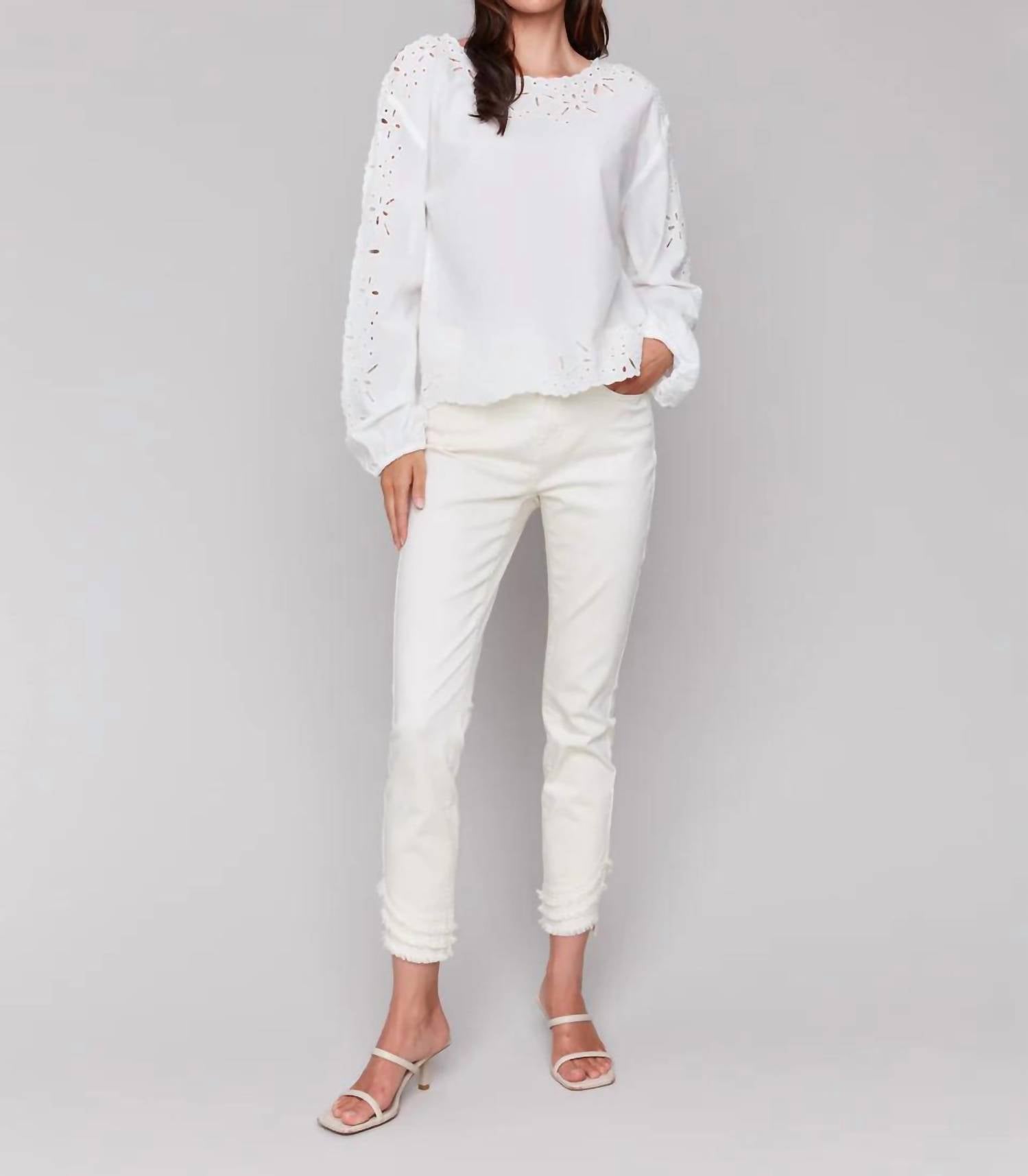 Great fit, cute design, soft fabric. You'll love everything about this long sleeve tee. The Candice Eyelet Top by CHARLIE B is an elegant addition to your summer wardrobe with its long sleeves and sophisticated eyelet design. Crafted from 100% cotton, this white blouse offers a minimalist yet refined look, ideal for holiday parties. Closure is pull-on, originating from Charlie B's dedication to comfortable yet chic designs. Care is simple with machine wash in cold, hang to dry, iron on low, or dry clean if needed.
