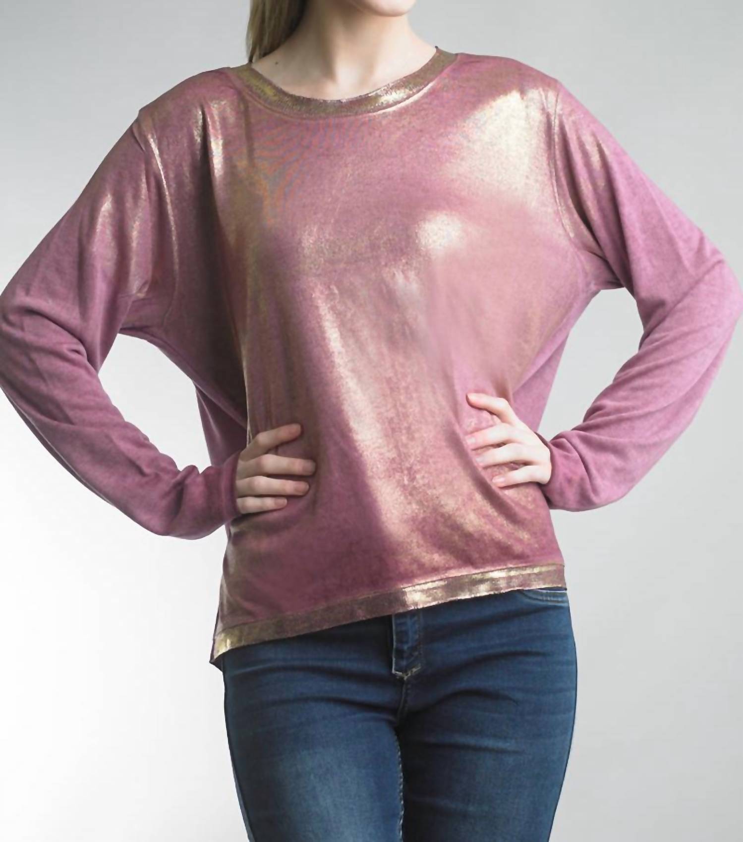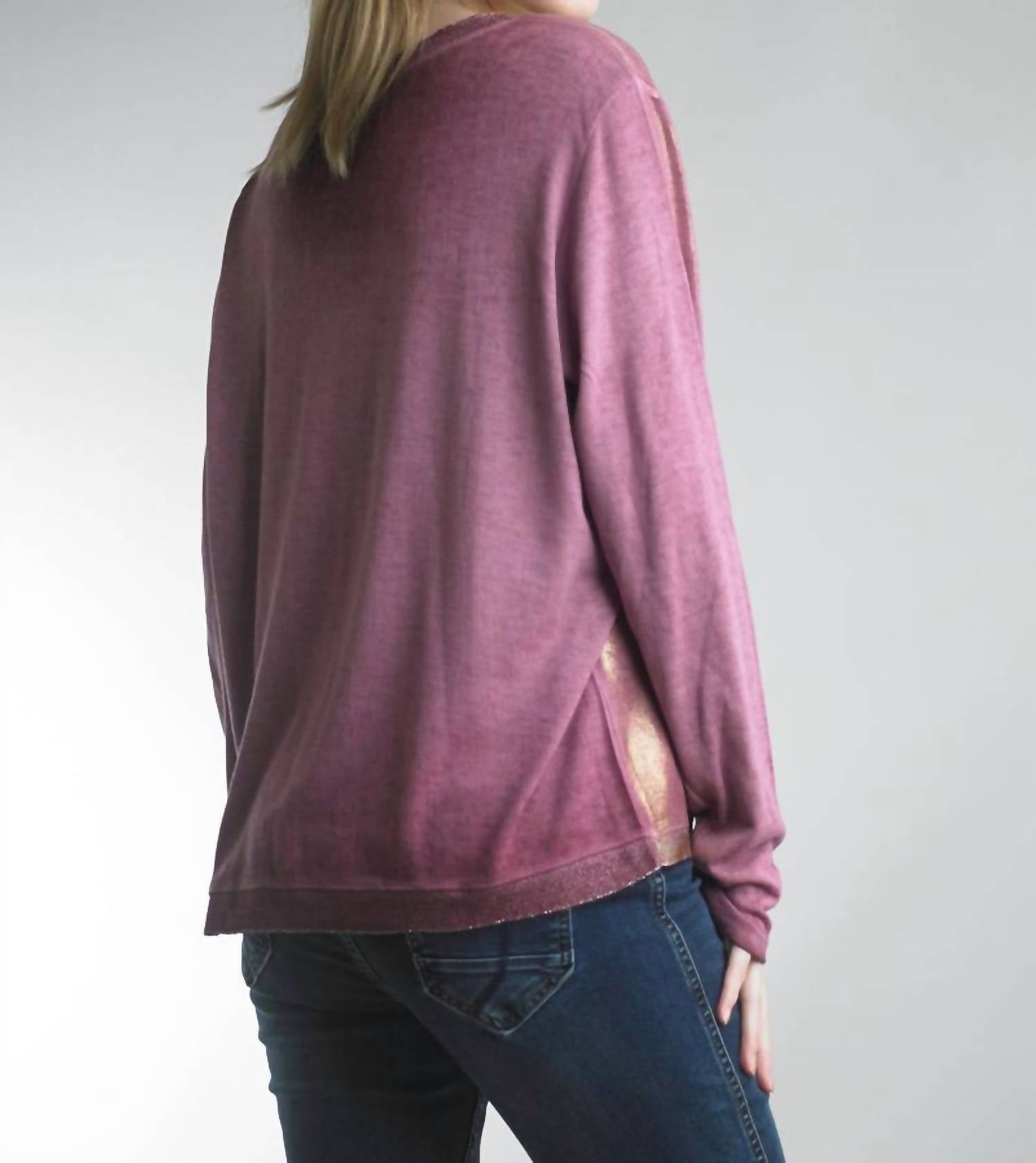 A long sleeve top you can wear with denim, skirts, well... just about anything! Elevate your style with the Tempo Paris Bordeaux Gold Painted Long Sleeve Tee, a stunning piece perfect for any wardrobe upgrade. Featuring long sleeves with elegant gold paint splatter specks on the front, this crew neck tee embraces a drop shoulder and relaxed fit design. Crafted from a luxurious blend of 60% Viscose, 30% Polyester, and 5% Elastane, this top is made in Italy, ensuring top-notch quality. Available in sizes S-XL, with the color Bordeaux offering a sophisticated everyday glamour.