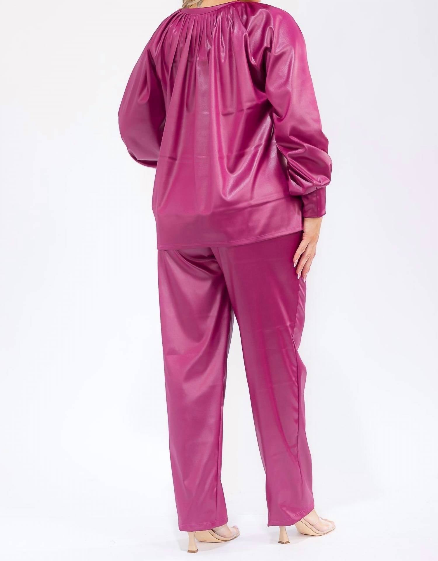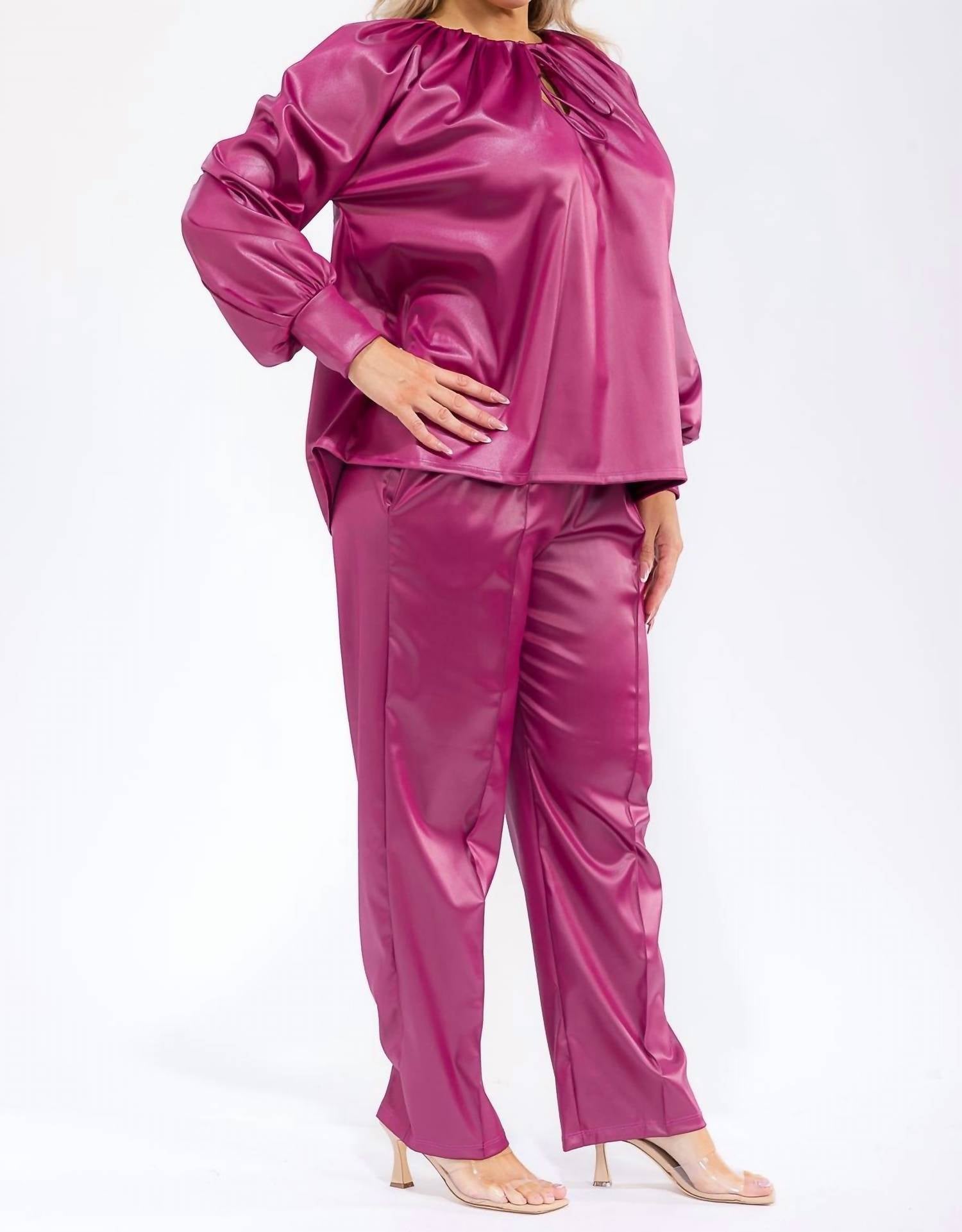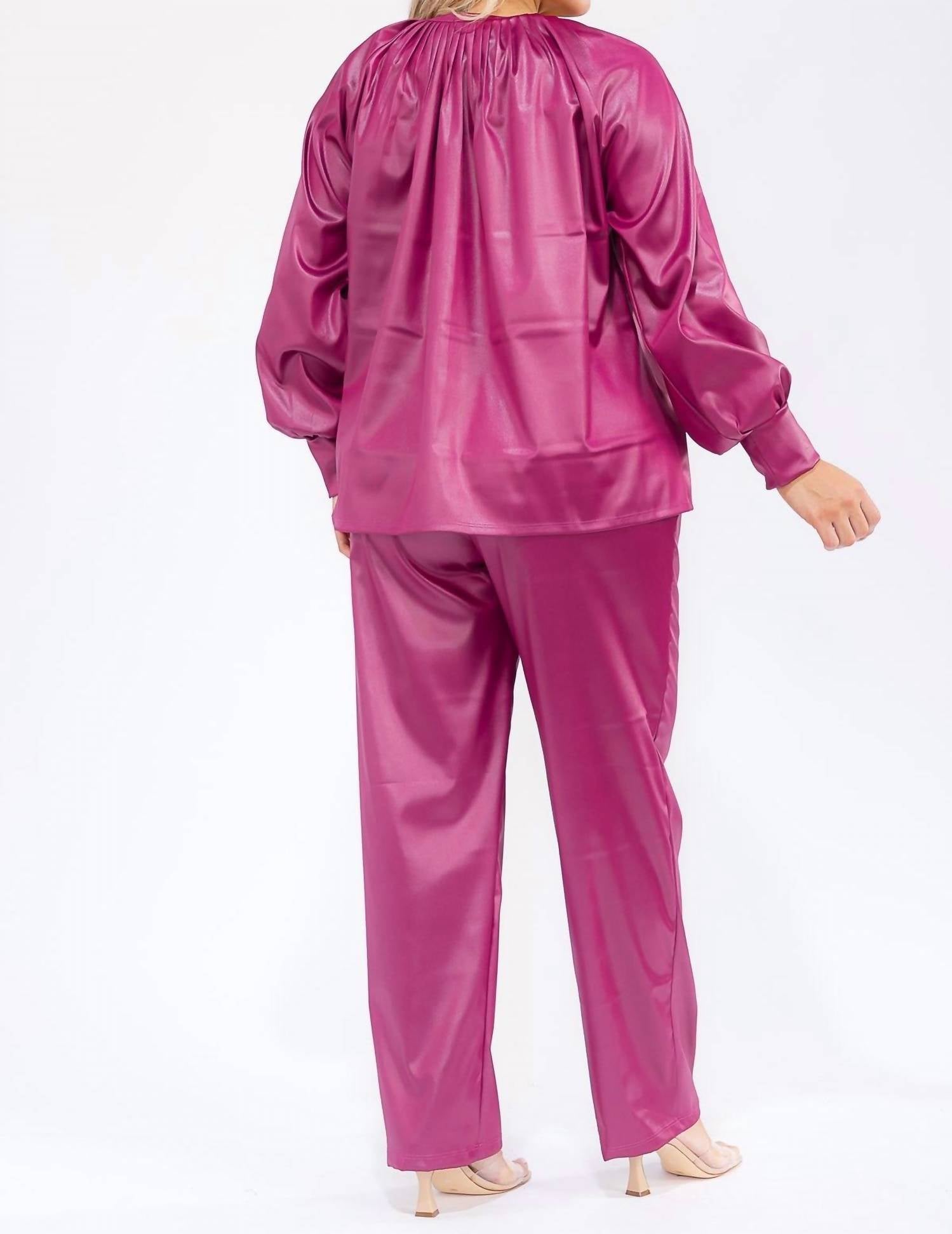 A long sleeve top you can wear with denim, skirts, well... just about anything! Designed for a chic travel look. Two-piece set in metallic pink features a relaxed oversized shirt with long voluminous sleeves, a gathered crewneck, and a sophisticated tie closure. Coordinating pants offer an elastic waist for comfort and a slight sheen for style. Created from solid polyurethane fabric. Hand wash. Ideal for the minimalist traveler embracing fall fashion.