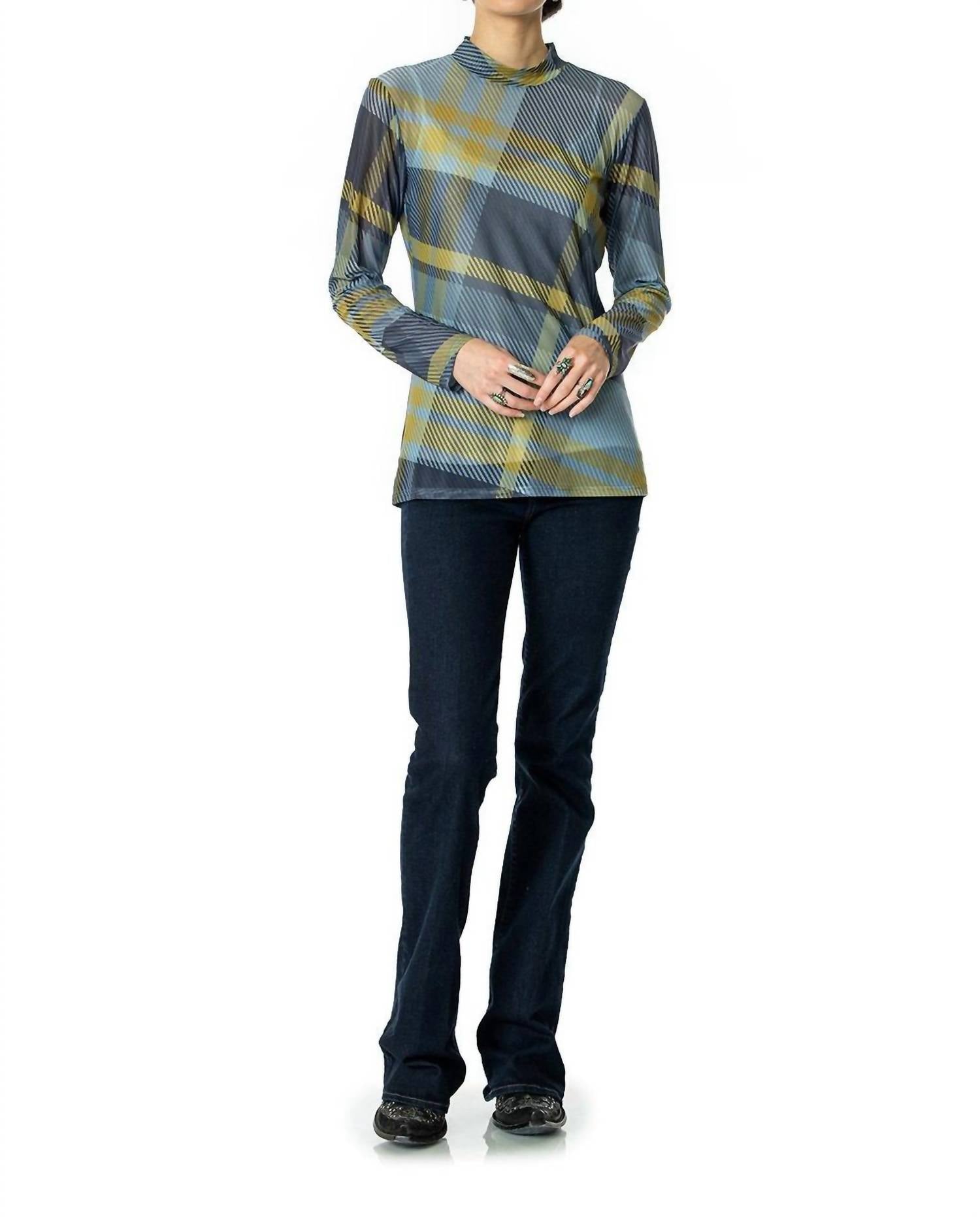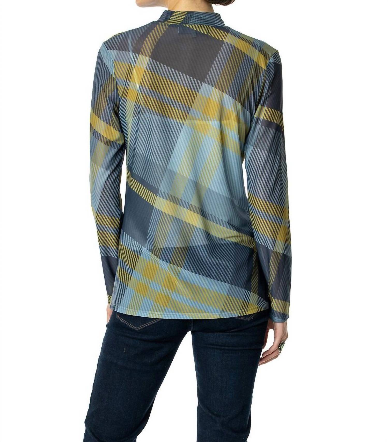 Great fit, cute design, soft fabric. You'll love everything about this long sleeve tee. Introducing the Rodger Plaid Tee Top by Double D Ranch, a stylish addition to your wardrobe in a bold grey and yellow plaid. This women's tee features a long sleeve design with a mockneck, perfect for layering under your favorite jackets and vests. Made from 100% nylon, it offers a slim fit and a comfortable pull-on closure. Enjoy the unique charm of its slightly askewed plaid pattern that adds just the right amount of attitude to any outfit.