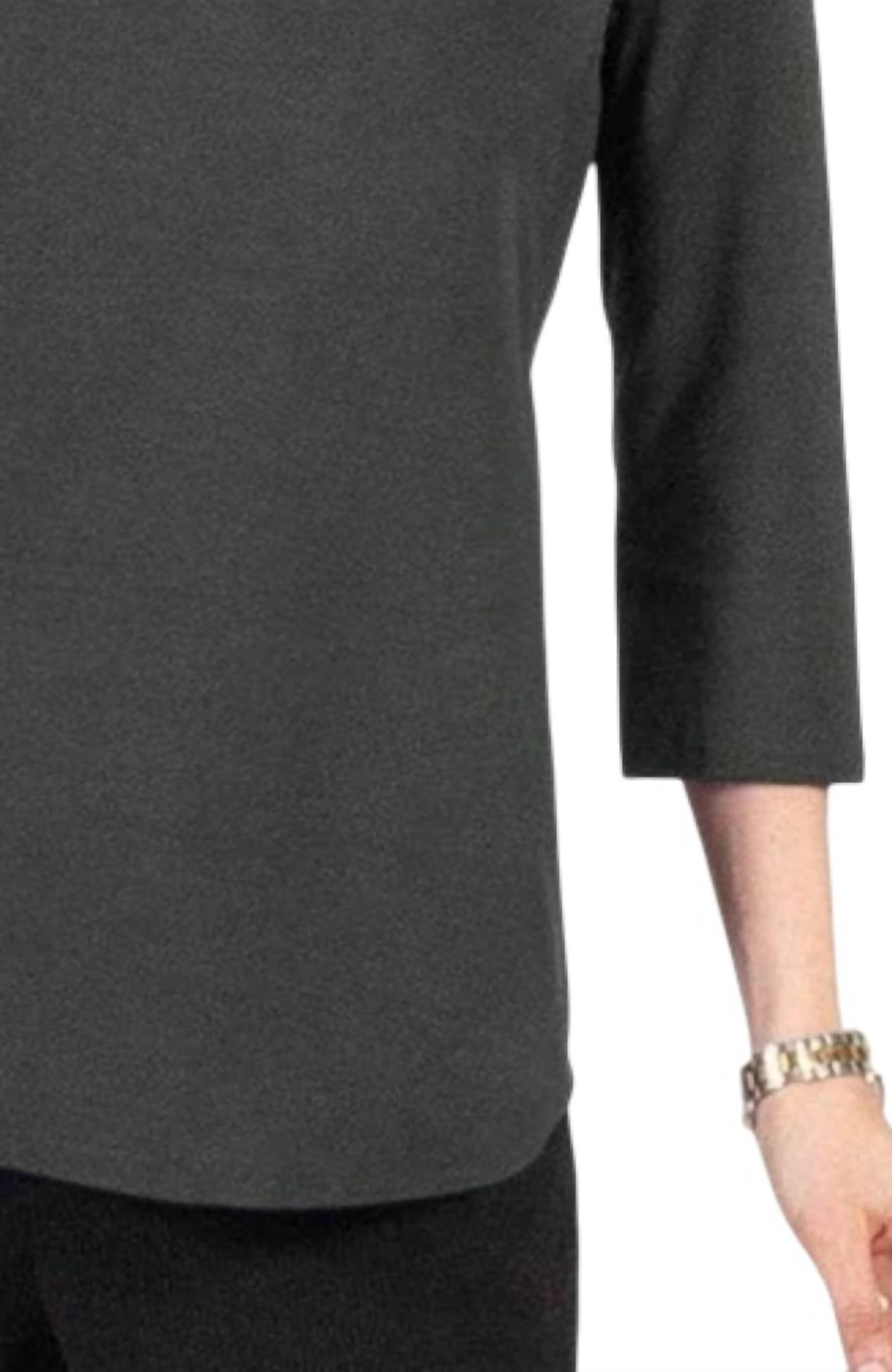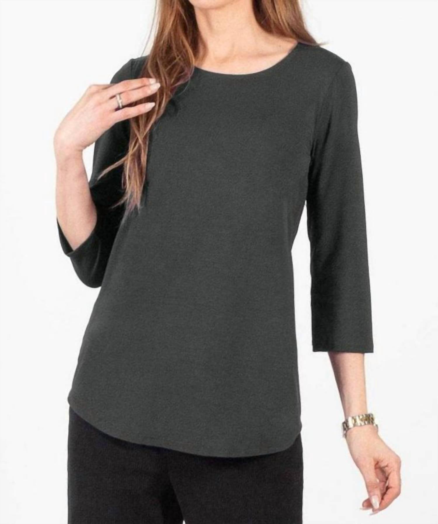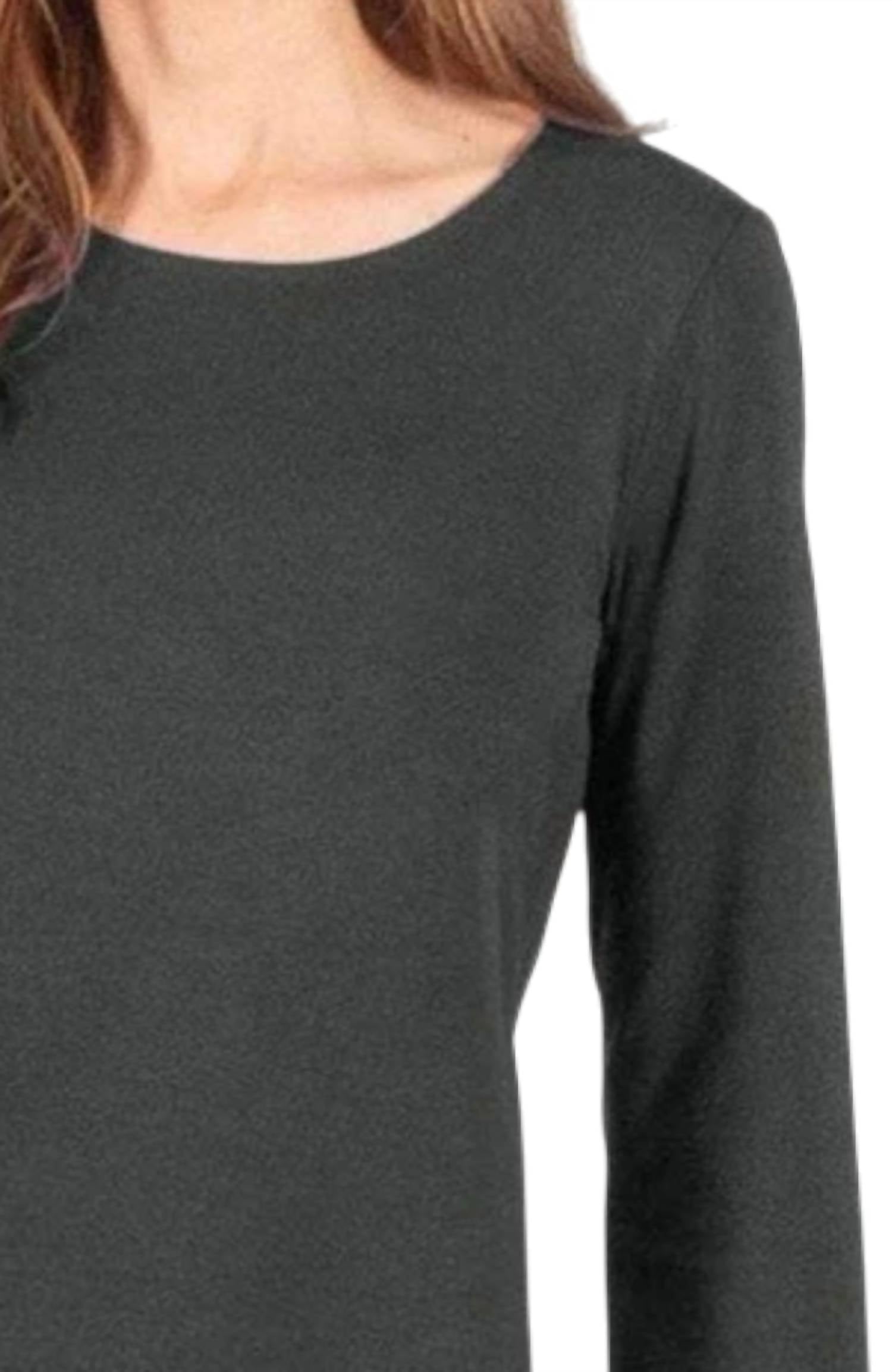A long sleeve top you can wear with denim, skirts, well... just about anything! Discover the Pure Essence Charcoal Tee by PURE essence, a stylish addition to your wardrobe with its three-quarter sleeves and crewneck design. Made with 67% Rayon of Bamboo, 28% Cotton, and 5% Spandex, this top promises a breathable and eco-friendly experience. With its solid pattern and pull-on closure, it's perfect for travel and occasions like New Year's Eve. Proudly made in Canada, this piece excels in durability and keeping you comfortable in both hot and cold climates.