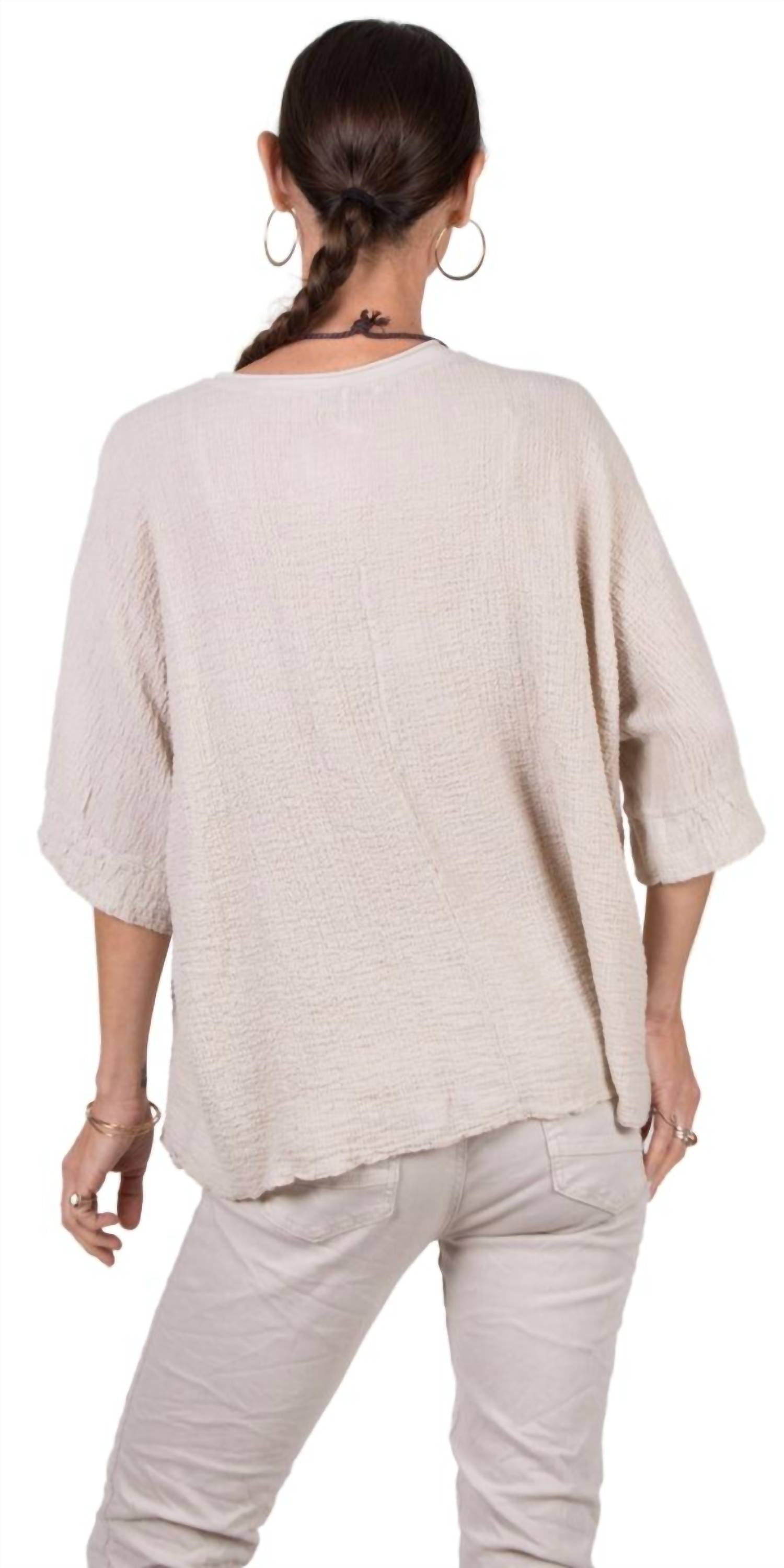 Great fit, cute design, soft fabric. You'll love everything about this long sleeve tee. Elevate your summer wardrobe with the Rina Waffle Cotton Top by GIGI MODA in a classic beige hue. Designed with three-quarter sleeves and a round neck, this solid top offers a lightweight and breathable fit, perfect for warm weather outings. Made in Italy from 97% cotton and 3% elastic, it promises a comfortable wear with a stylish pull-on closure. Effortless to maintain, simply machine wash and tumble dry to keep it fresh. One size fits all, with the model standing at 5'7".
