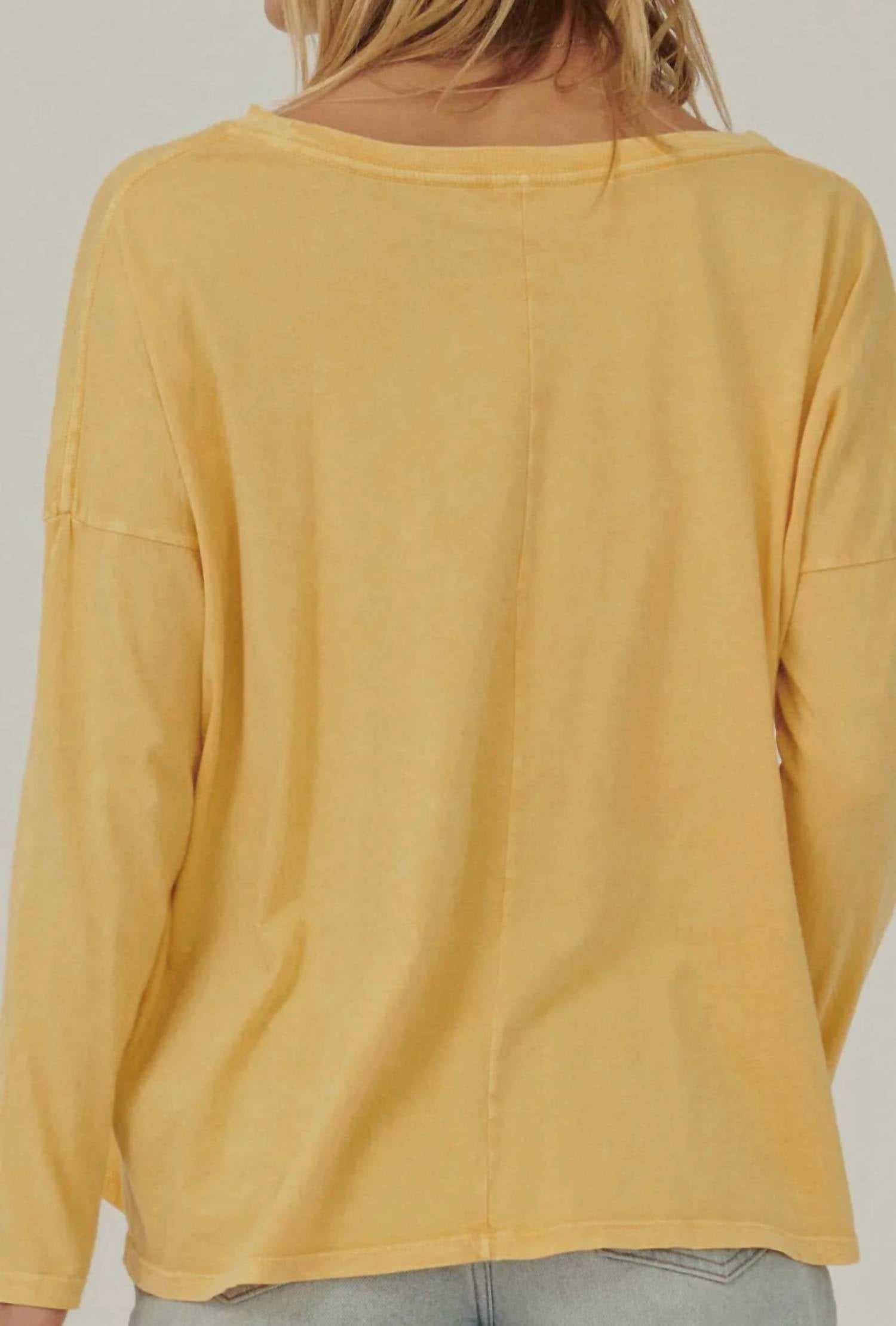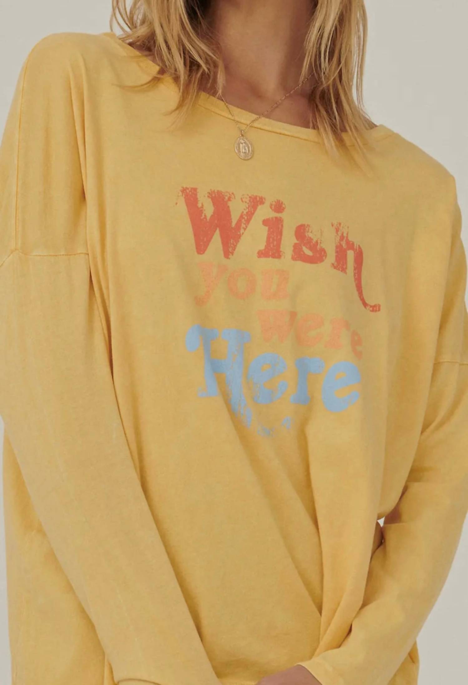 This mineral-washed graphic t-shirt features a vintage-style "Wish You Were Here" text graphic print. It has long sleeves, a drop shoulder, a round neckline, and a center back seam. The loose fit is made from 100% cotton and imported.